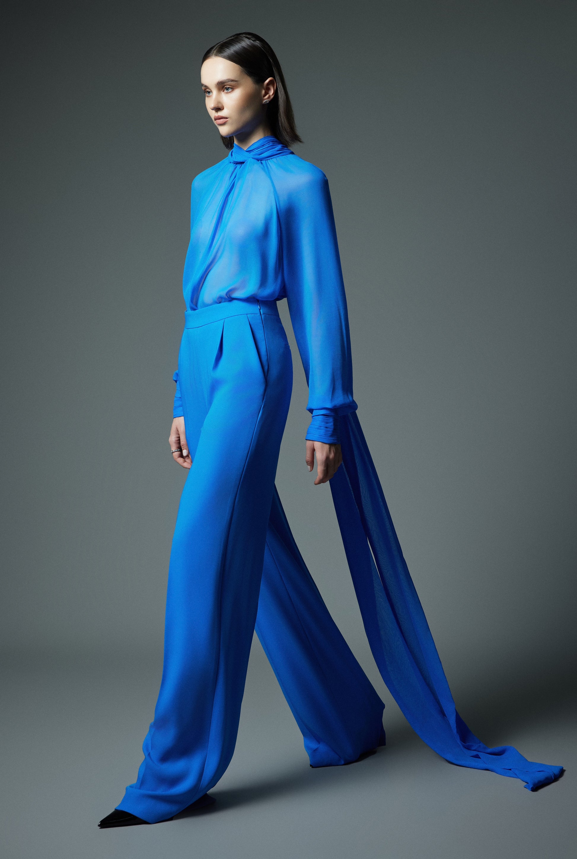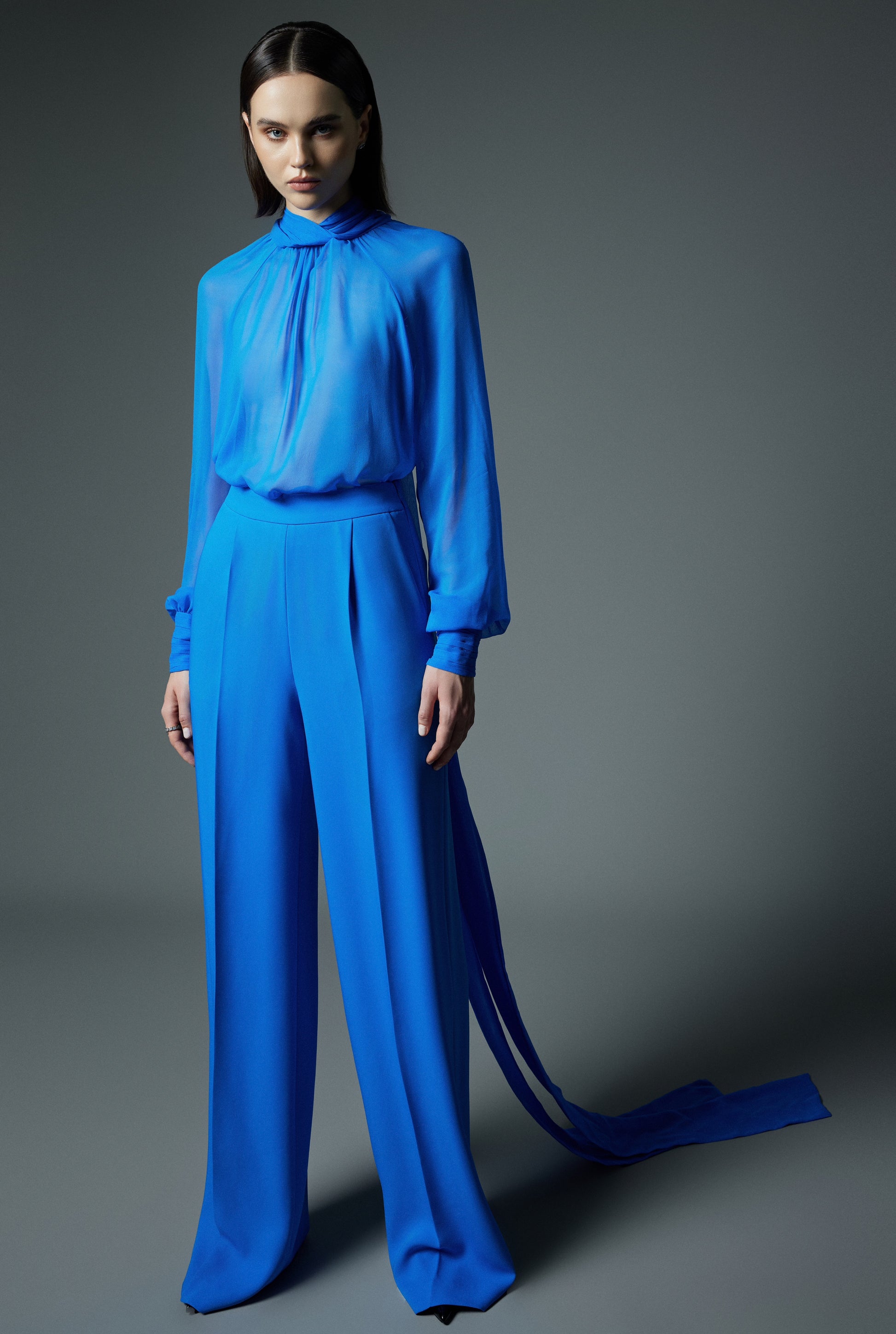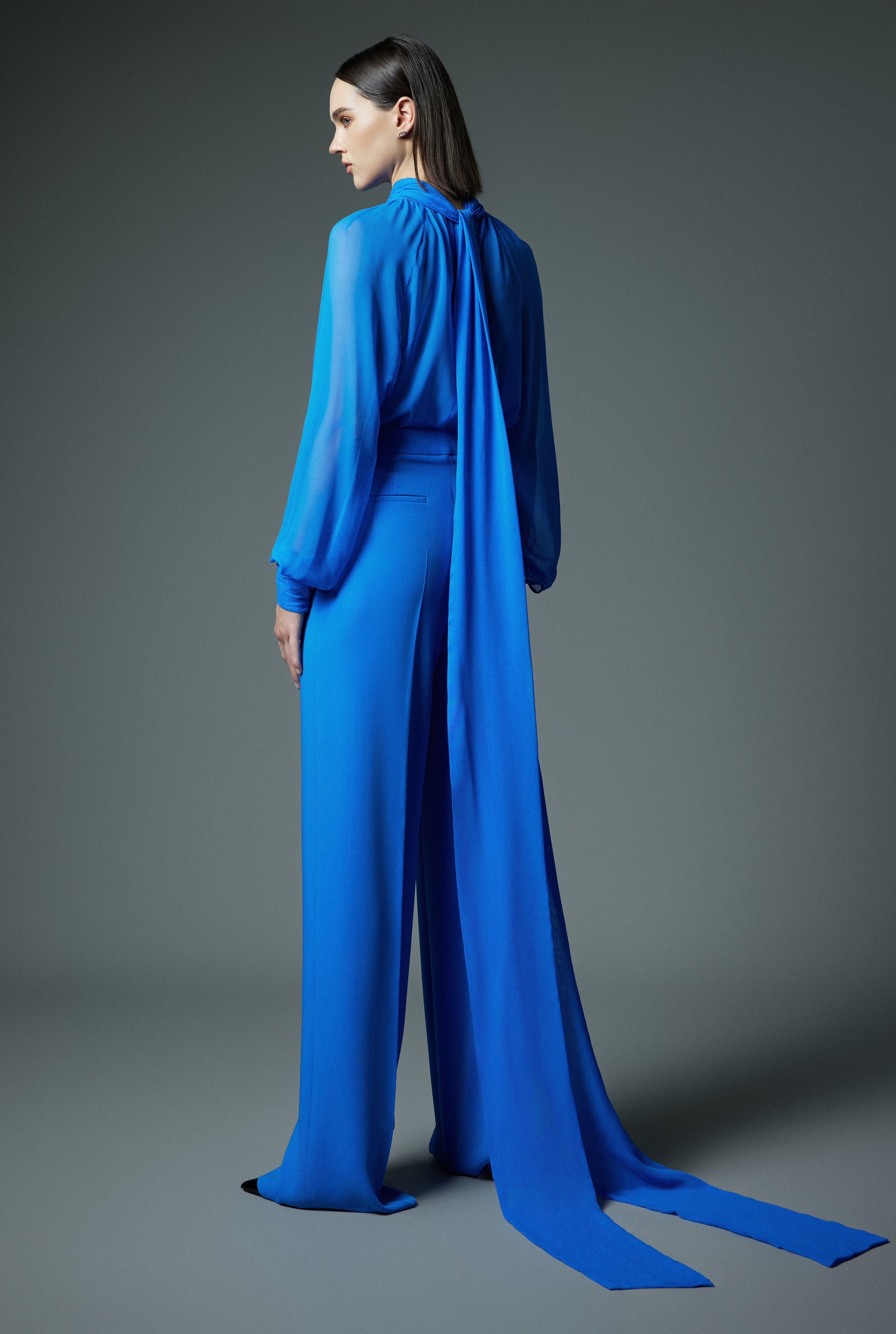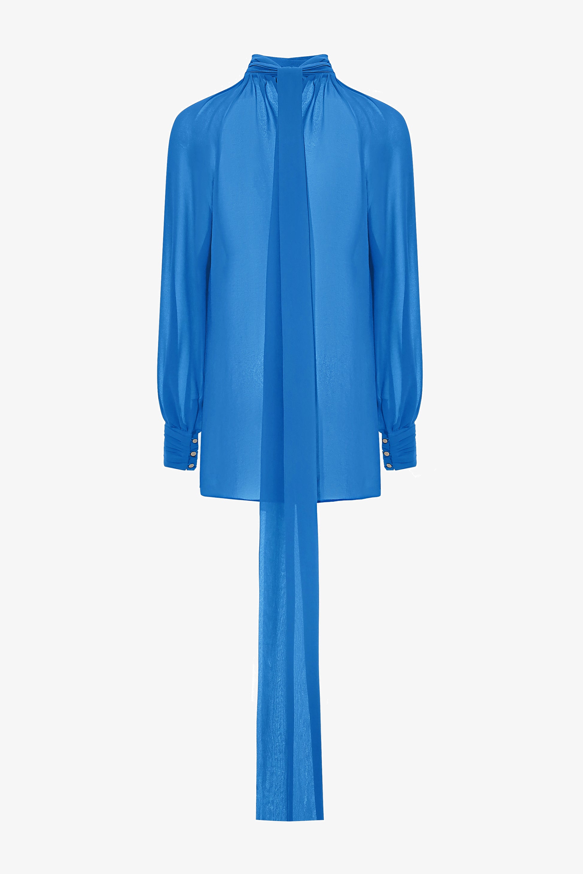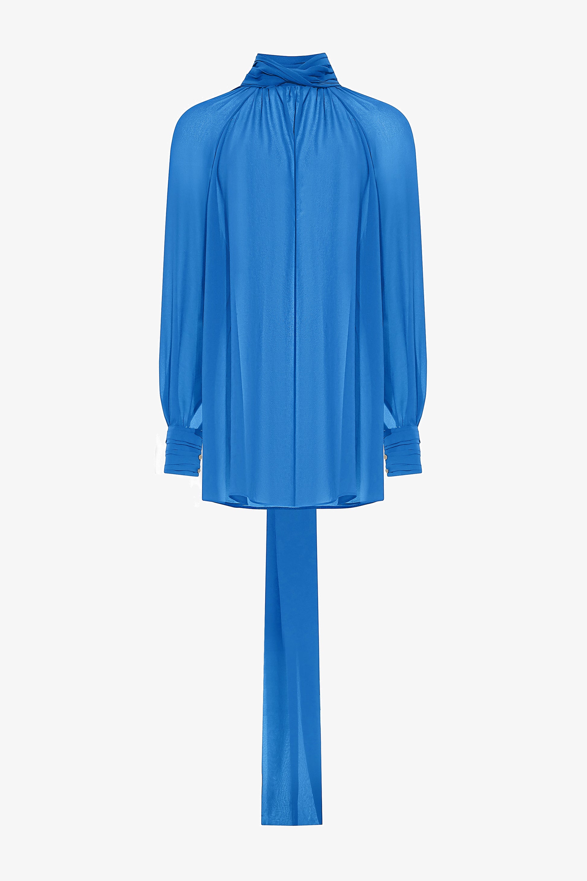 A loose-fitting shirt with long sleeves gathered at the cuffs, raglan shoulders with pleats, and a crossover V-neck. It includes a hook fastening at the back of the neck.