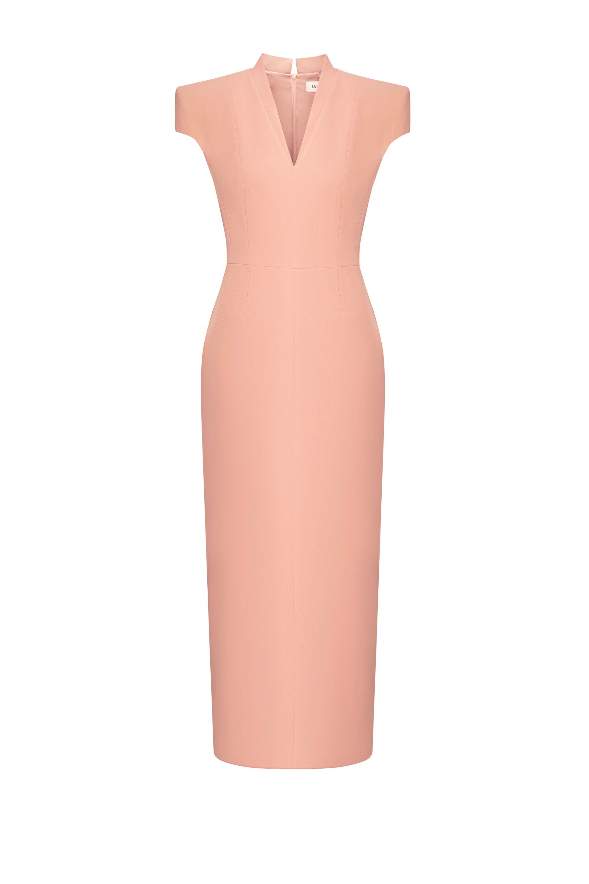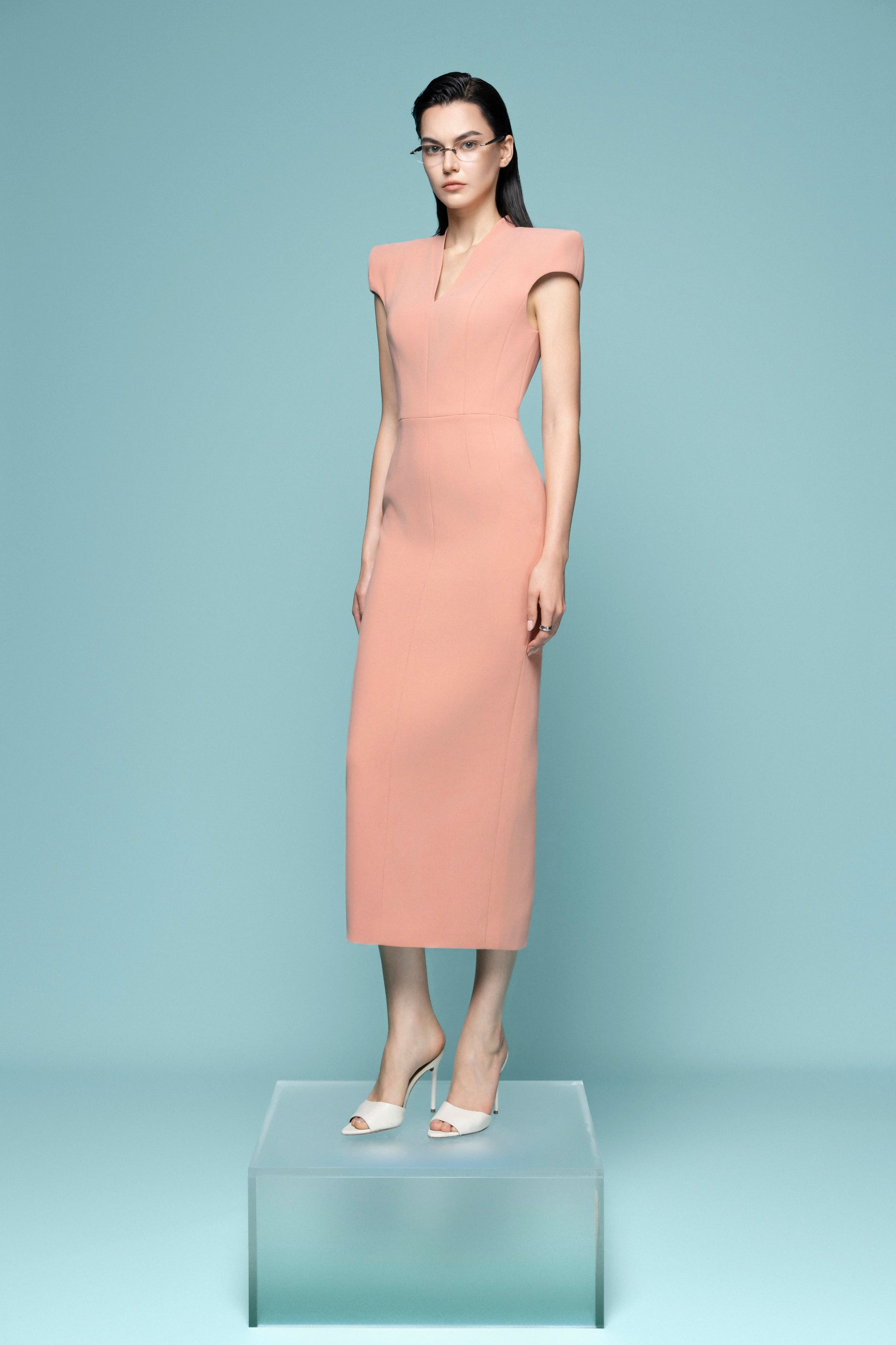 Calf-length pencil dress with structured shoulders and rounded sleeves. Features mid-length darts from side and shoulder to hip, with a defined waist and center-front seam from neckline to hem. V-neckline crafted from matching fabric, contoured to sit snugly along the collar base. Back bodice mirrors the front with concealed zipper and identical dart placement for a tailored finish.