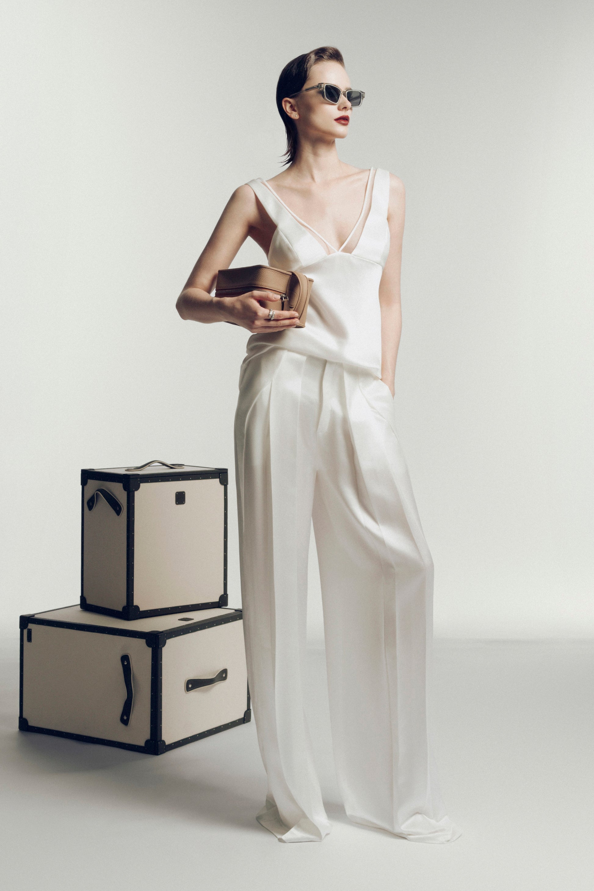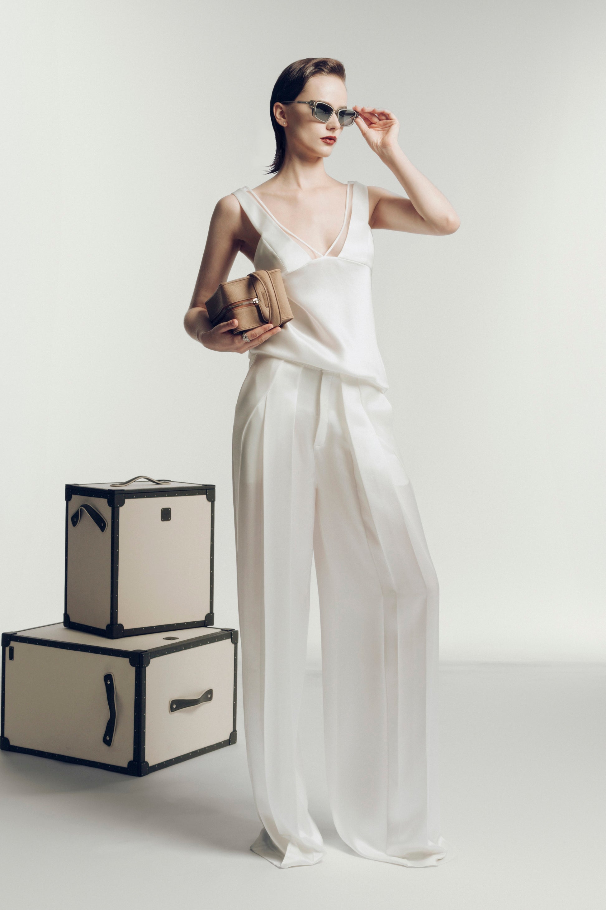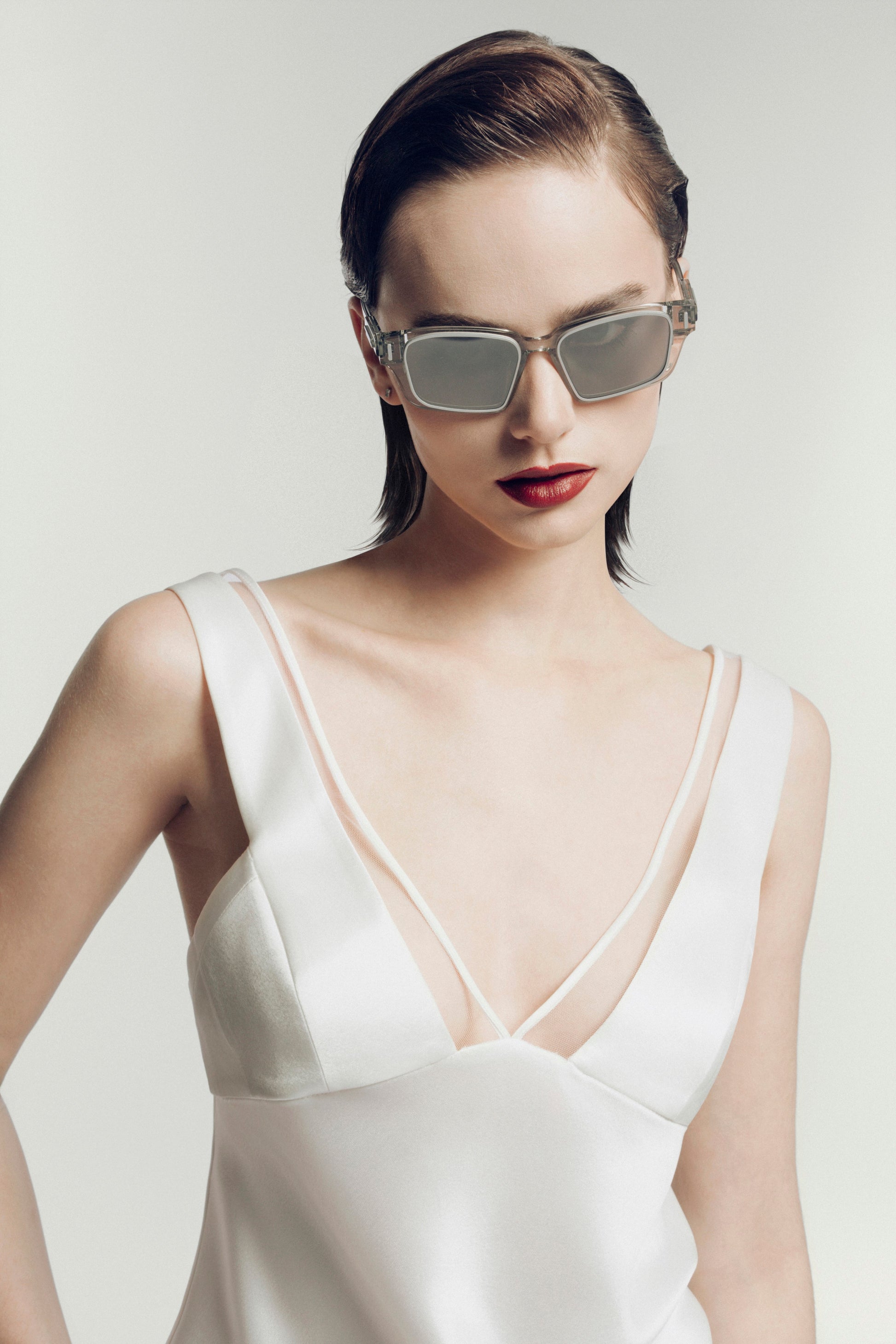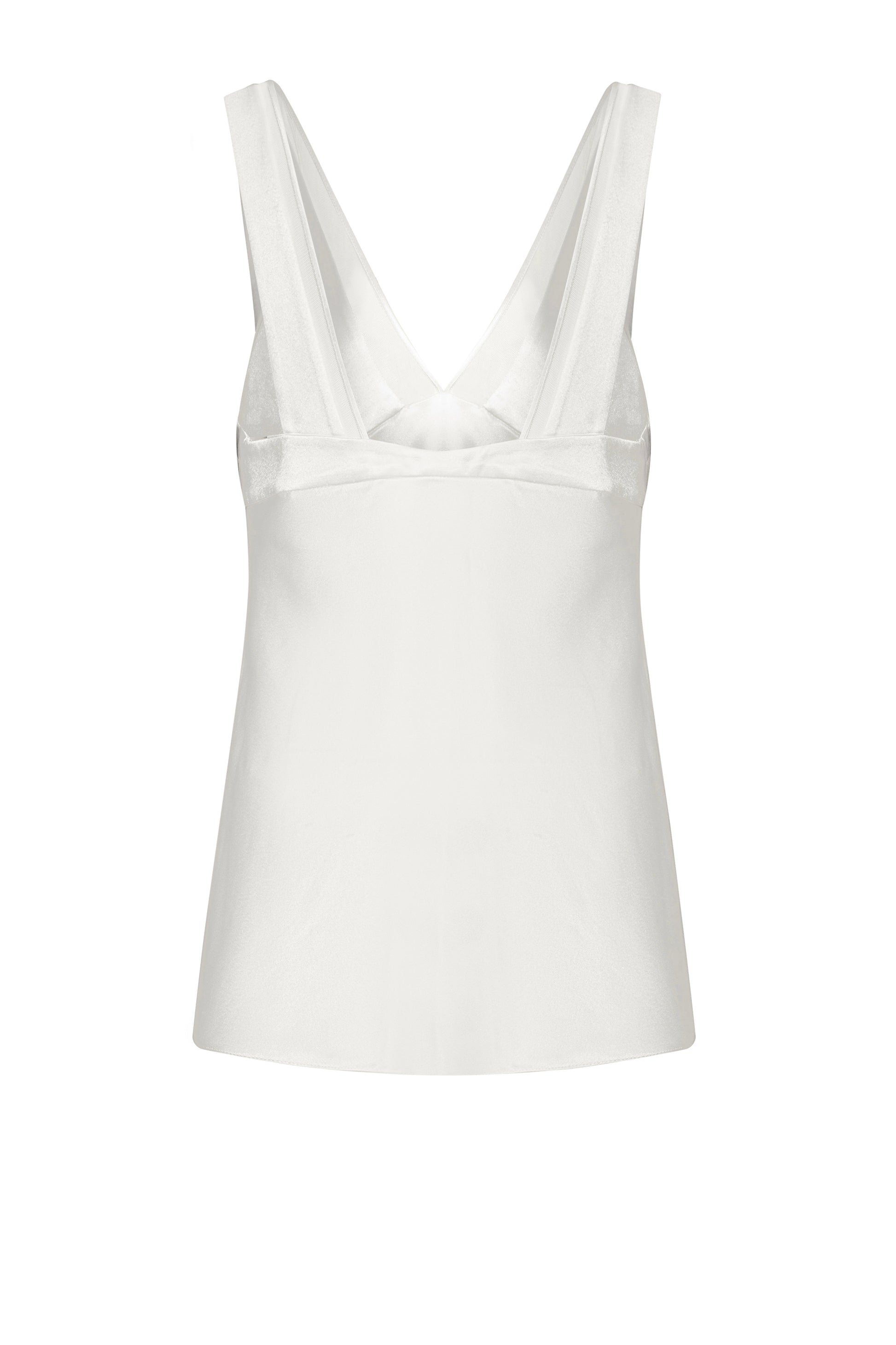 Relaxed-fit V-neck camisole with structured bust cups made from two-panel construction. Side panels are angled toward the back, creating a sculpted, geometric effect. Straps are crafted from mesh and the neckline is bound with satin for a refined finish. The back mirrors the front strap detailing. Lower bodice is subtly shaped at the waist and cut on the bias for a gentle, body-skimming fit.