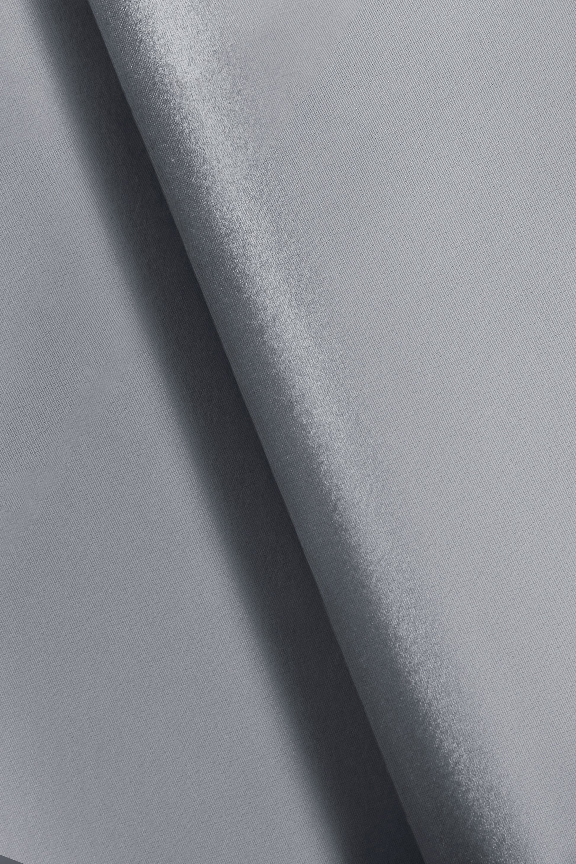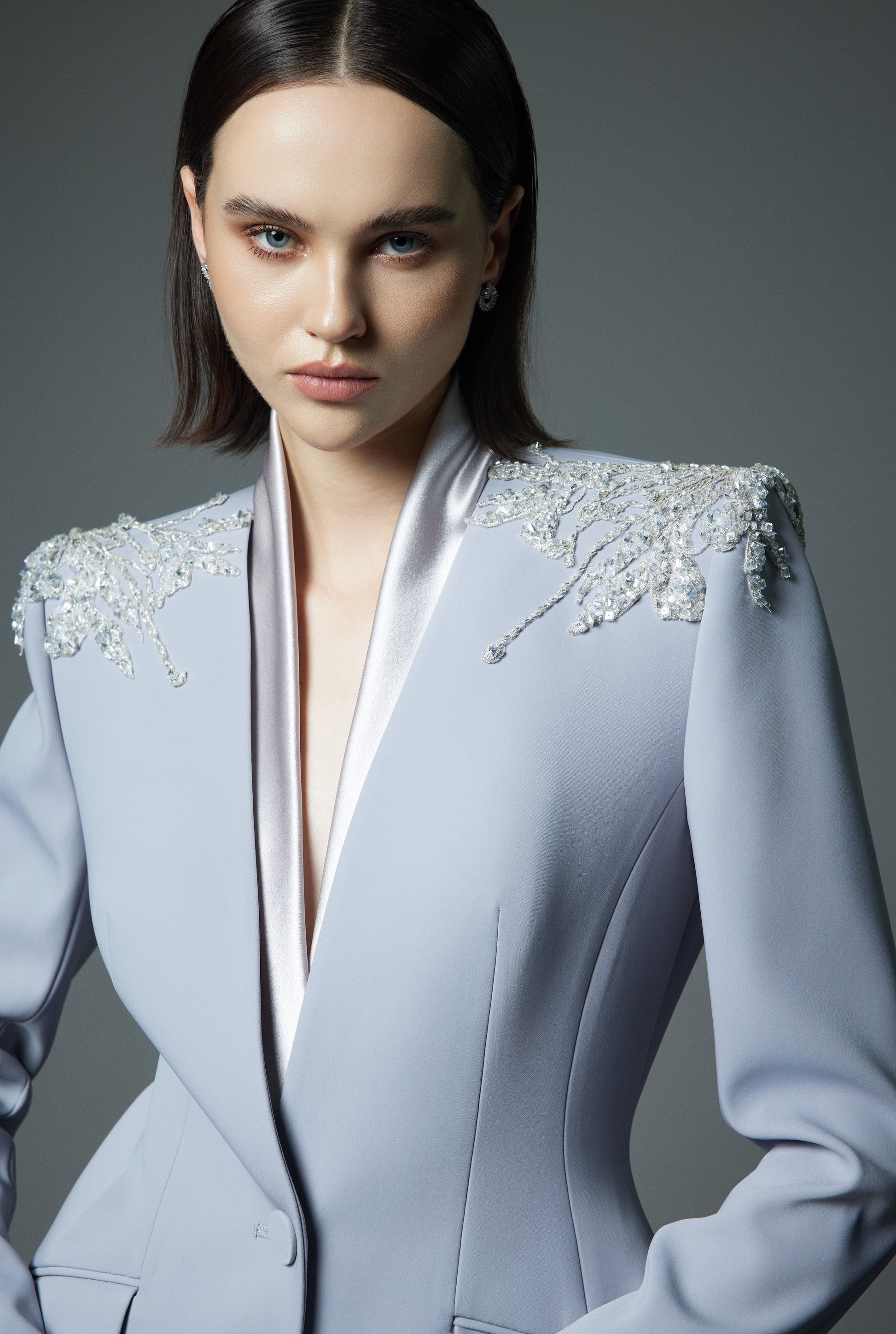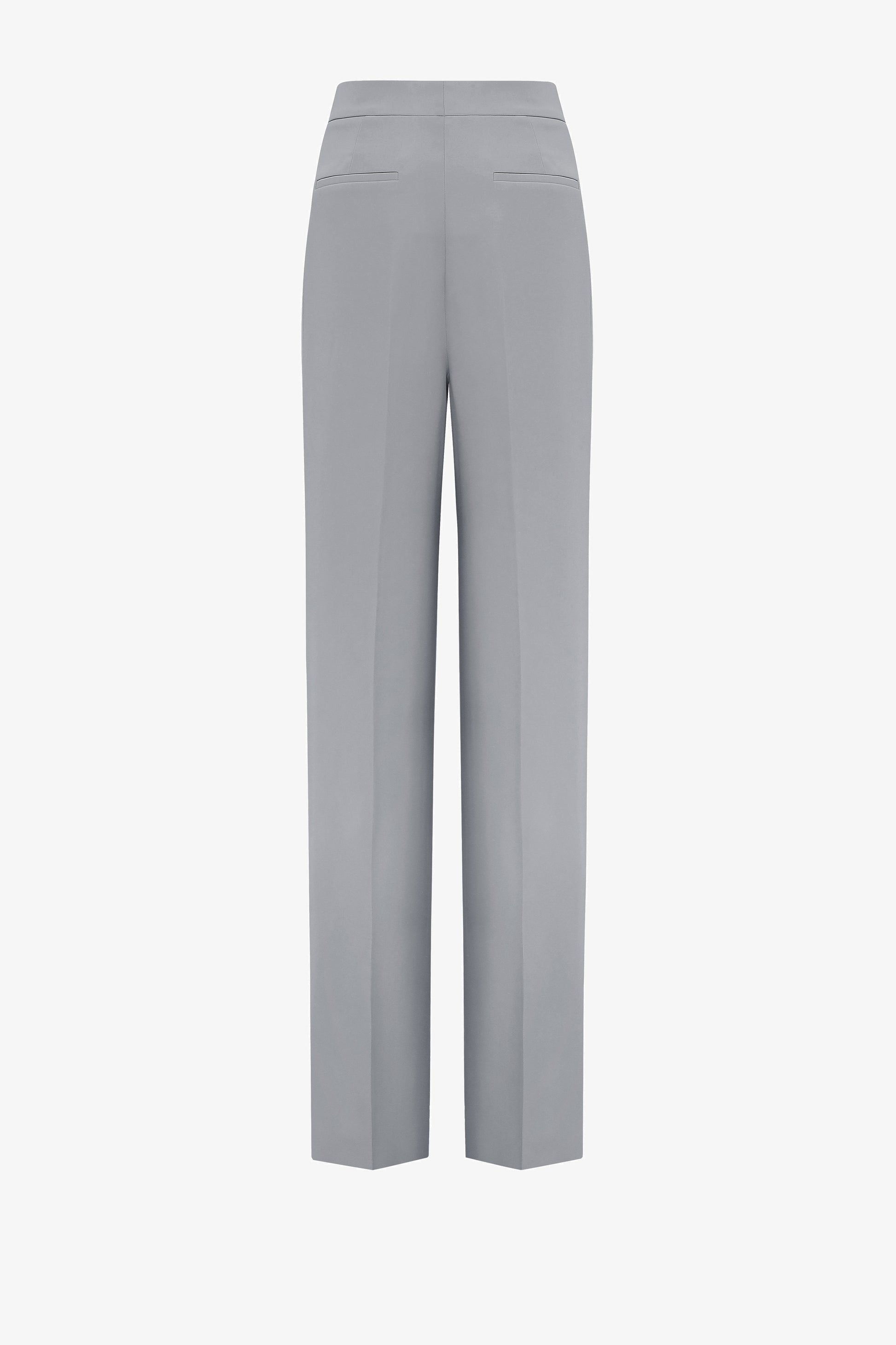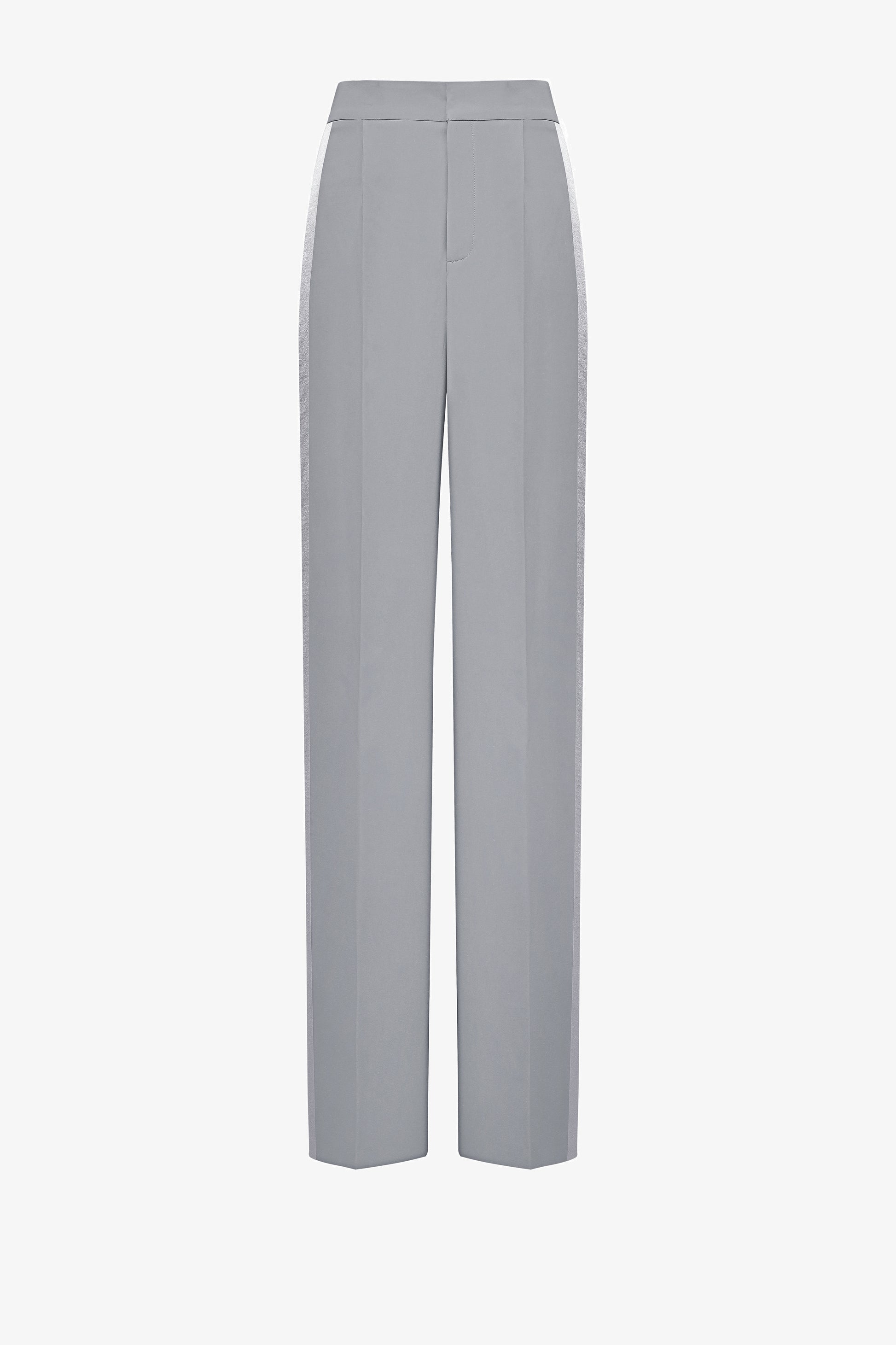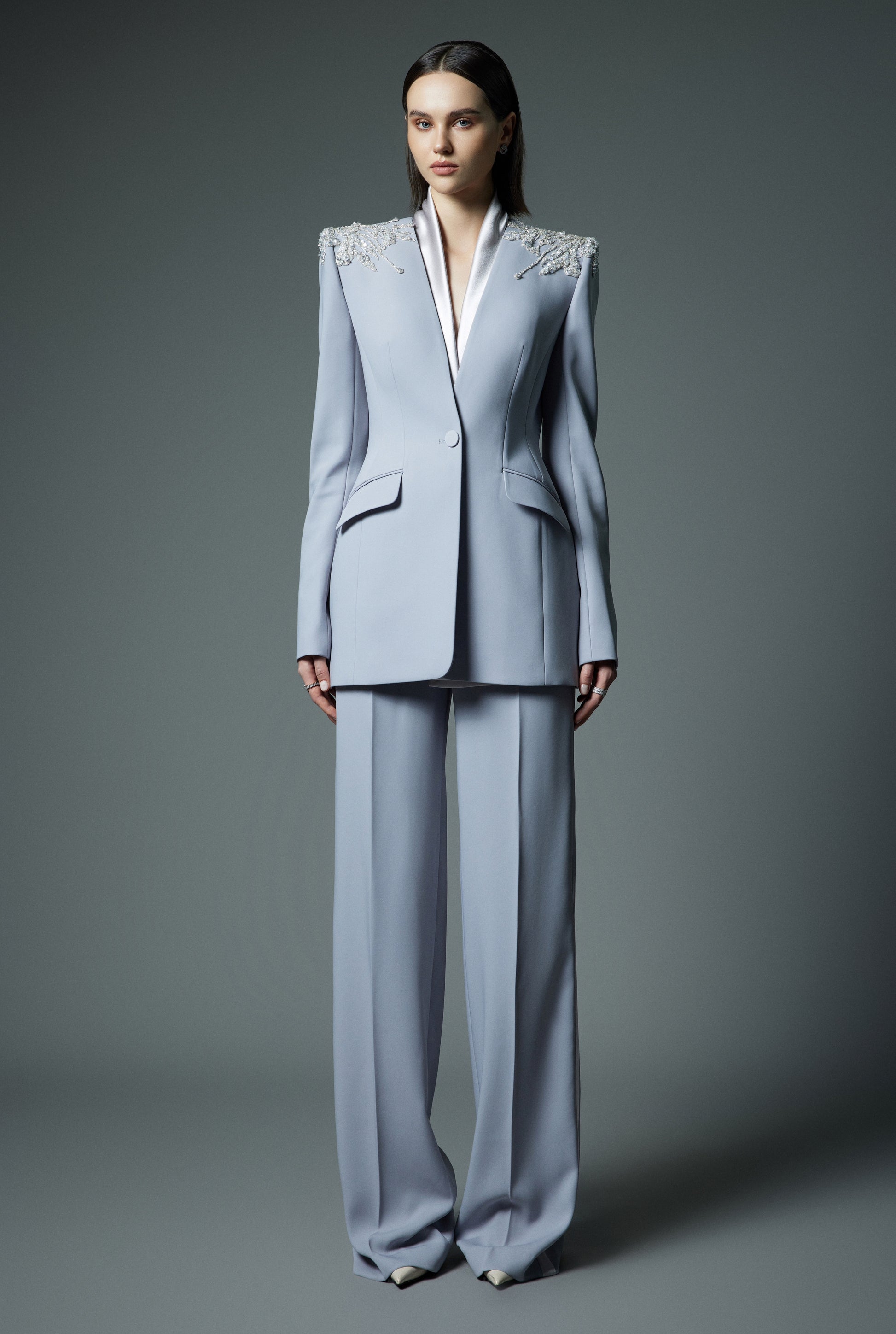 Wide-leg trousers: Feature a front pleat and a satin strip running from the waistband to the hem along the side seams. The trousers have two welt pockets at the back, a 29-inch leg opening, and are long enough to cover shoes. They also have a side zipper on the left.