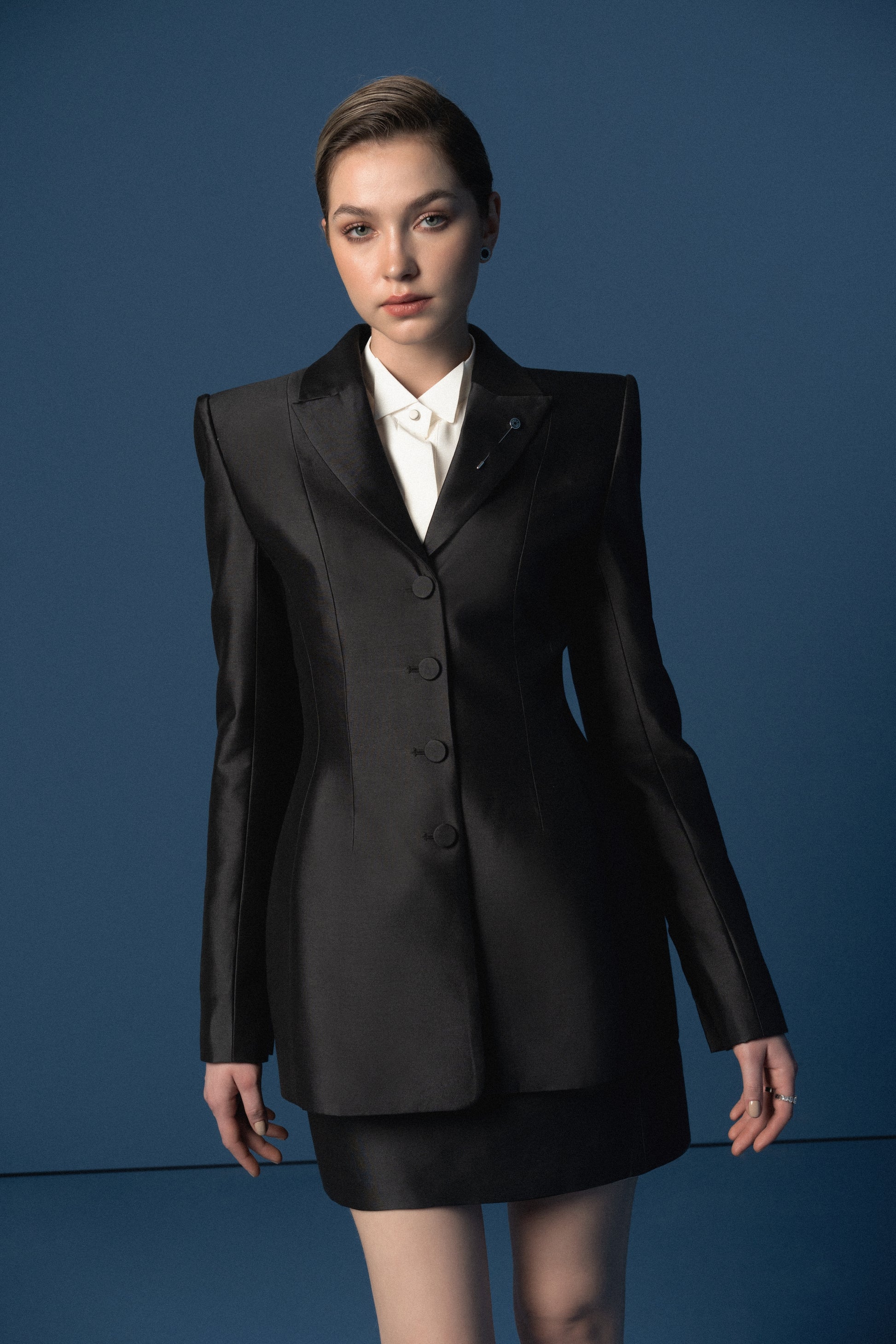 LEKIEU uses the method of building a body structure that is commensurate with the calculation of array division to create a thick, standing form for the jacket. With the crisp black tone that Taffeta material brings, LEKIEU woman confidently strides in power and class.