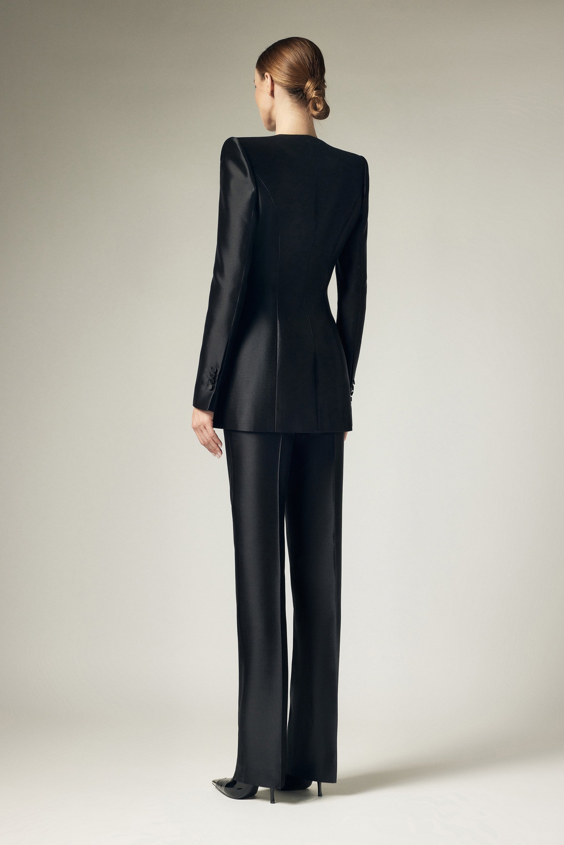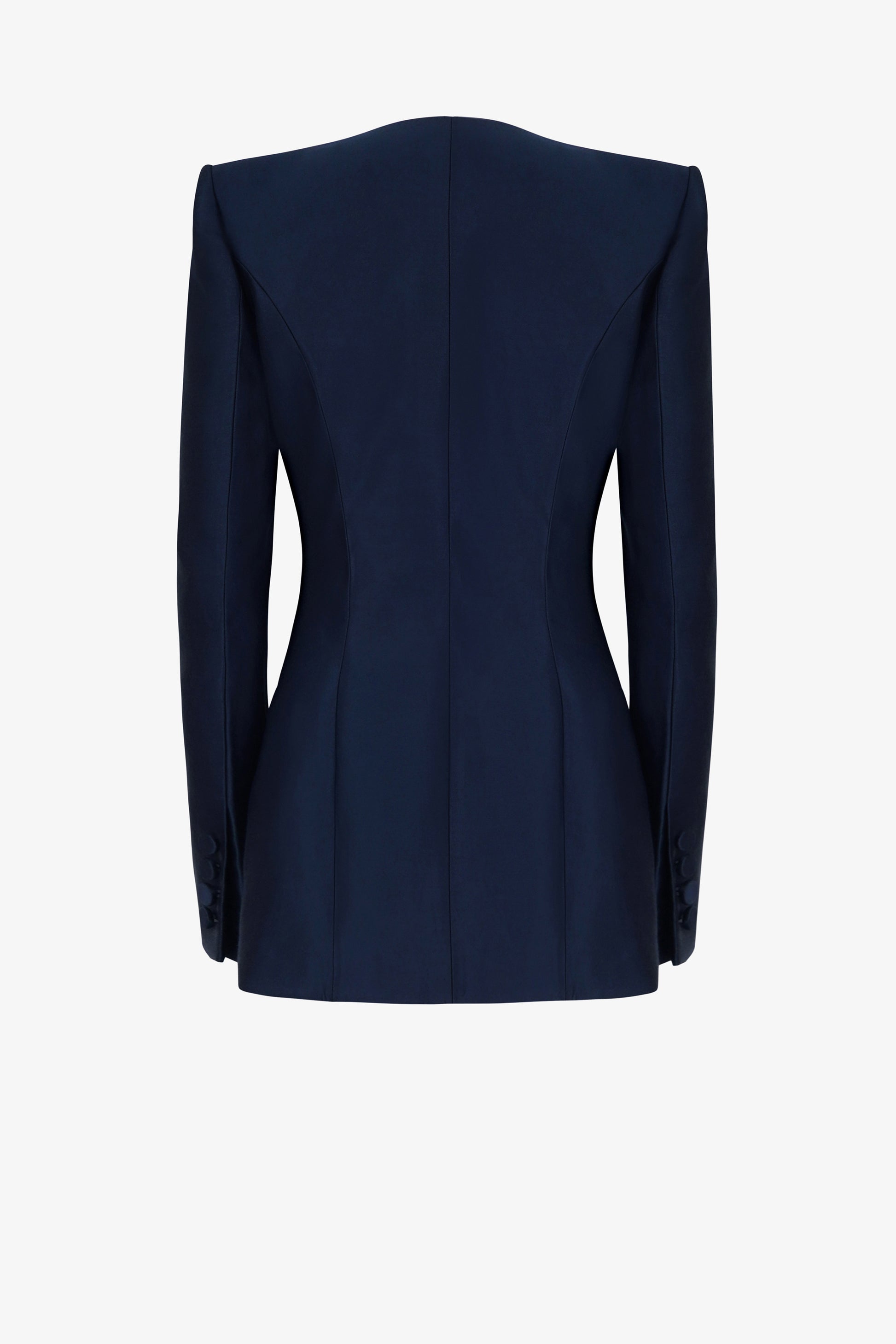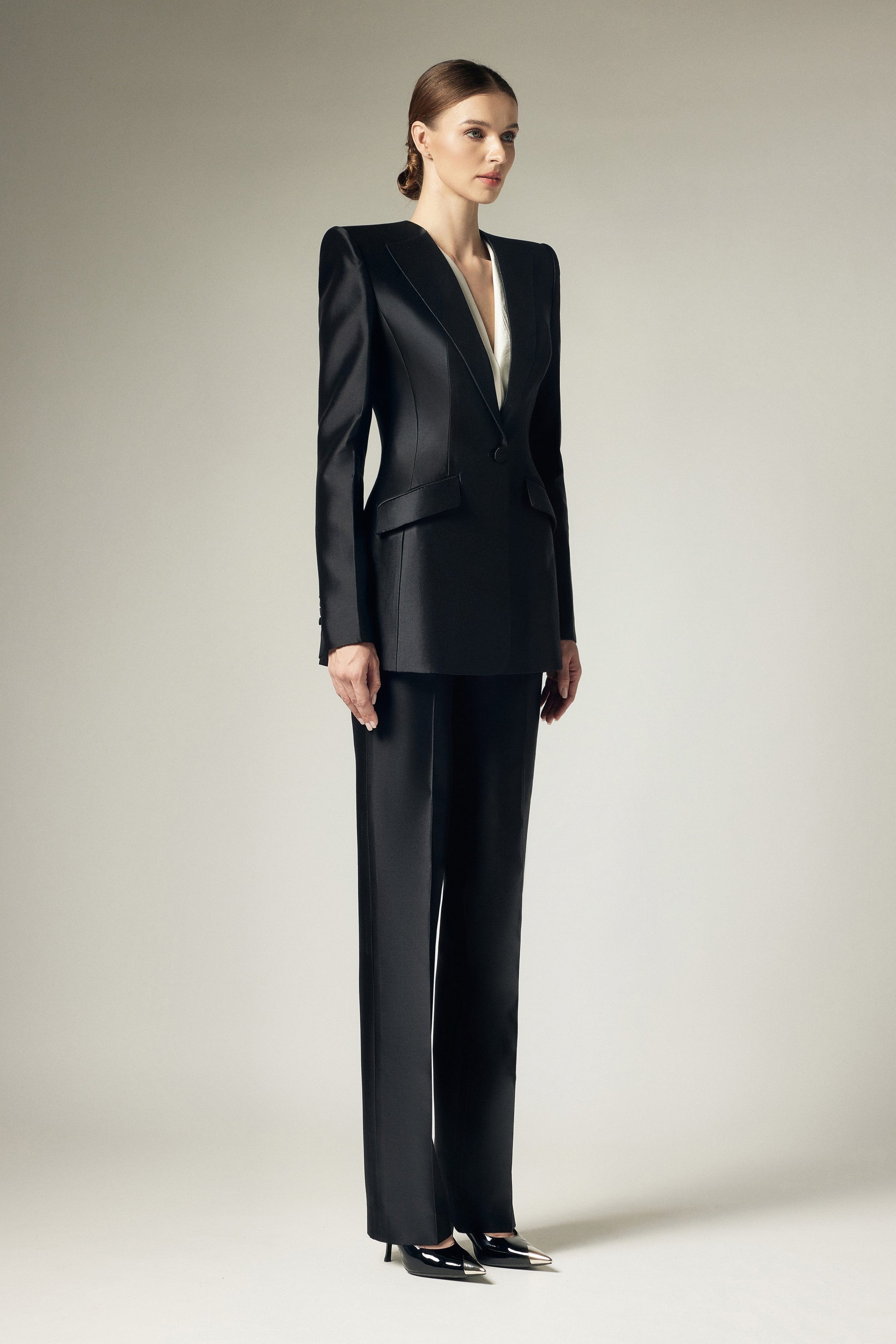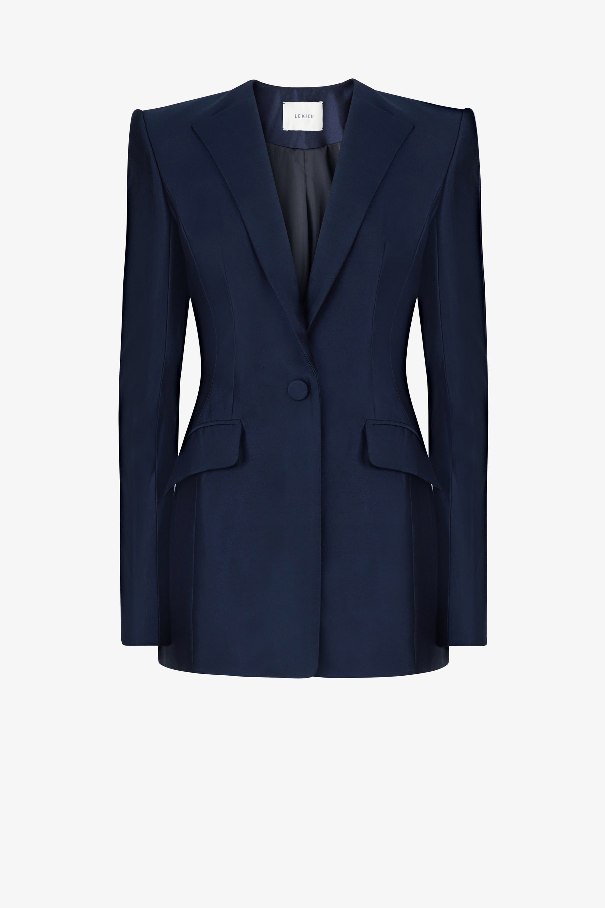 The unique design features a flattering waist, flared hip, and stylish horizontal collar. The sleeves end above the wrist with fabric-covered buttons. Functional flap pockets and a chic flared waistline complete the look, making it perfect for both formal events and everyday sophistication.