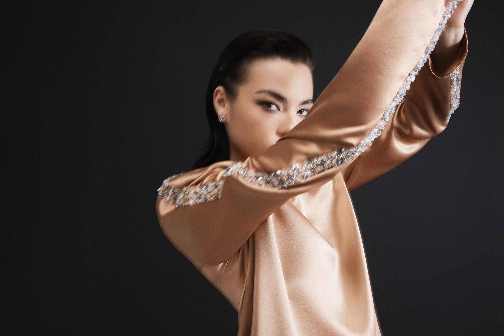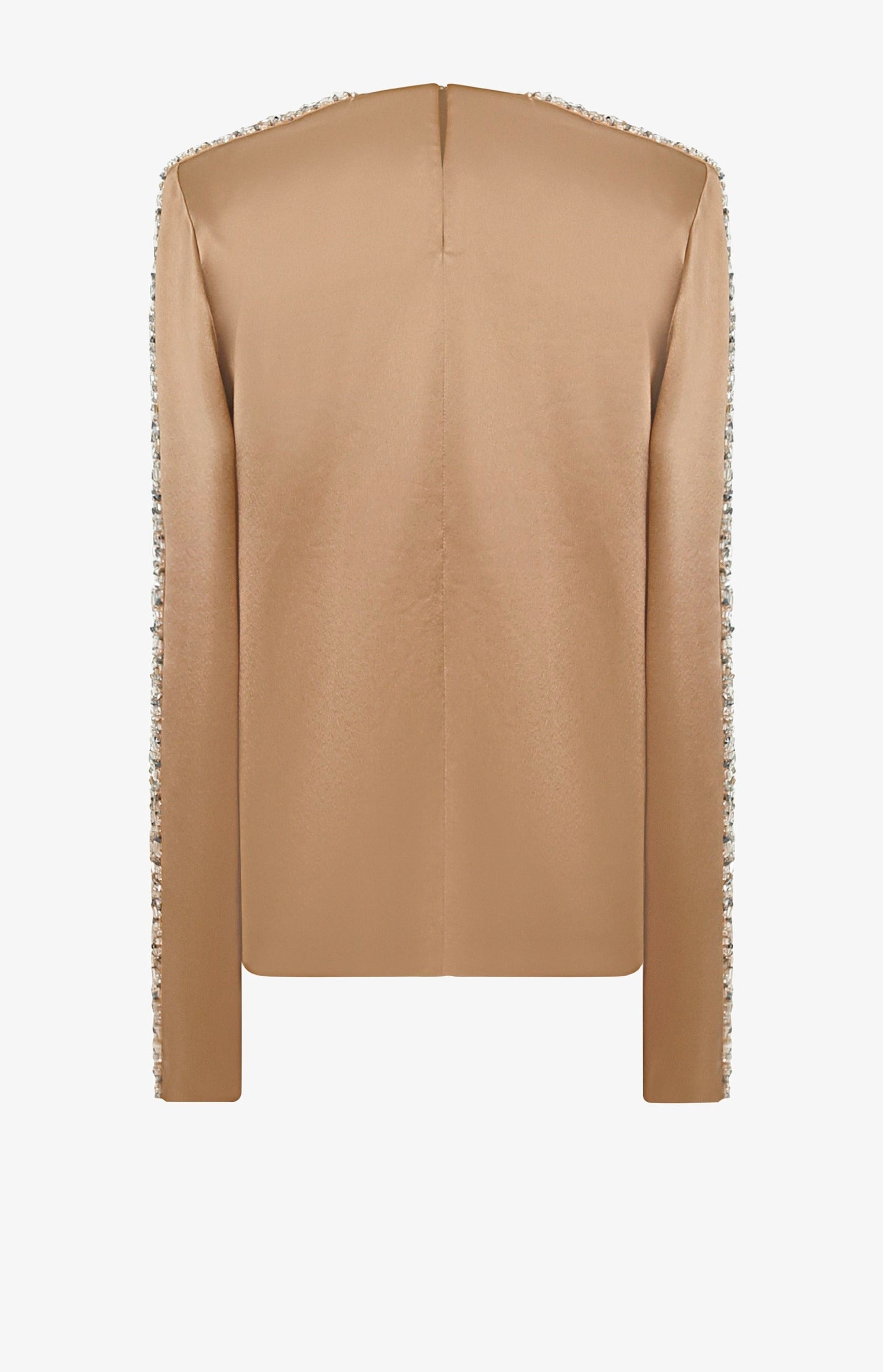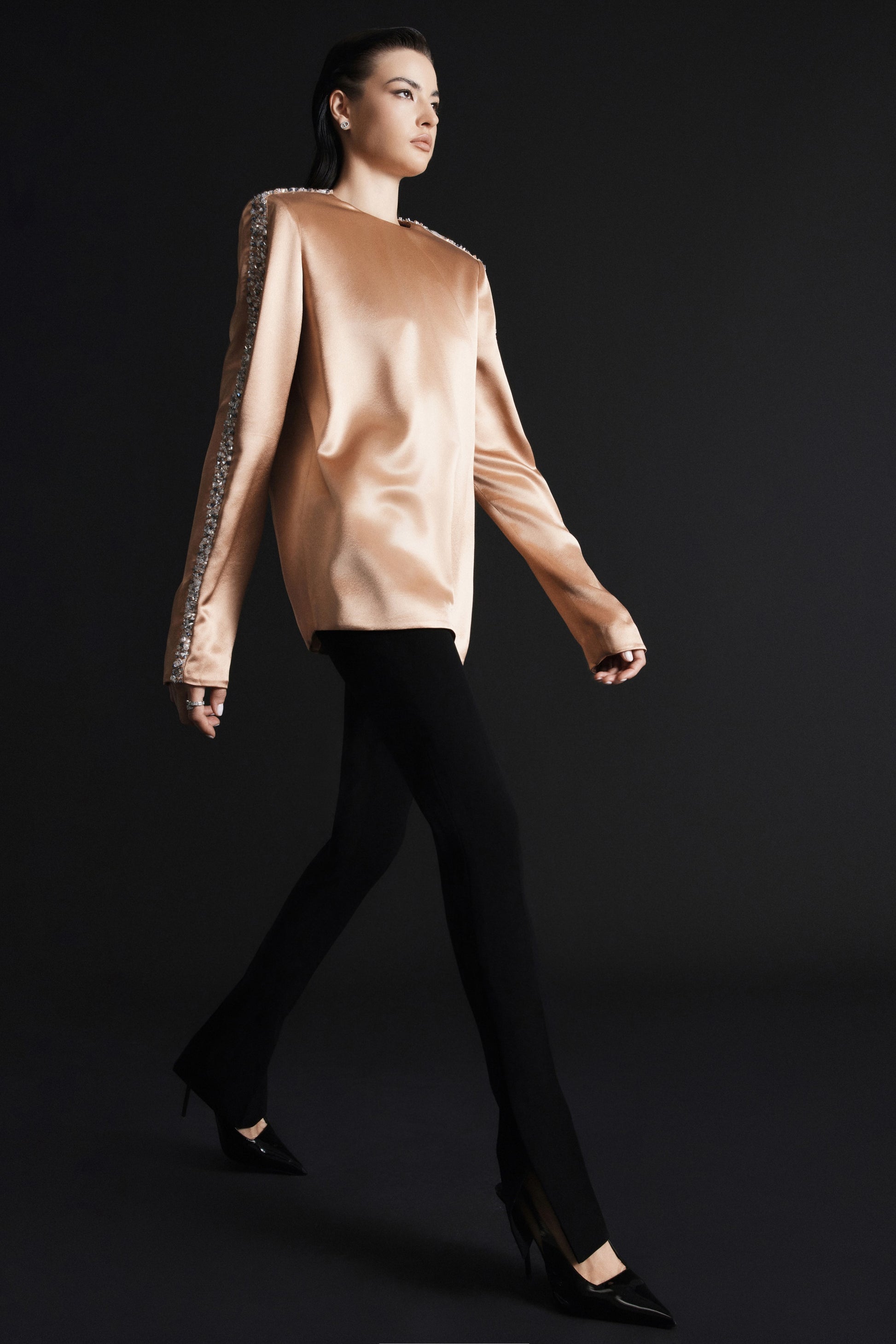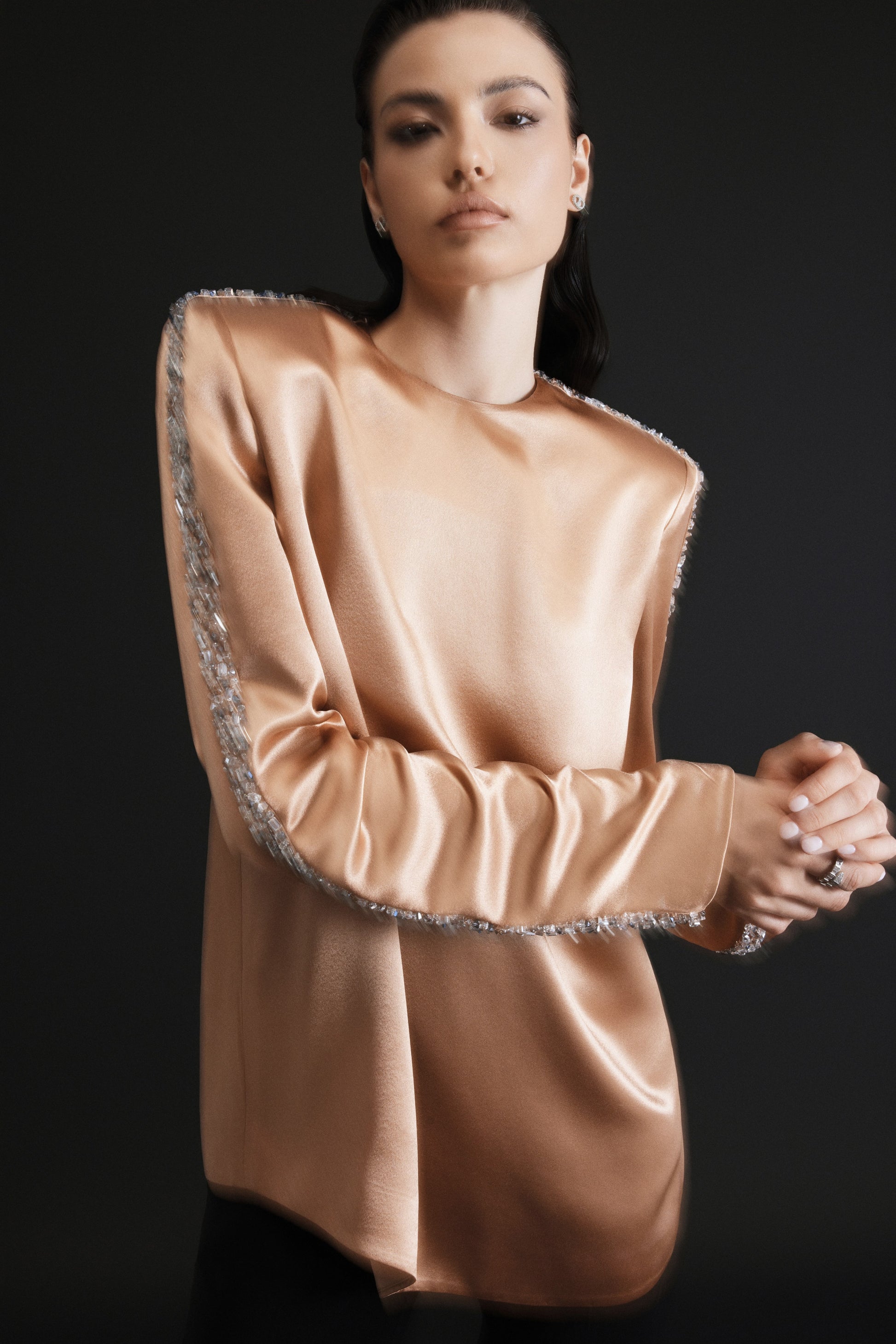 - The Top is adorned with high-end crystal and stone-setting technique on the strip that run from neckline to the cuff of the .
