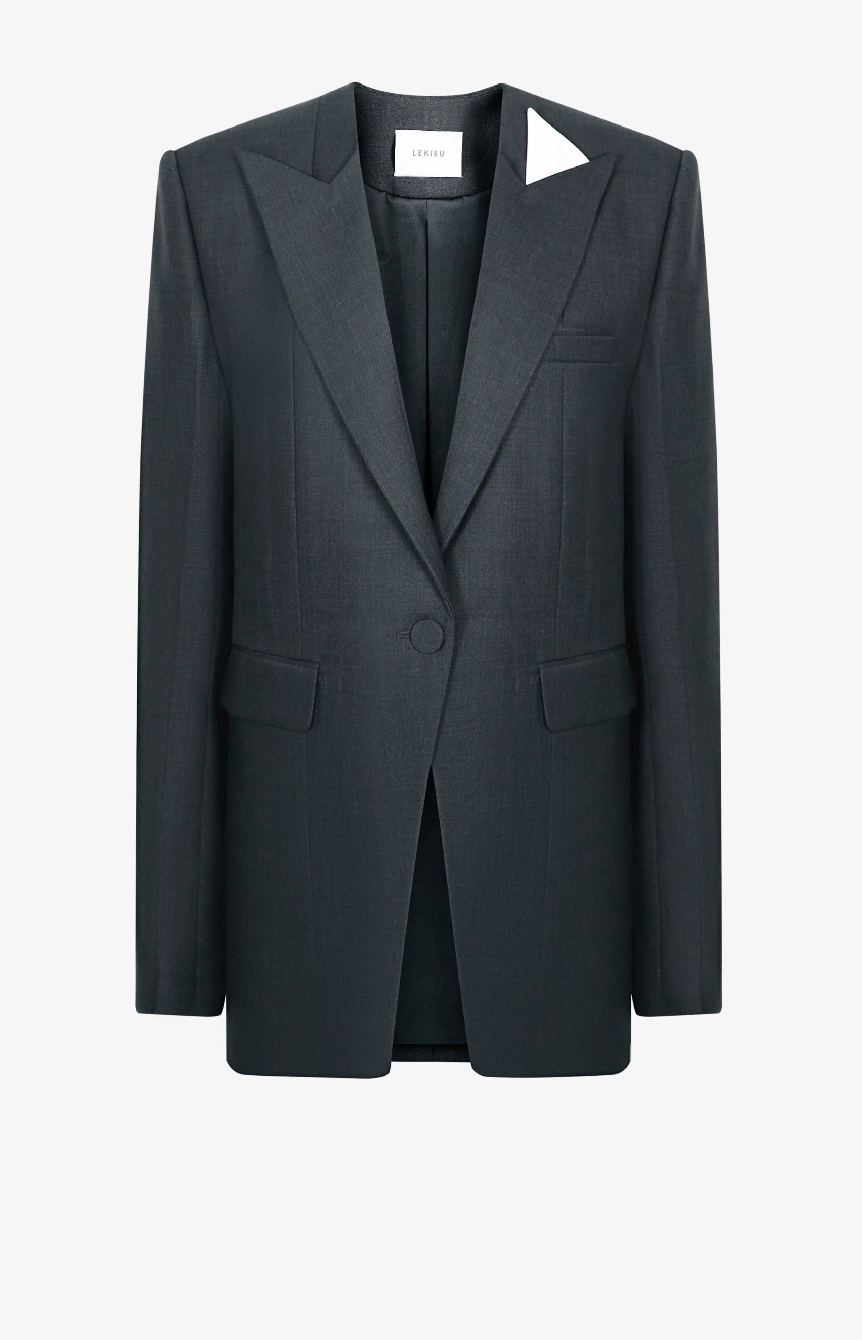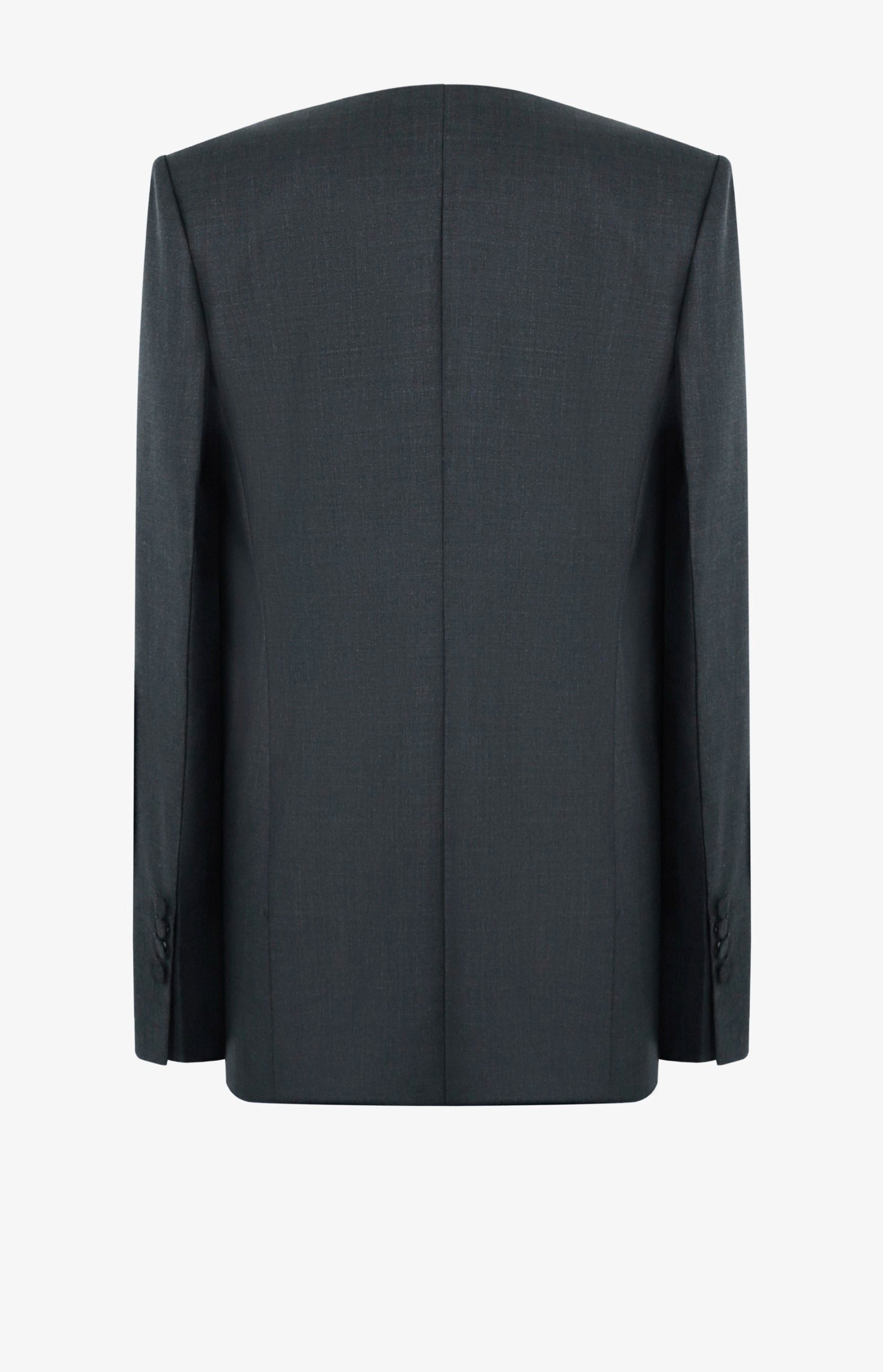 The blazer is collarless, featuring a modern peak collar design with triangular white detail on the left lapel.