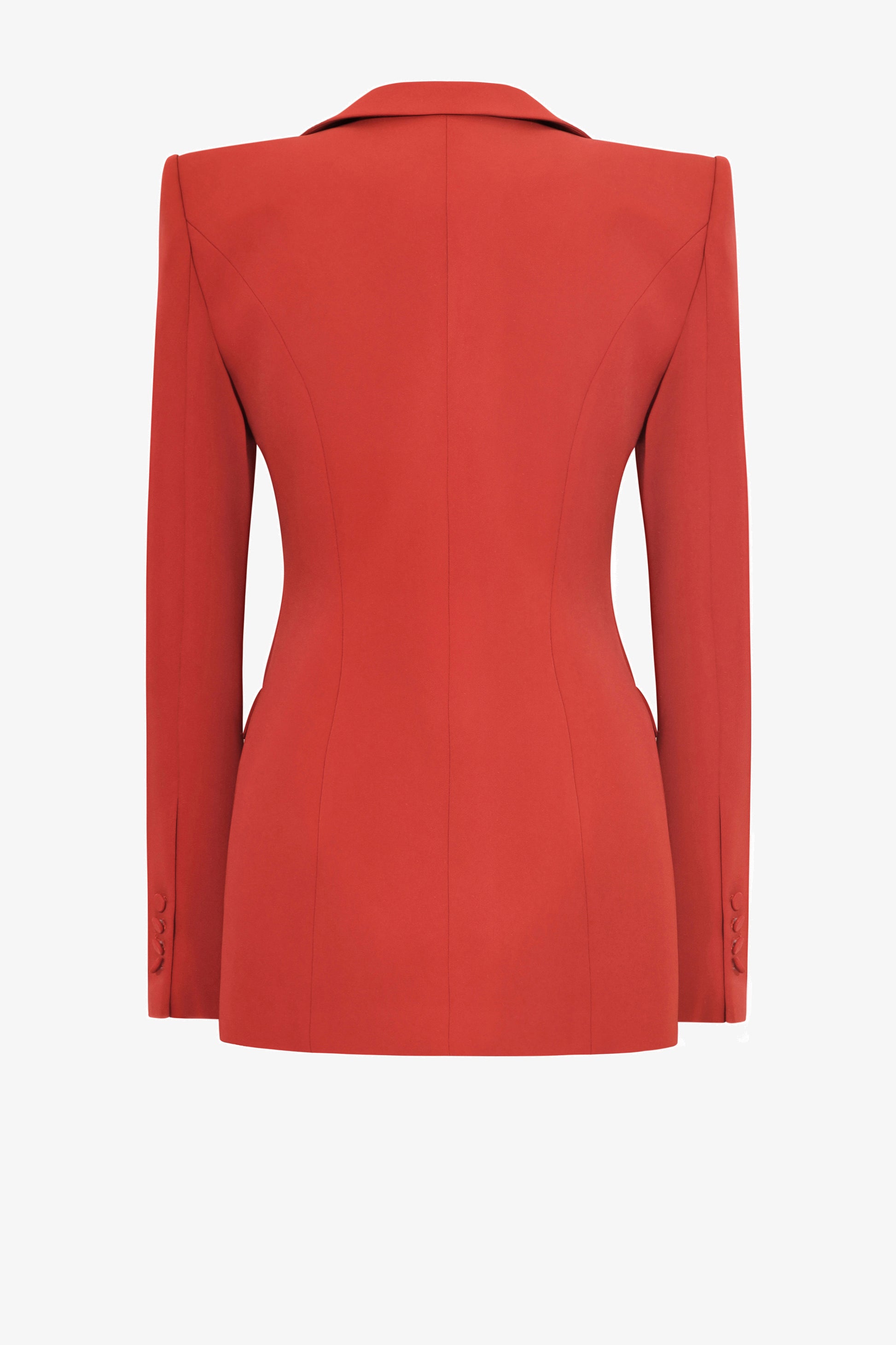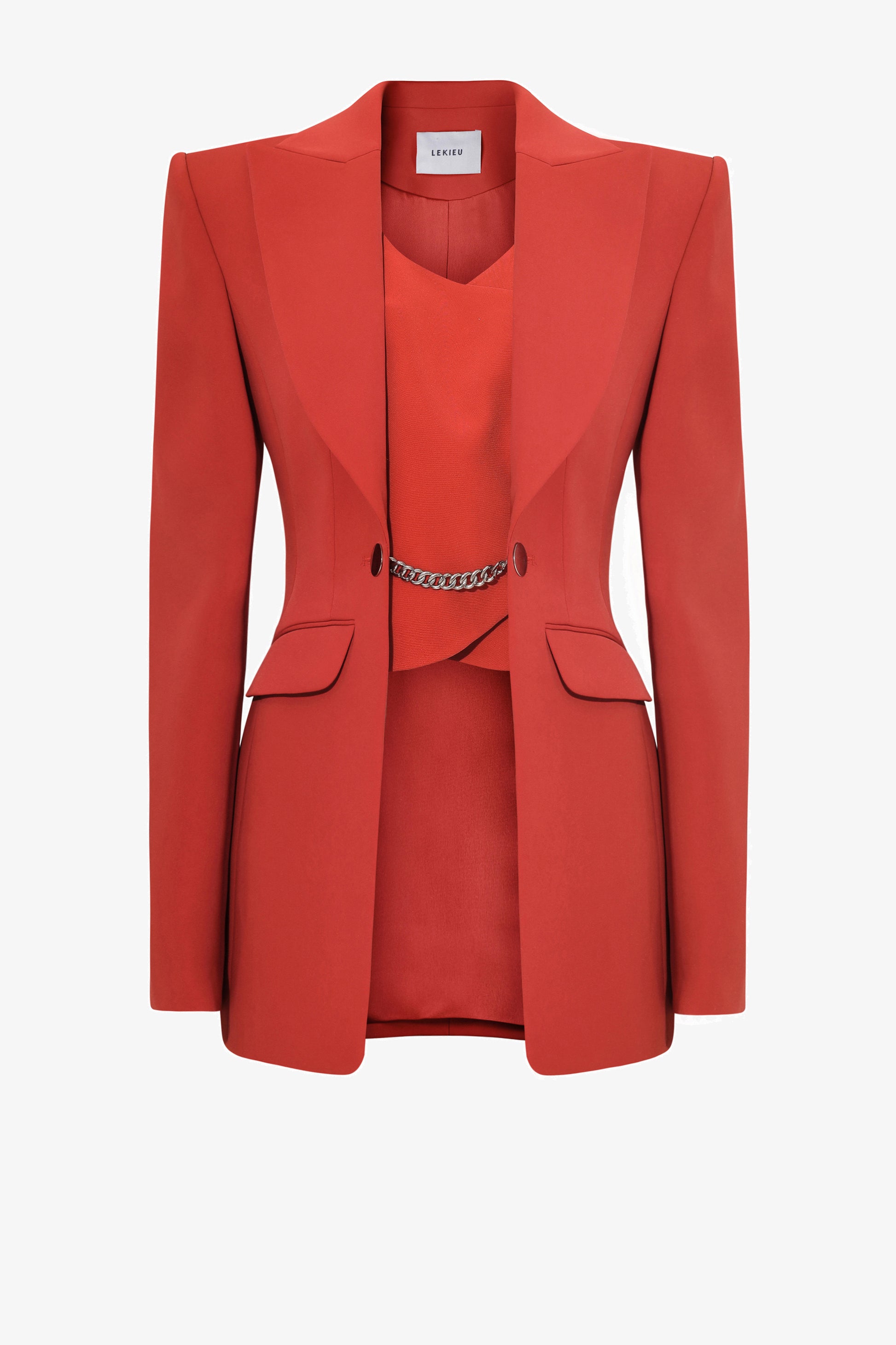 Fitted vest with an attached chain-link gilet, a cinched waist, and a contoured, shoulder-baring bodice. Two-tiered sleeves with four fabric-covered buttons. Two front patch pockets.