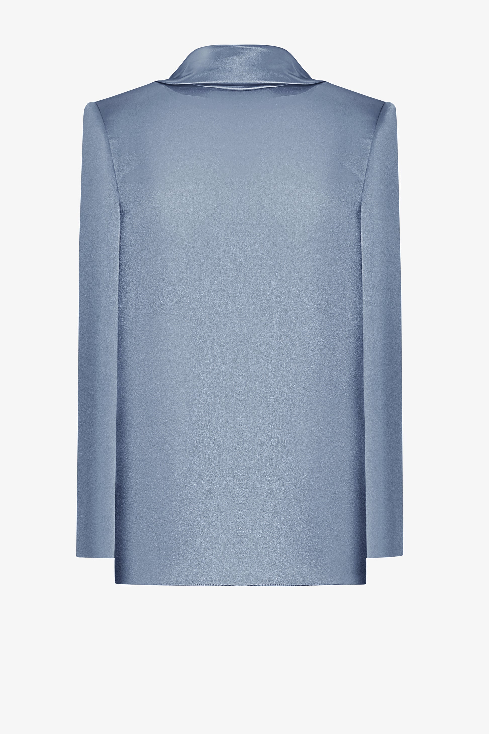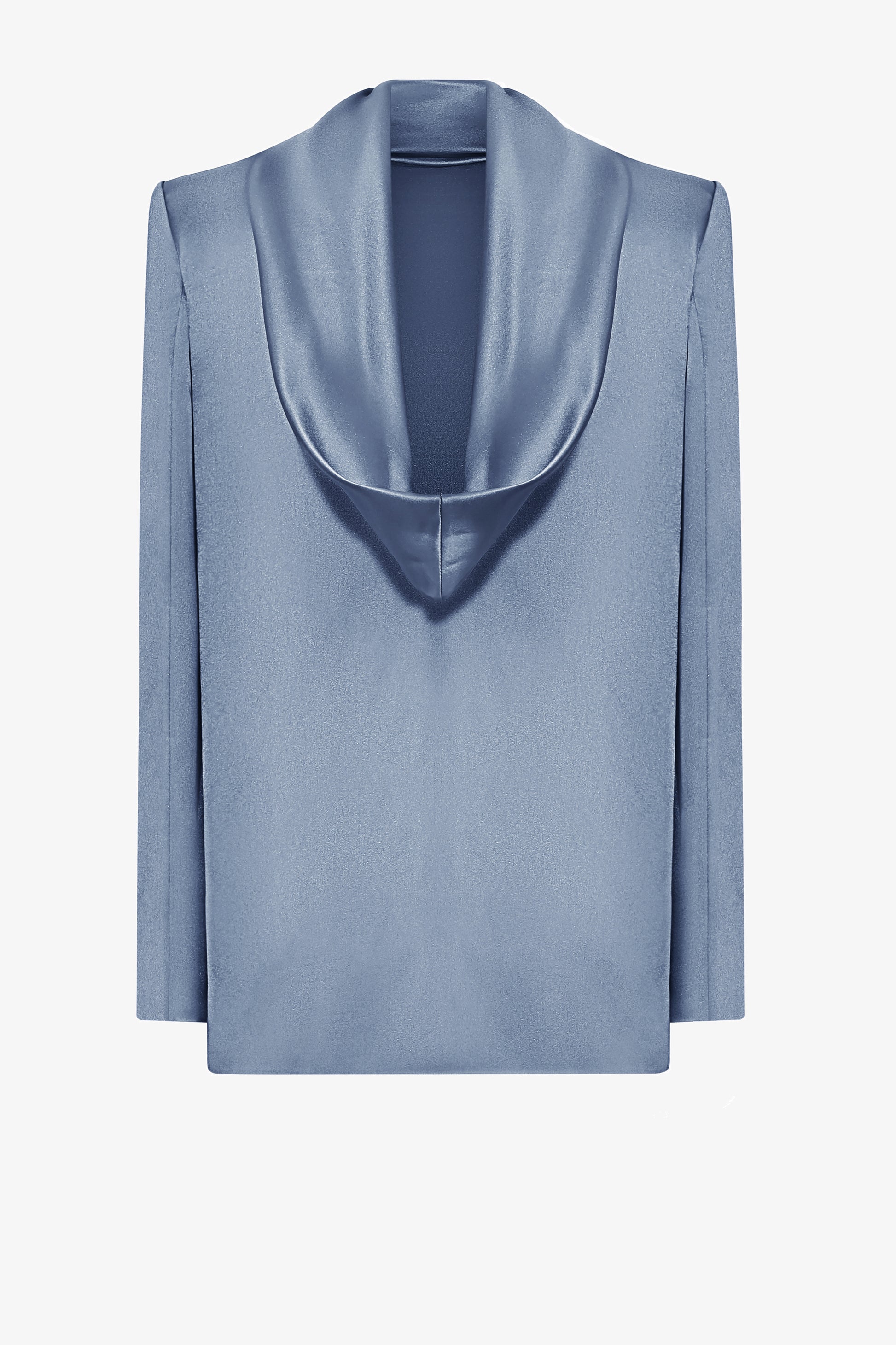 Draped-back shirt with shoulder pads creating a straight shoulder line.