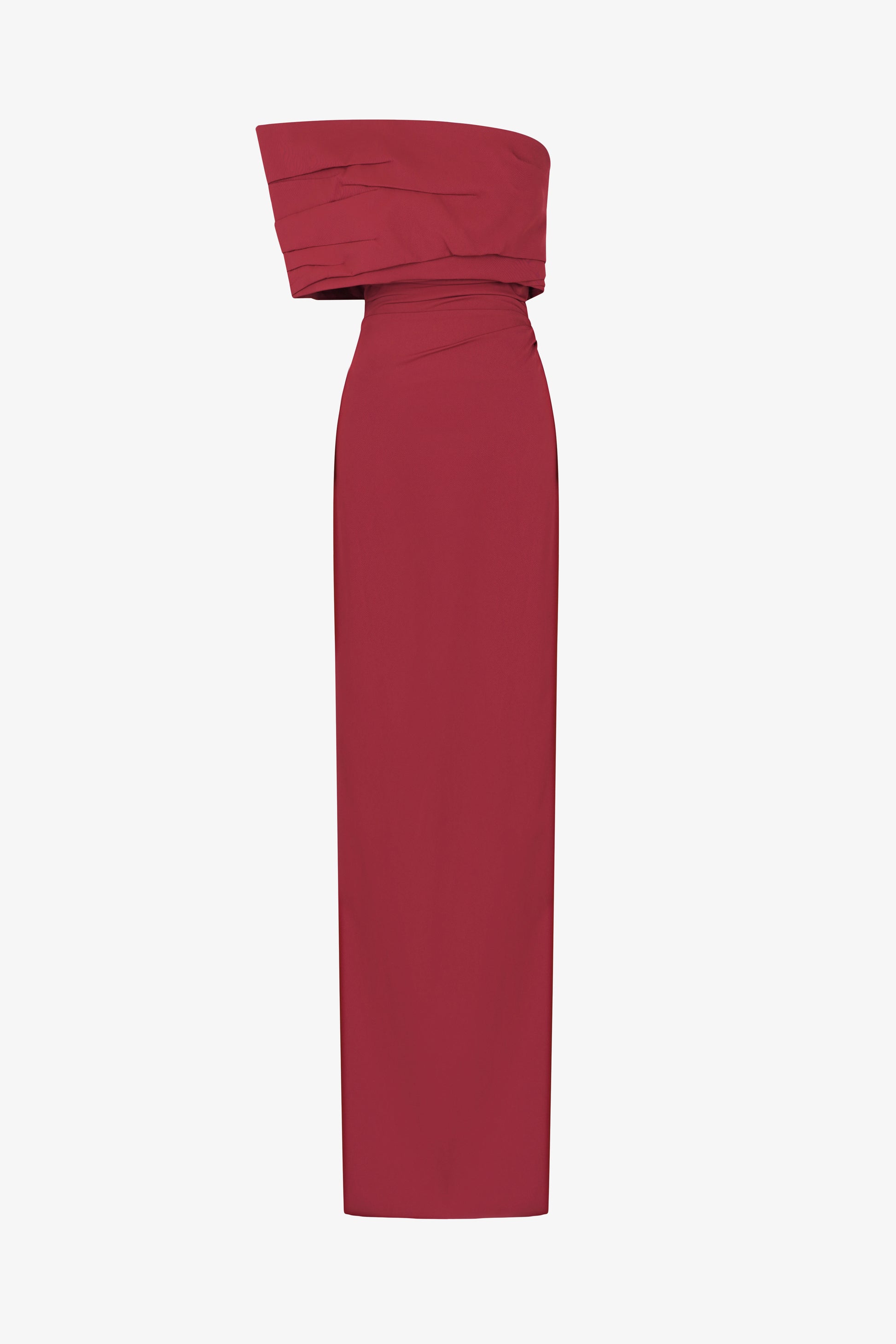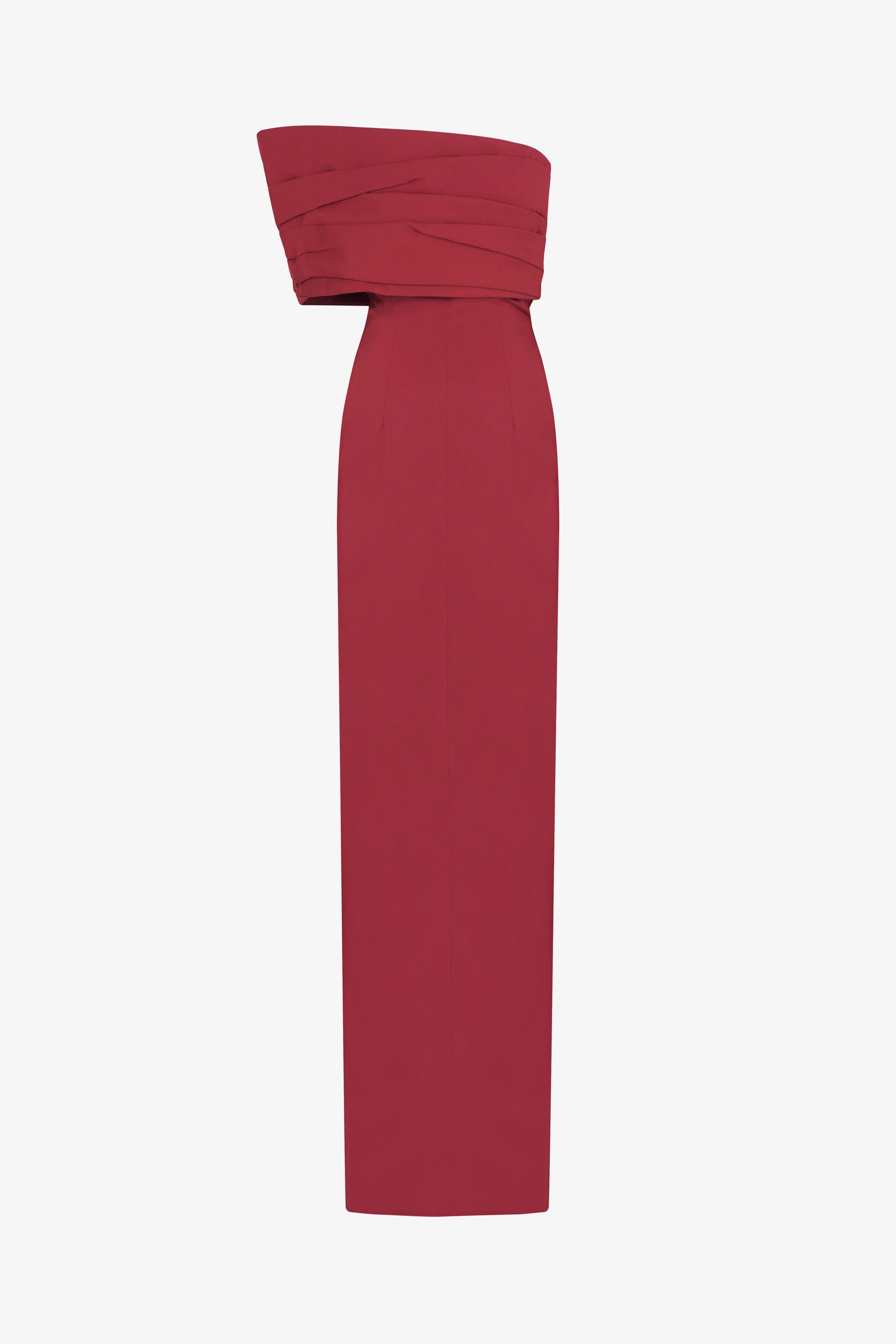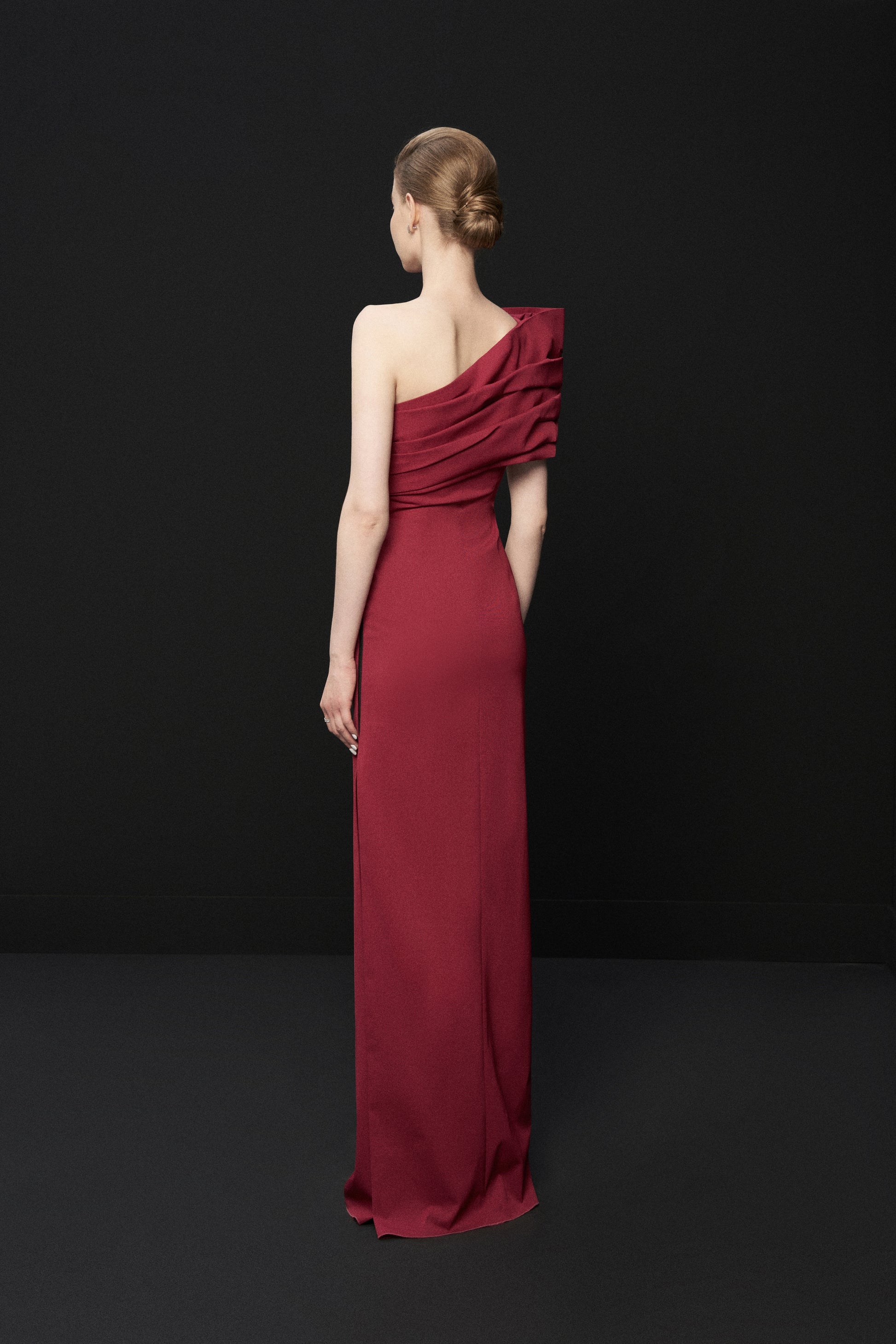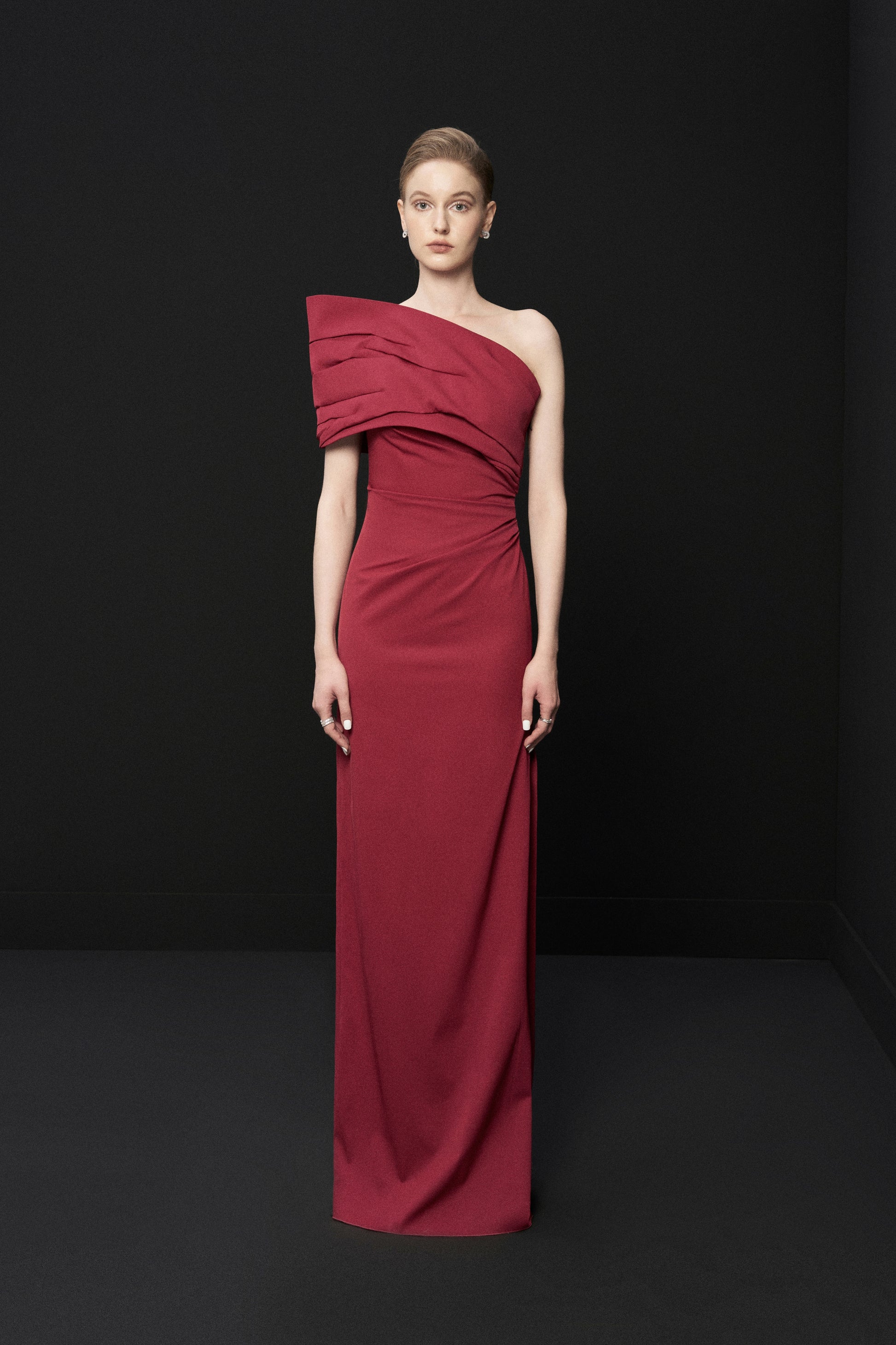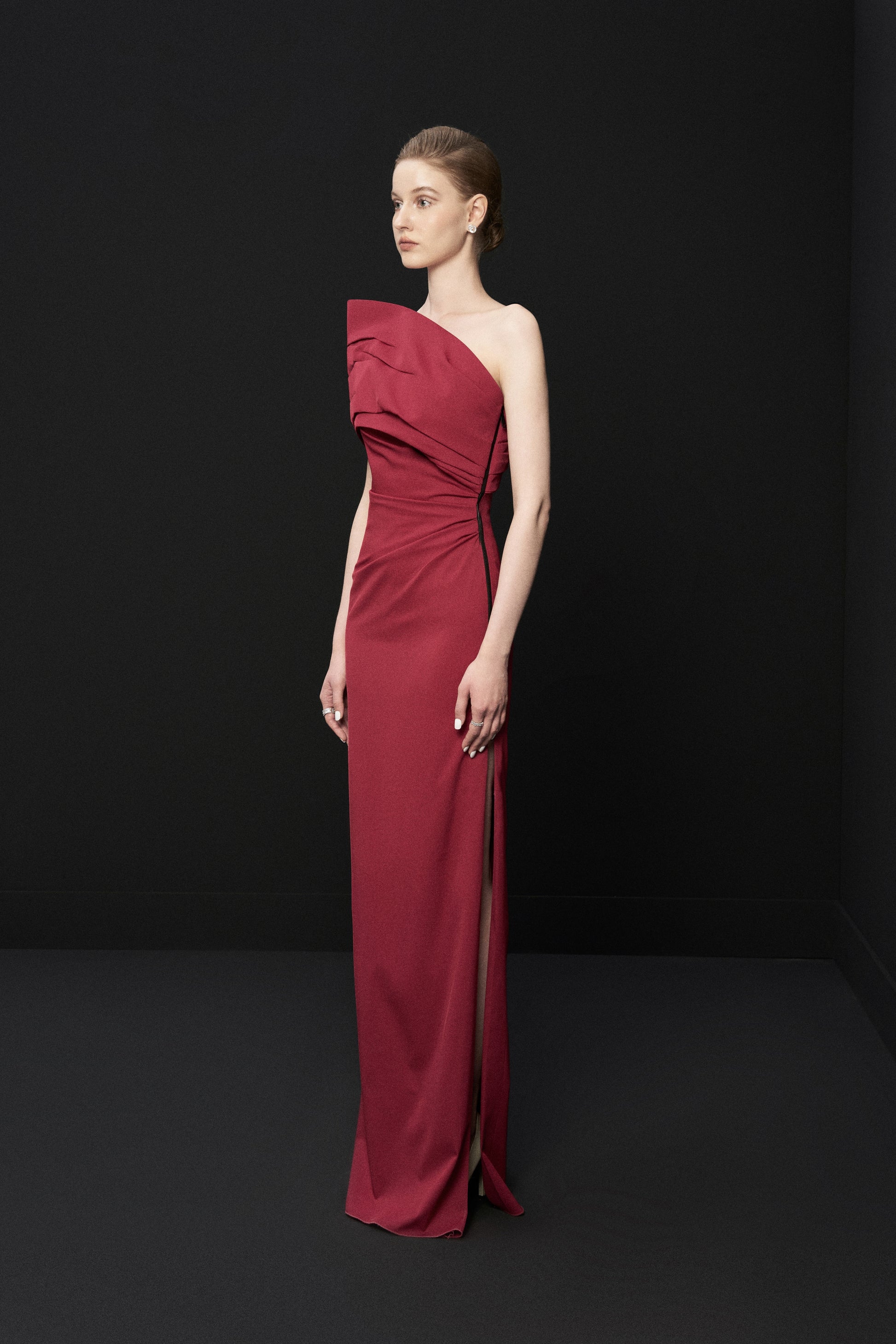 The dress is impressive with a novelty asymmetric shoulder design that is imbued with the breakthrough of modern clothing. With a special carmine red tone, the dress will certainly capture all eyes at the first sight.