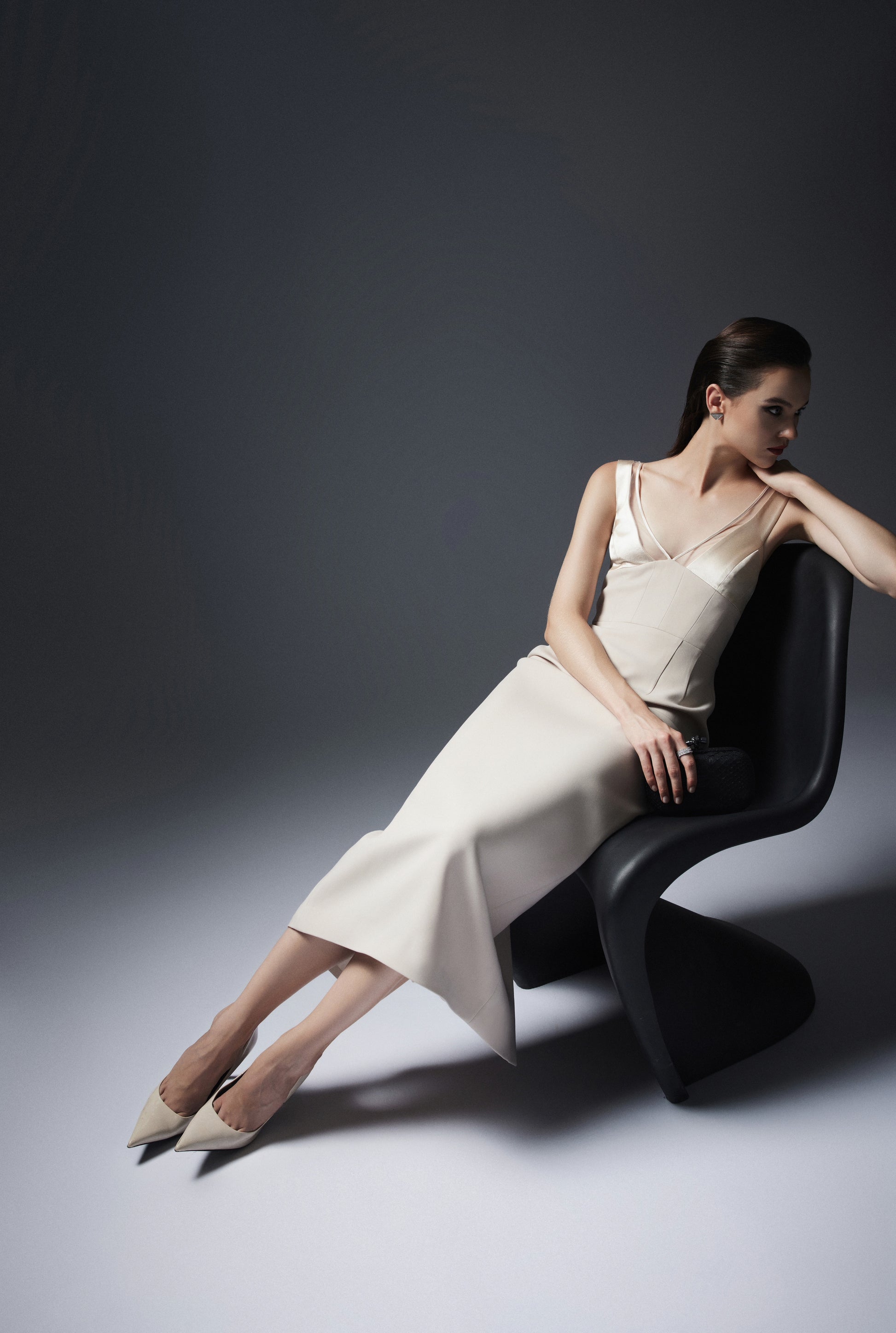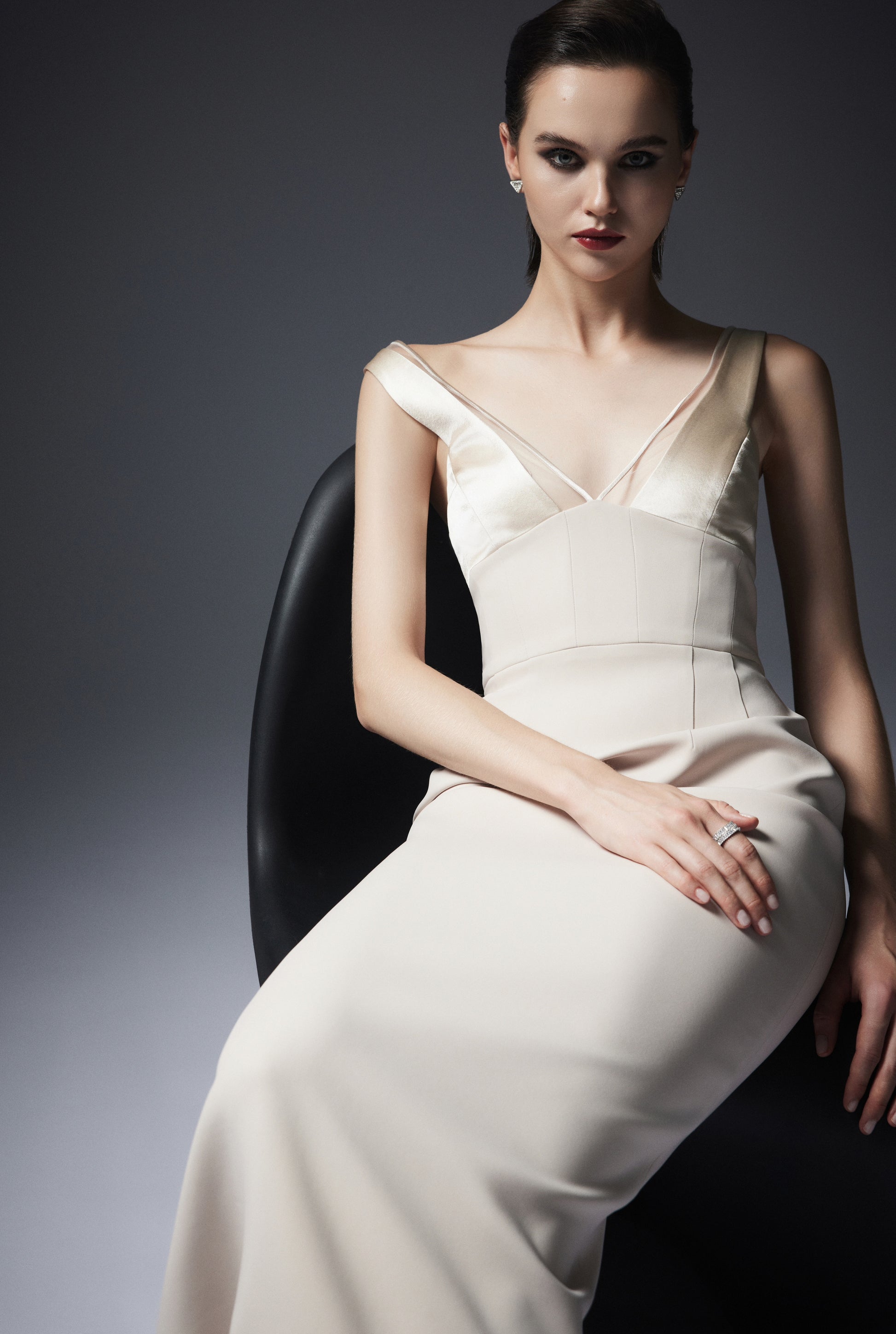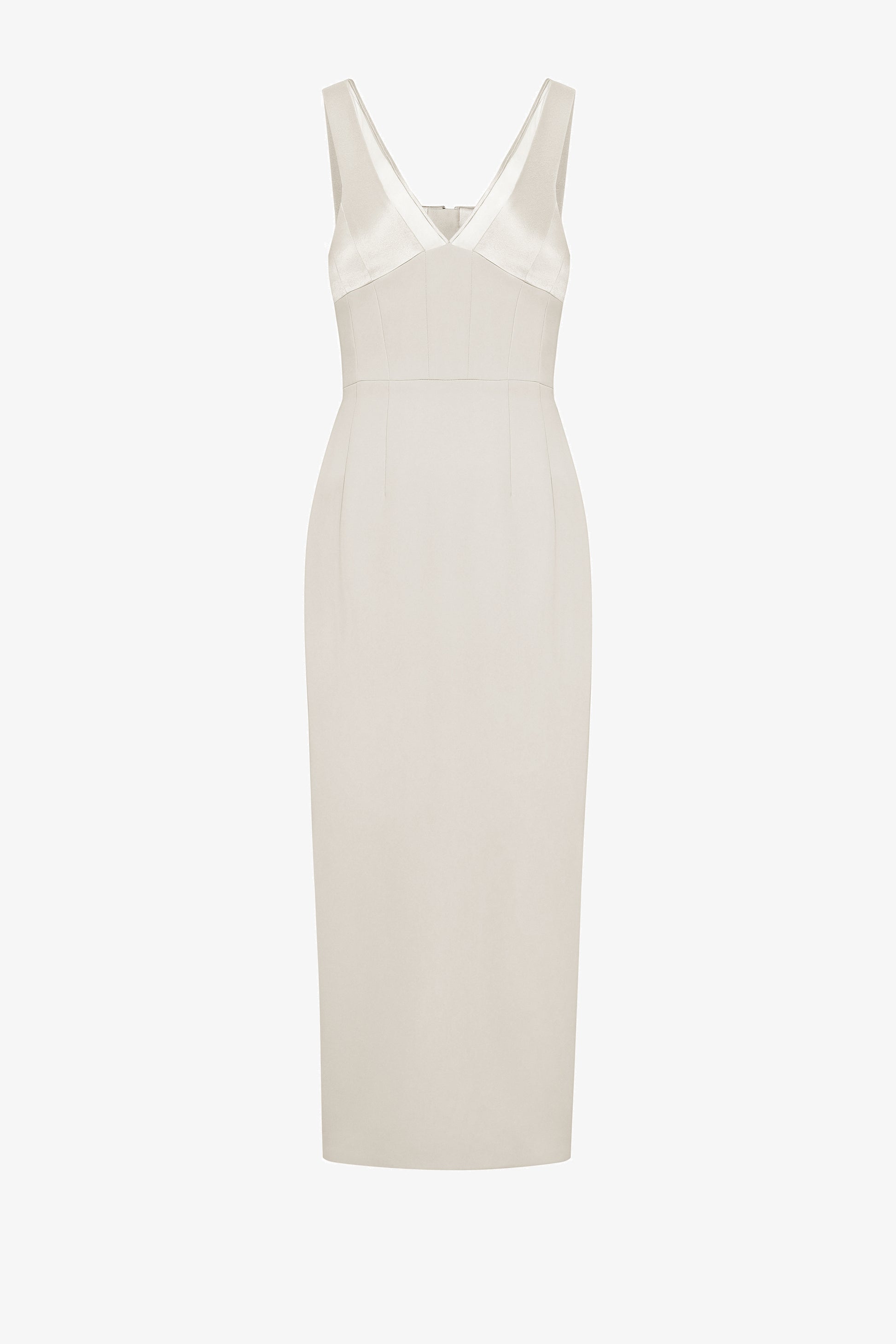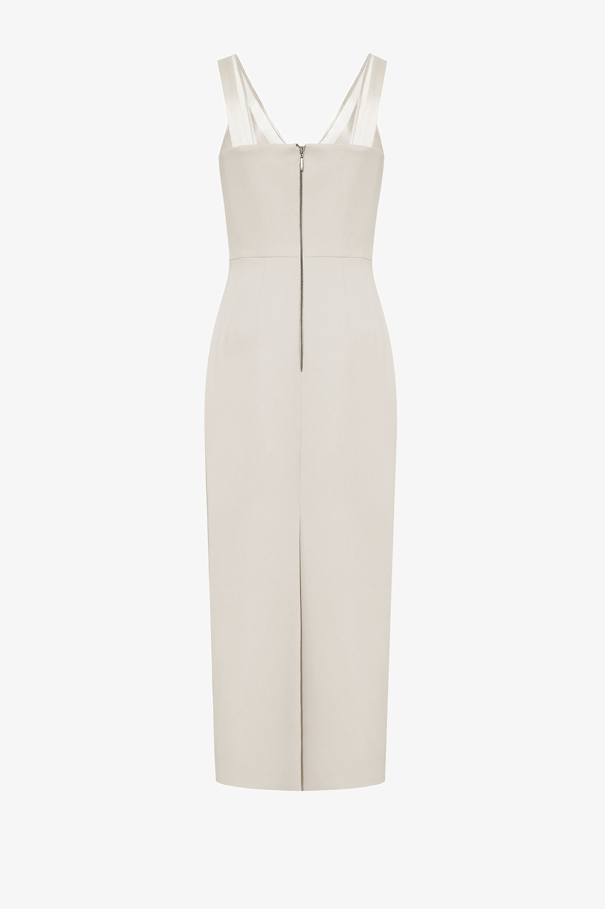 Ankle-length dress with a corset bodice structured with boning. It features a V-neckline with paneled bust for a snug fit. The straps are combined with mesh fabric trimmed with satin. It has a metal zipper at the back and an overlapping slit.