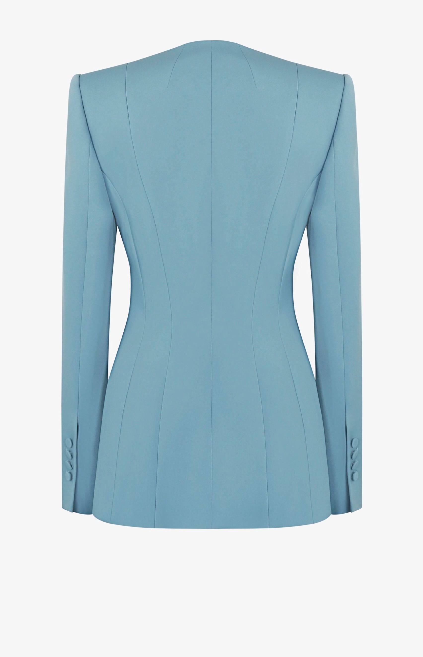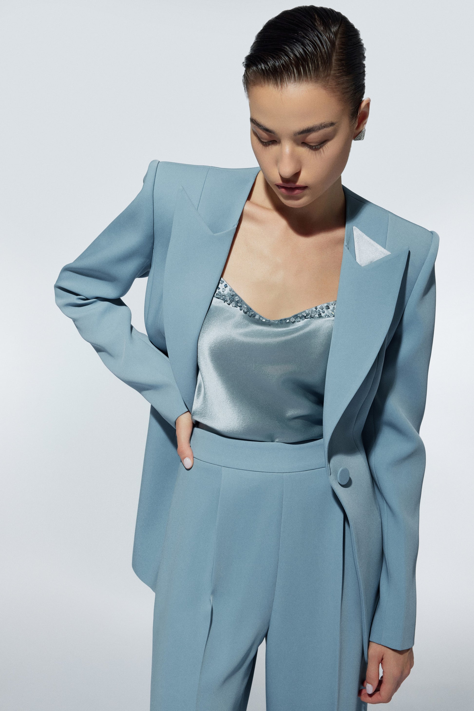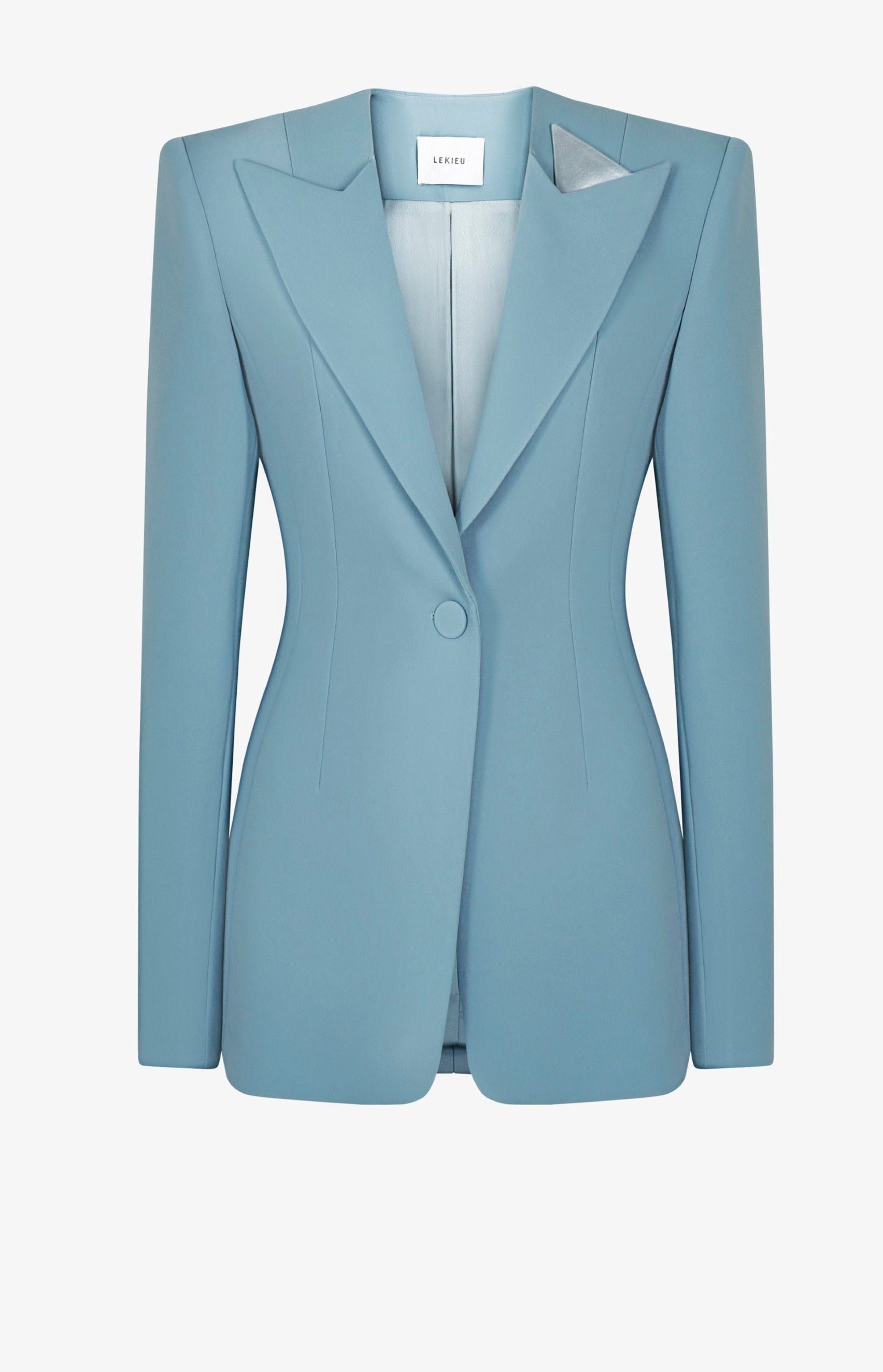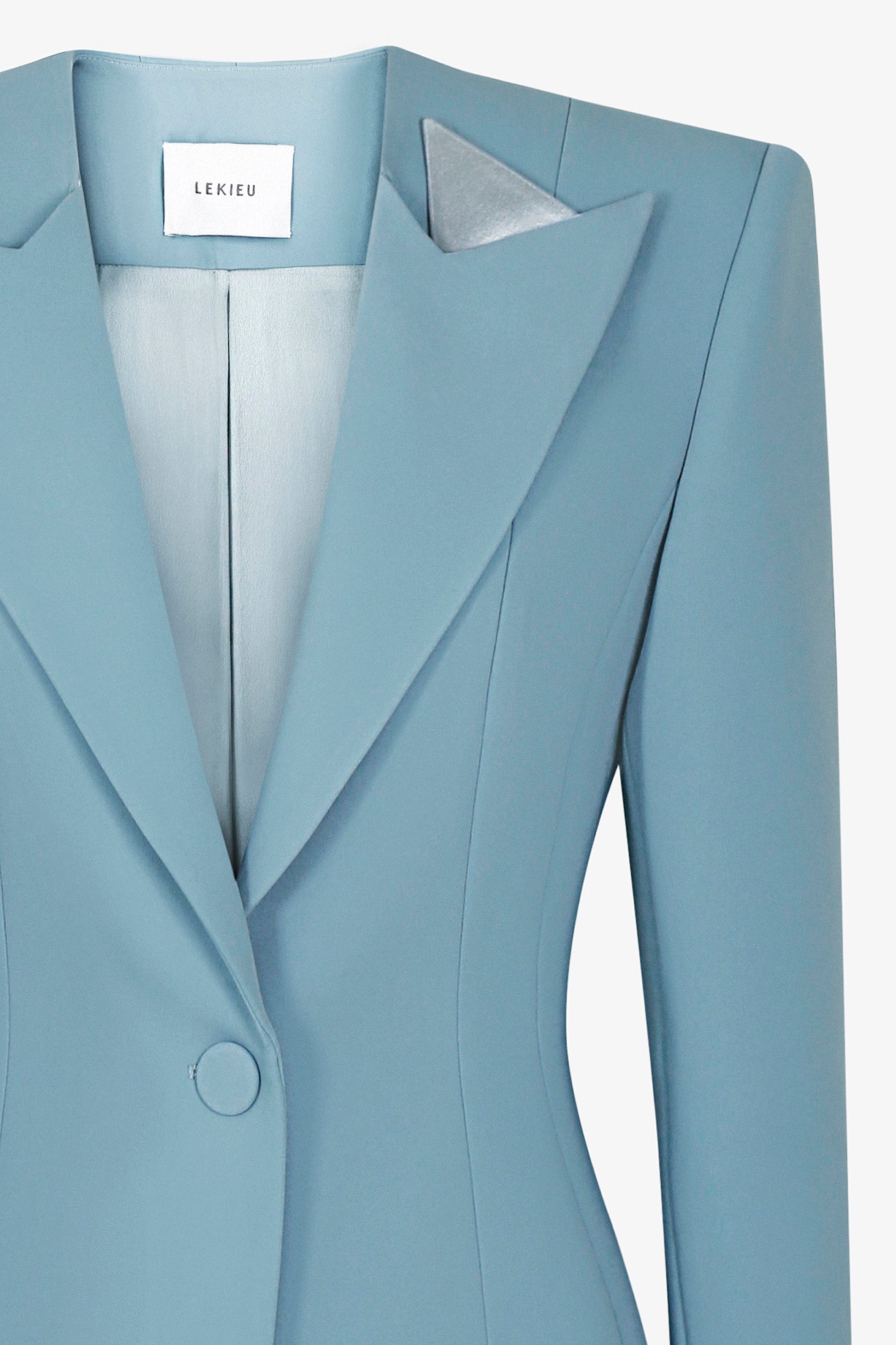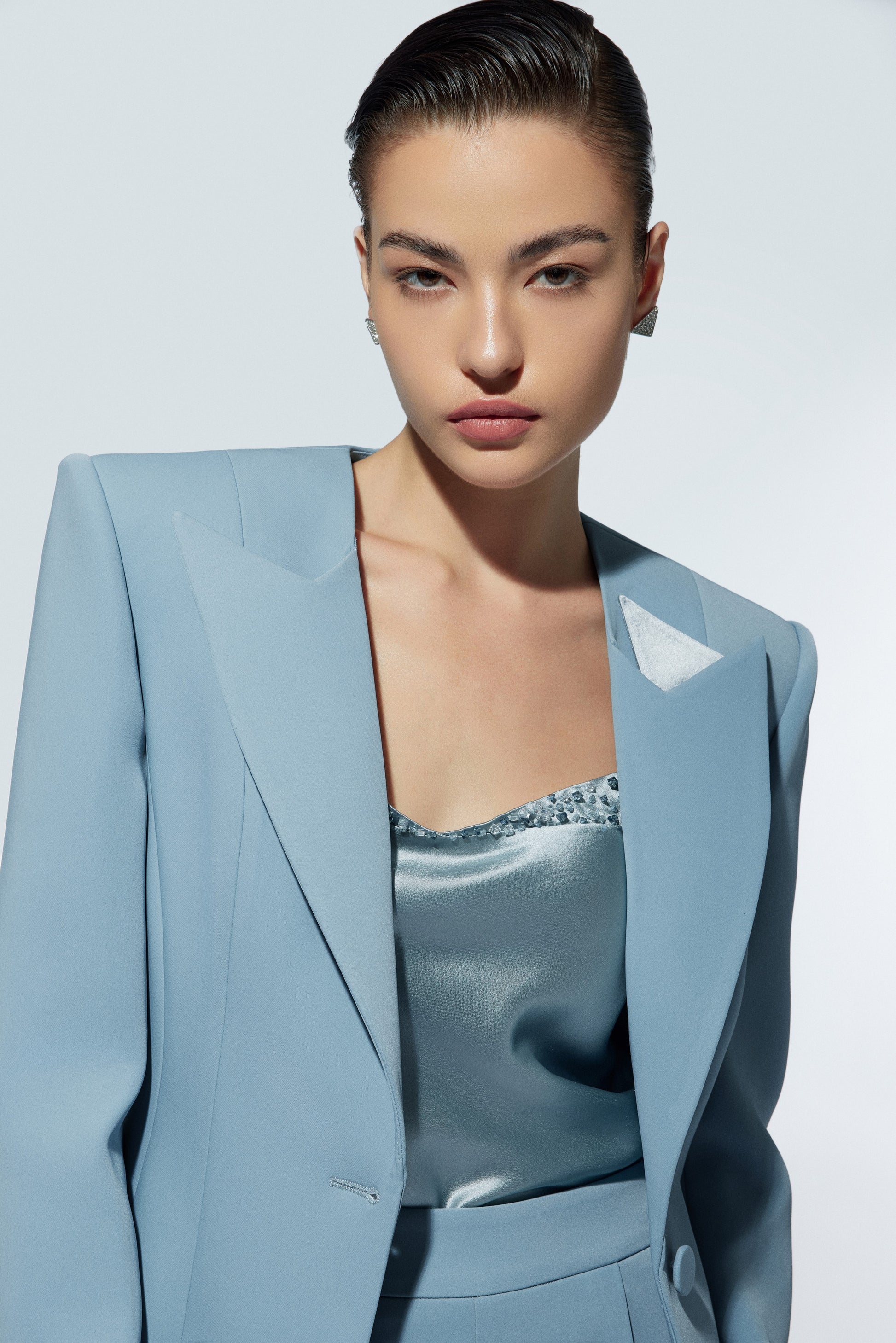 One button Single-breasted suit jacket with a fitted silhouette. The sleeves are of the 2-piece style with 4 buttoned cuffs made from the same fabric. The jacket has a wide shawl lapel, pointed tails, a Satten triangle design detail on the left side. and a paneled body. The front of the jacket has two darts and 2 flap pockets. The back has a center back seam