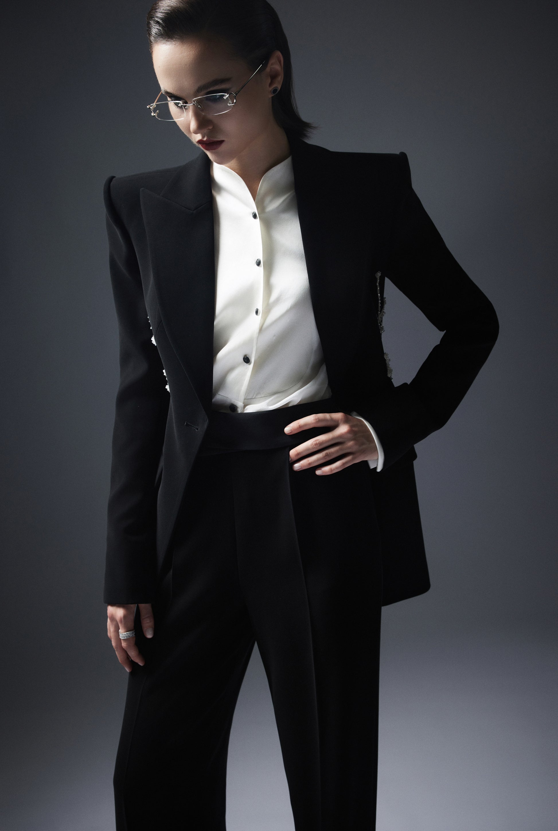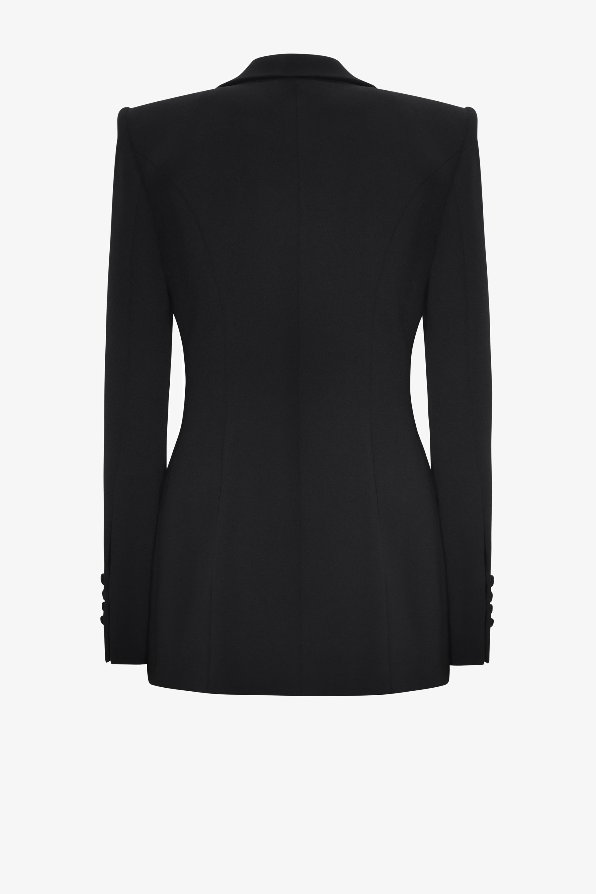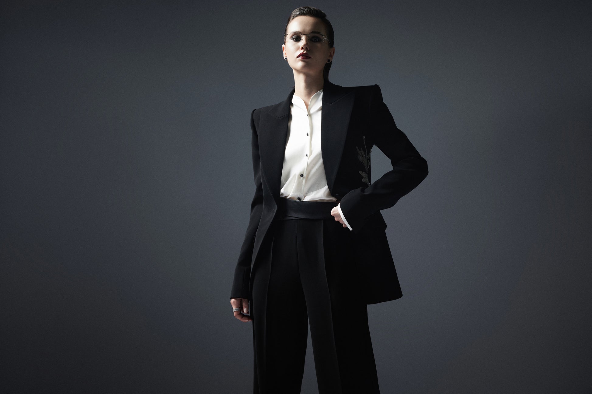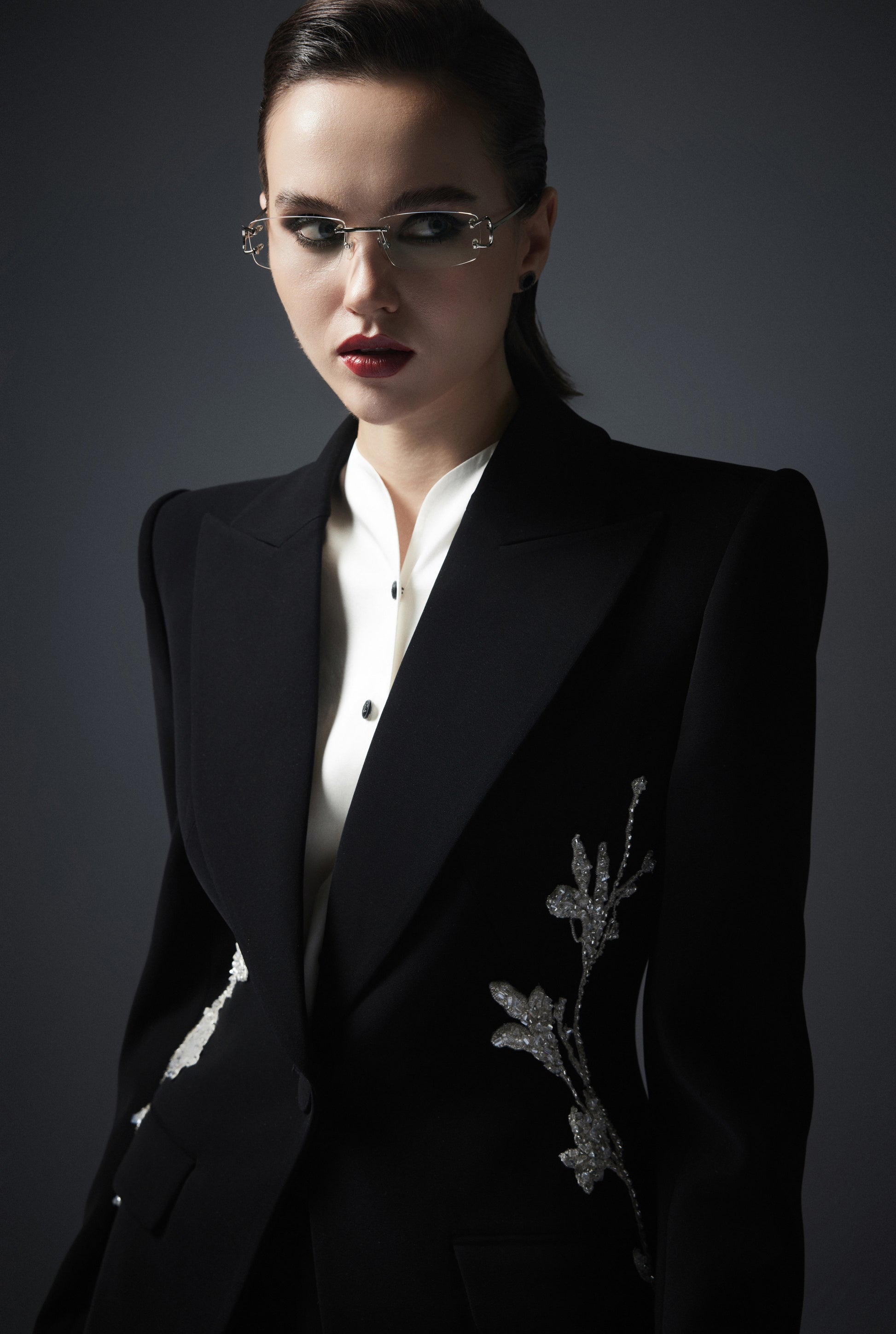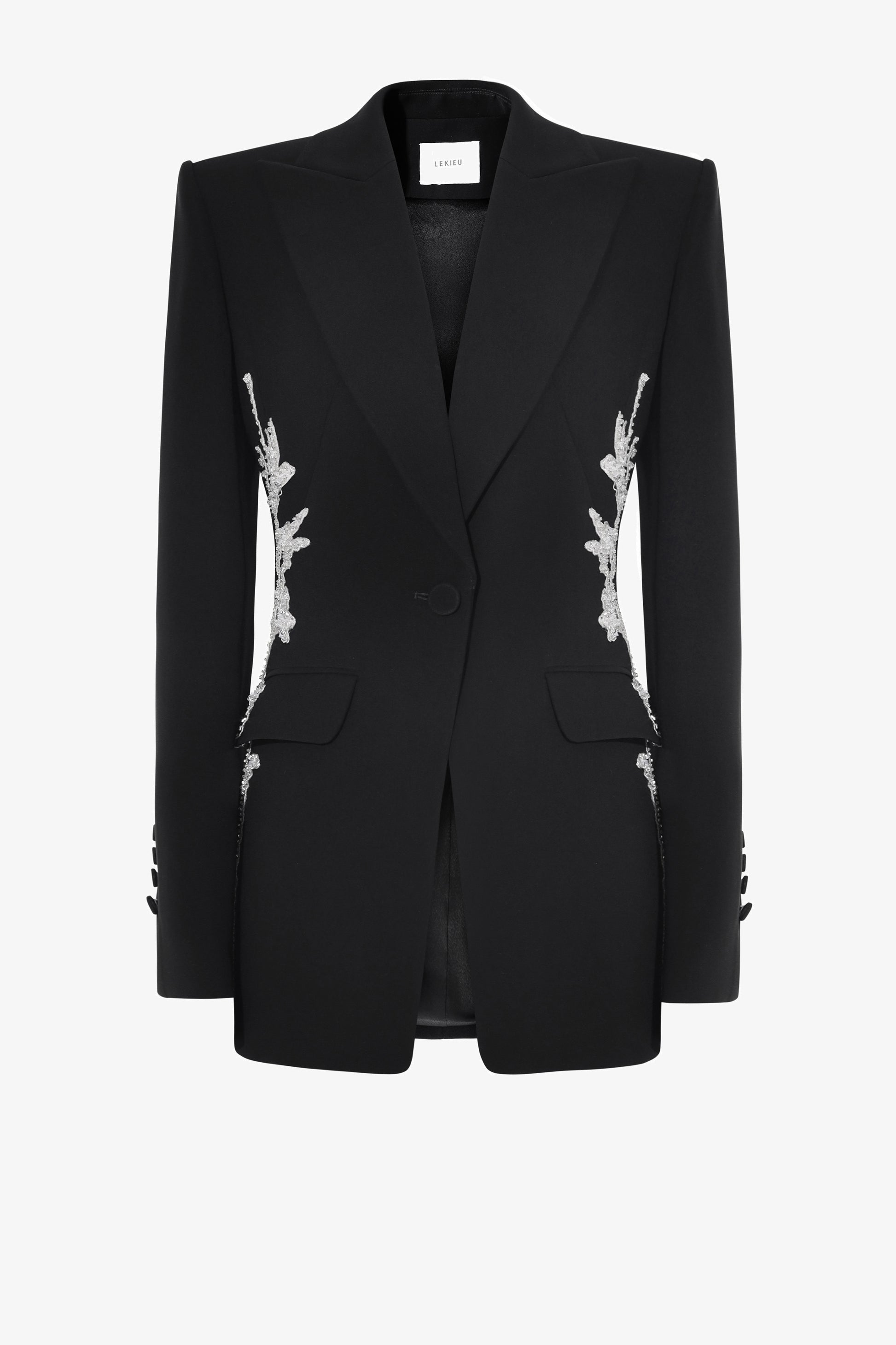 Fitted blazer single-breasted with broad shoulders and a peaked lapel. The front features unique diagonal seams that shape the garment, embellished with hand-applied floral embroidery. It includes two horizontal flap pockets. The sleeves are designed with two parts and feature four buttons covered in the same fabric as the blazer. The back has a center seam.