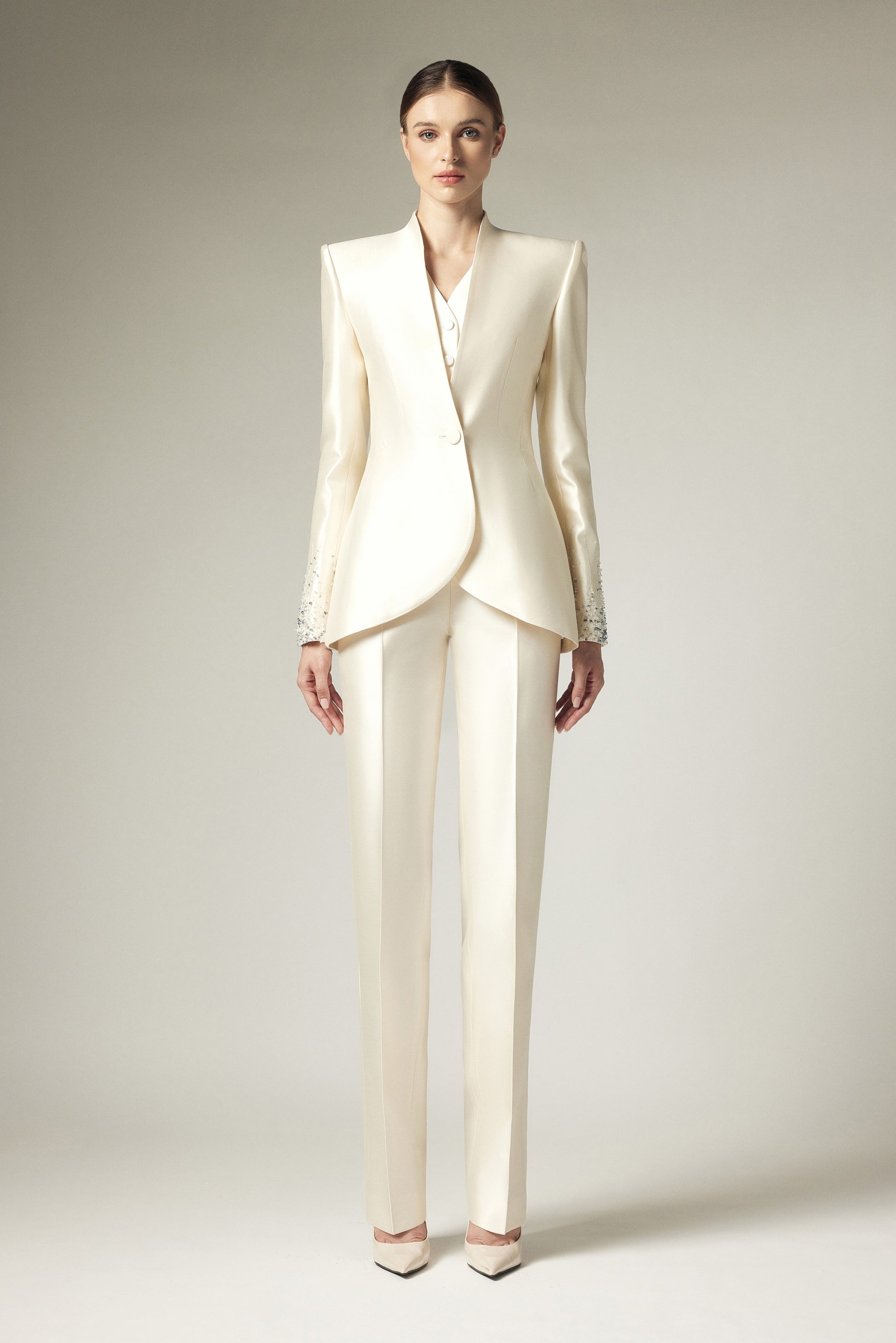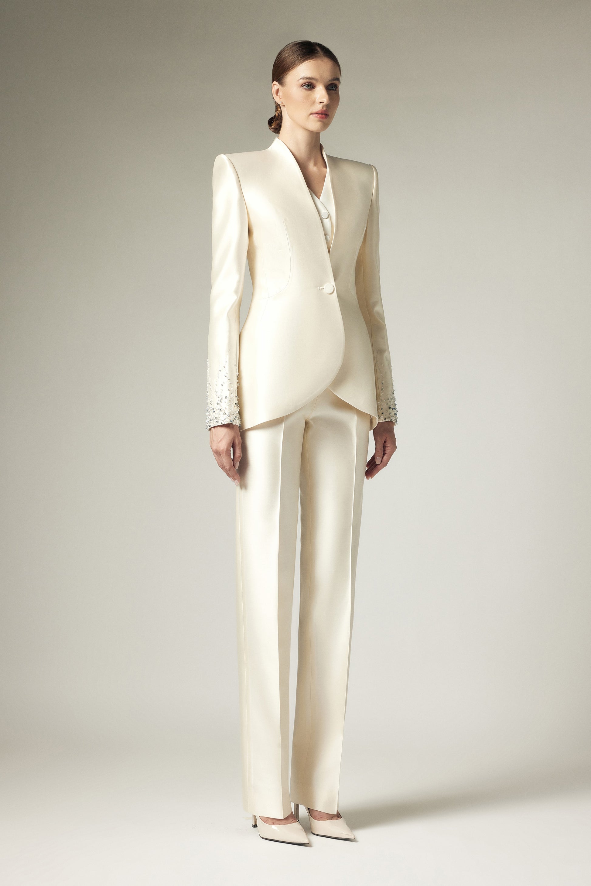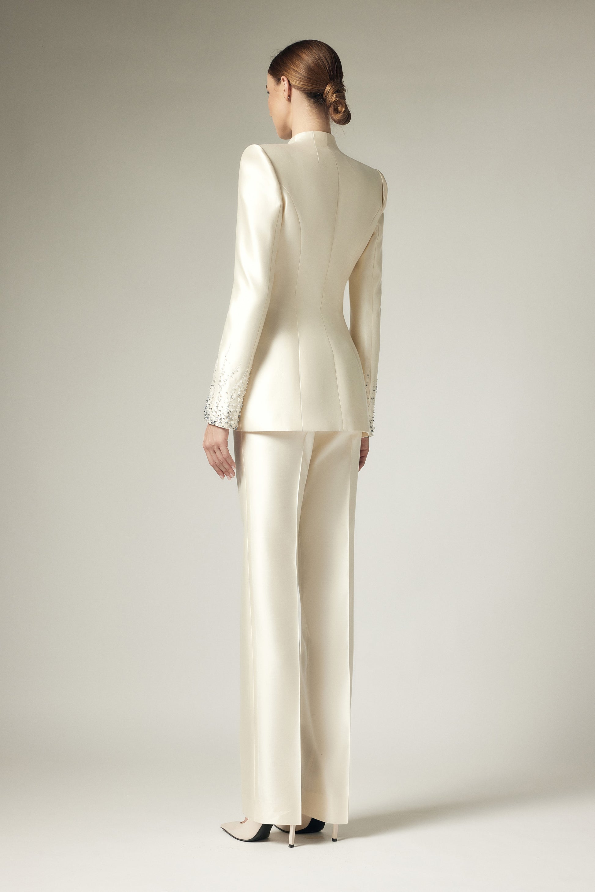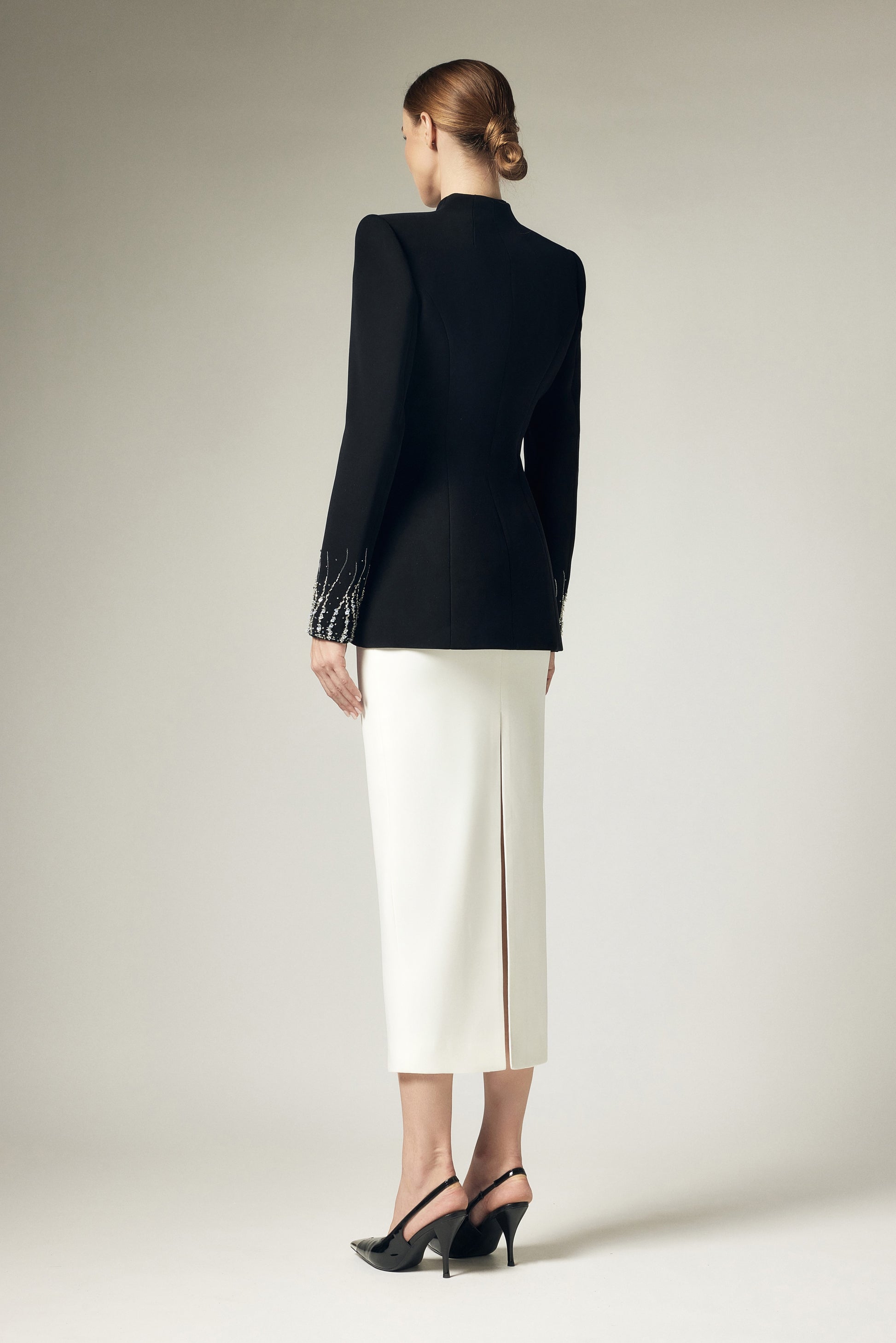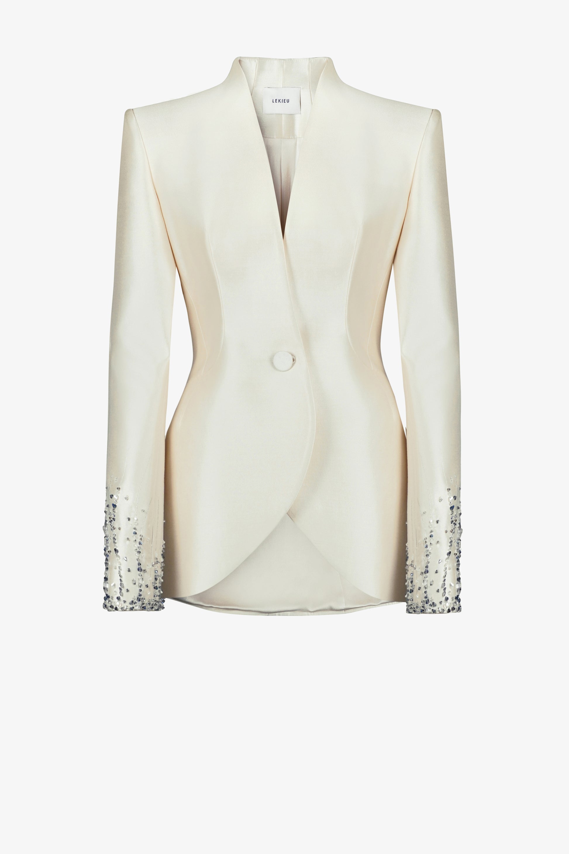 Artfully depicting the delicate touch points on a woman's body, the flared lapel vest coupled with gemstone embellishments instead of the typical four enclosed buttons serves as a lever for the exquisite beauty to radiate through the Jennica Jacket.