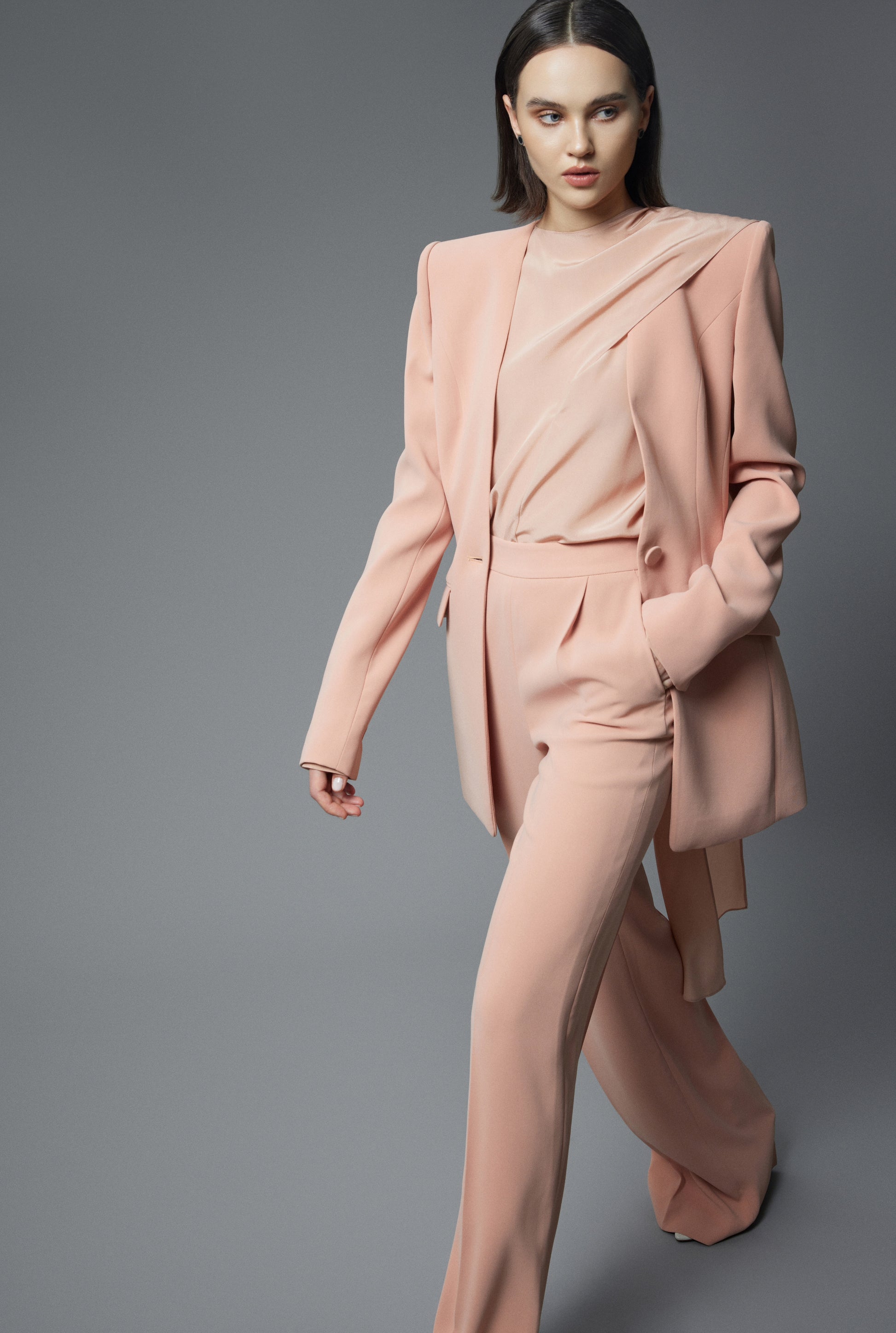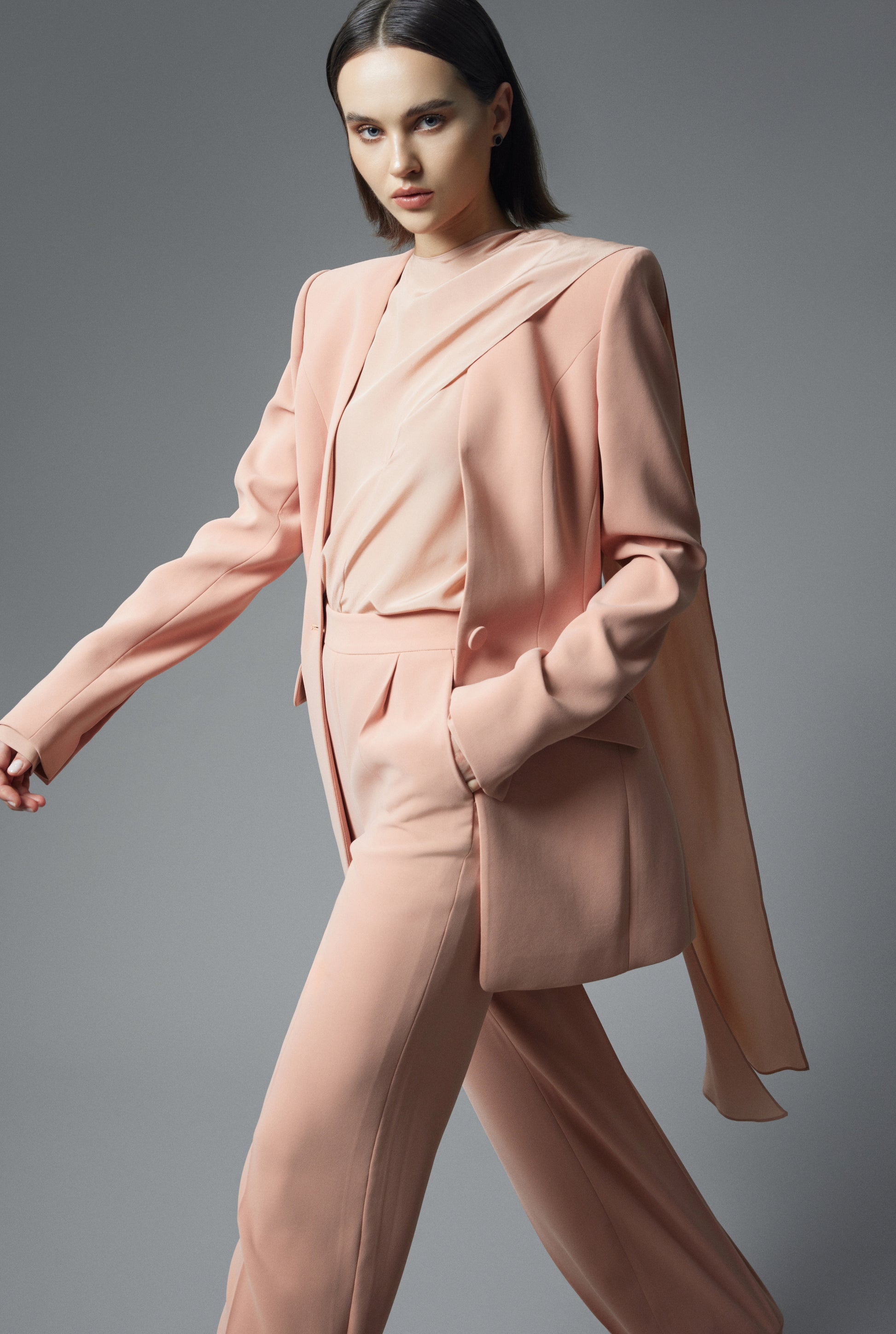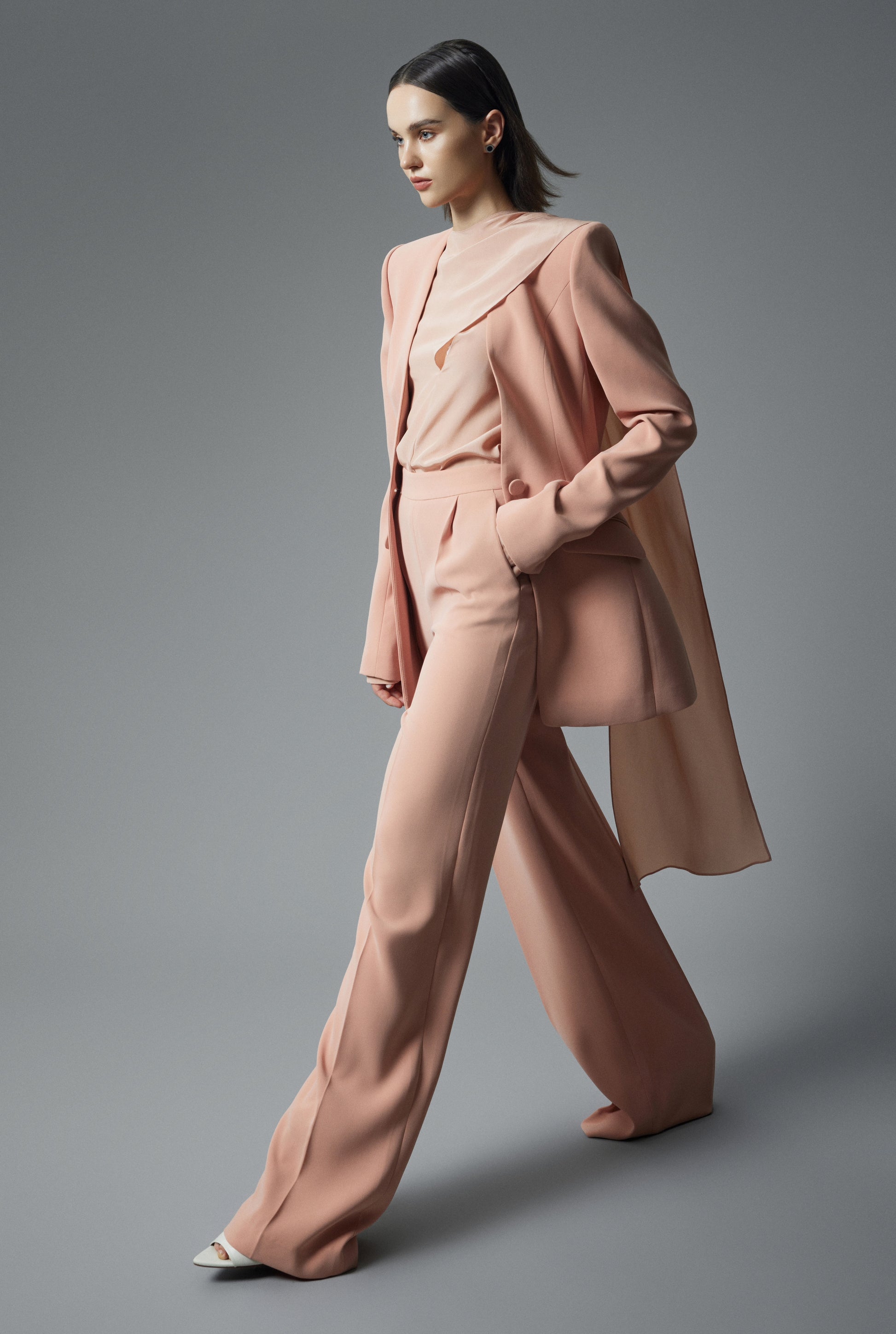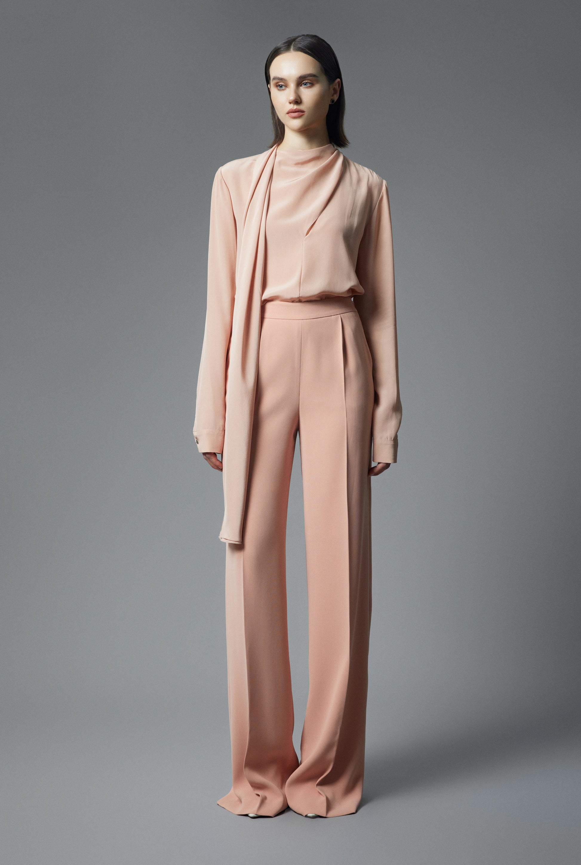 Wide-leg trousers with a crease, hook and bar closure, 2 front diagonal pockets, and 2 rear welt pockets. The leg width measures 29cm and reaches the shoe.