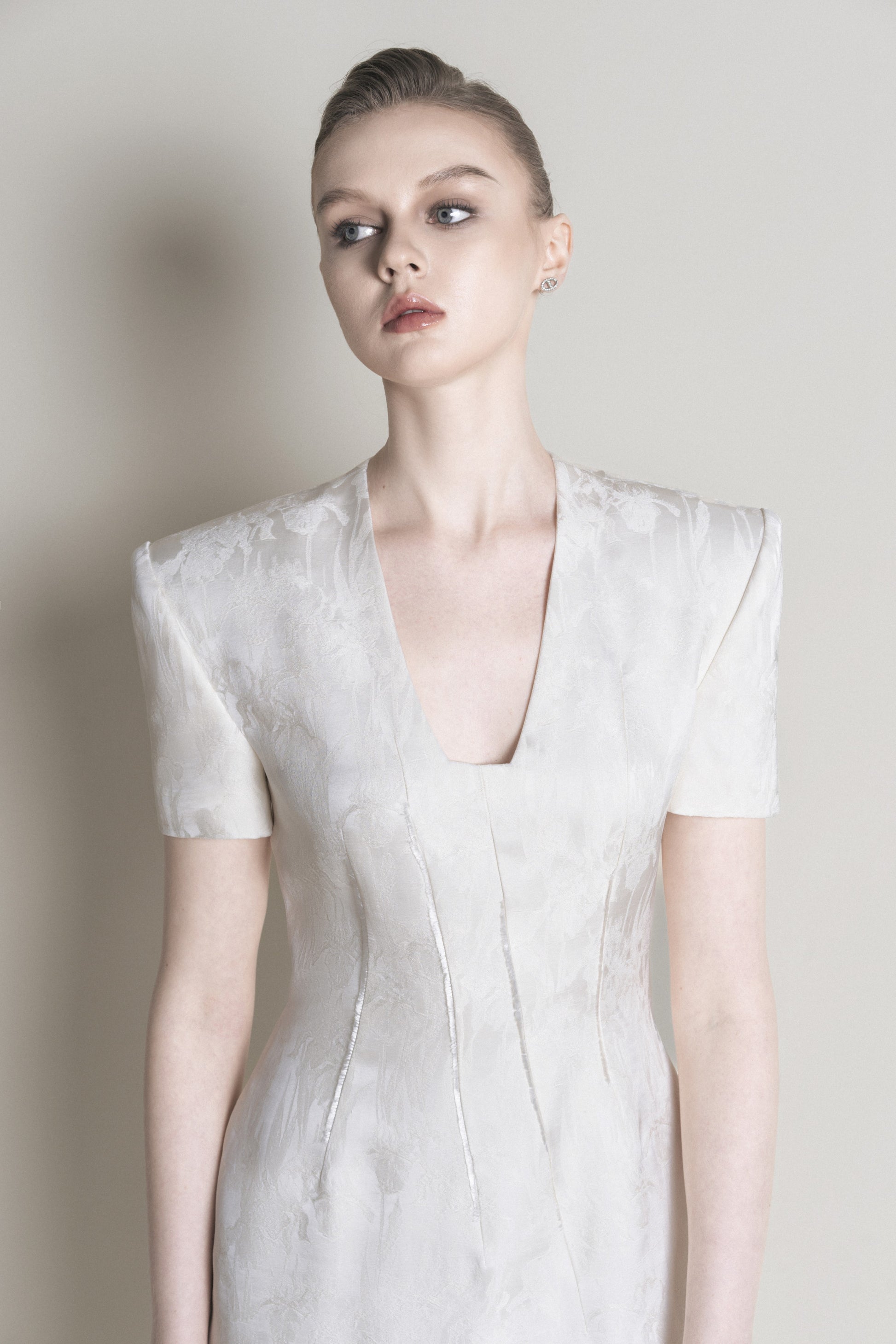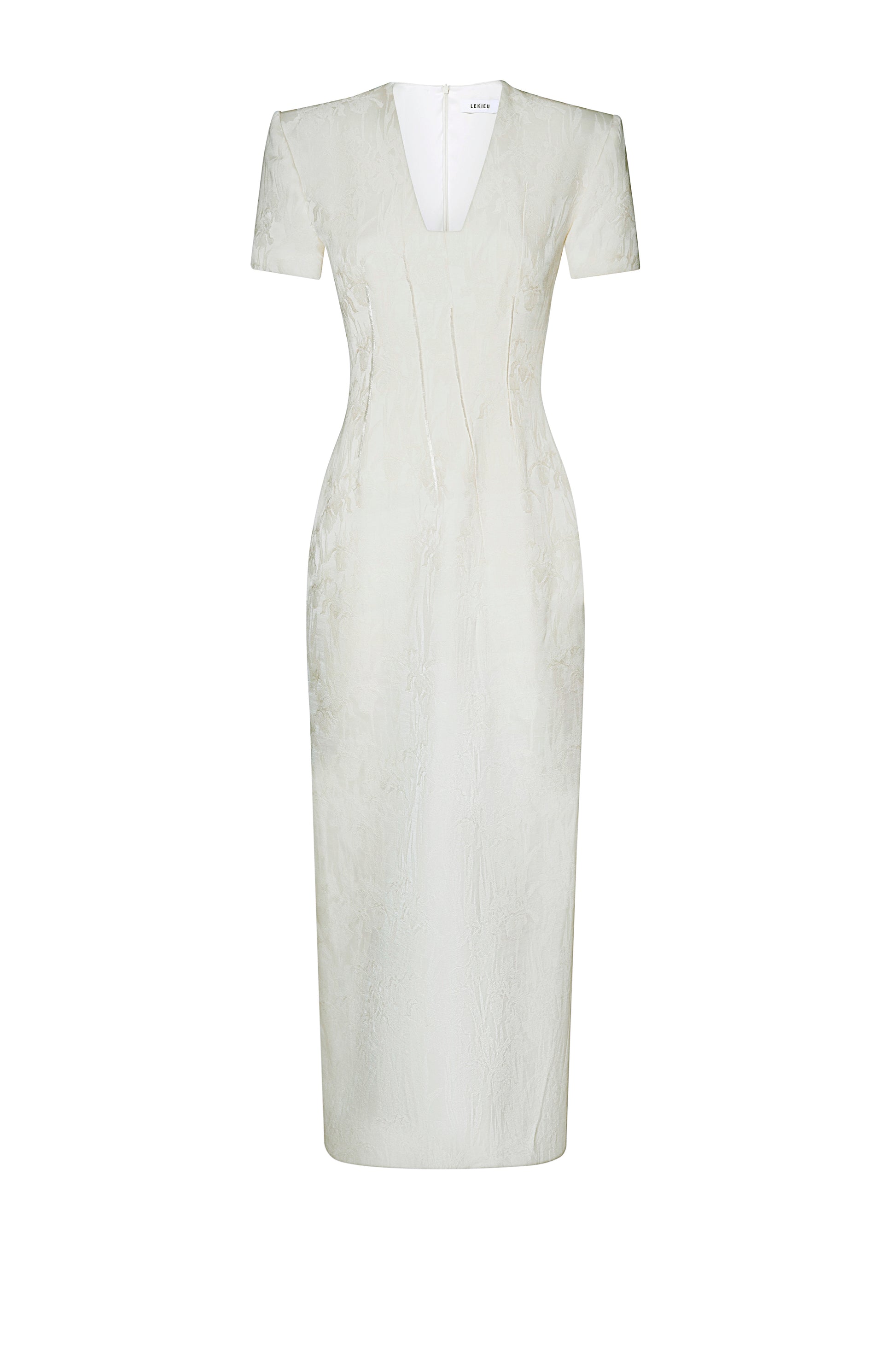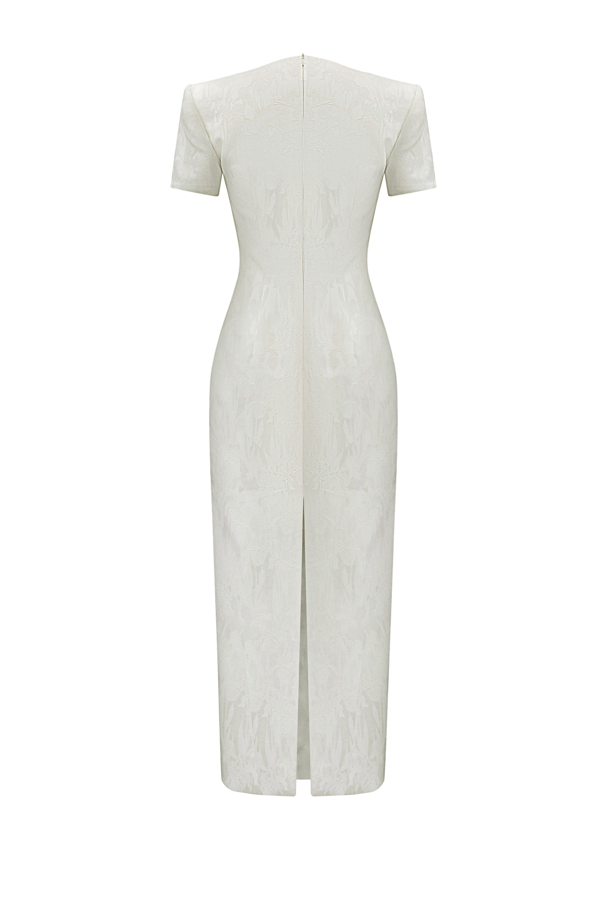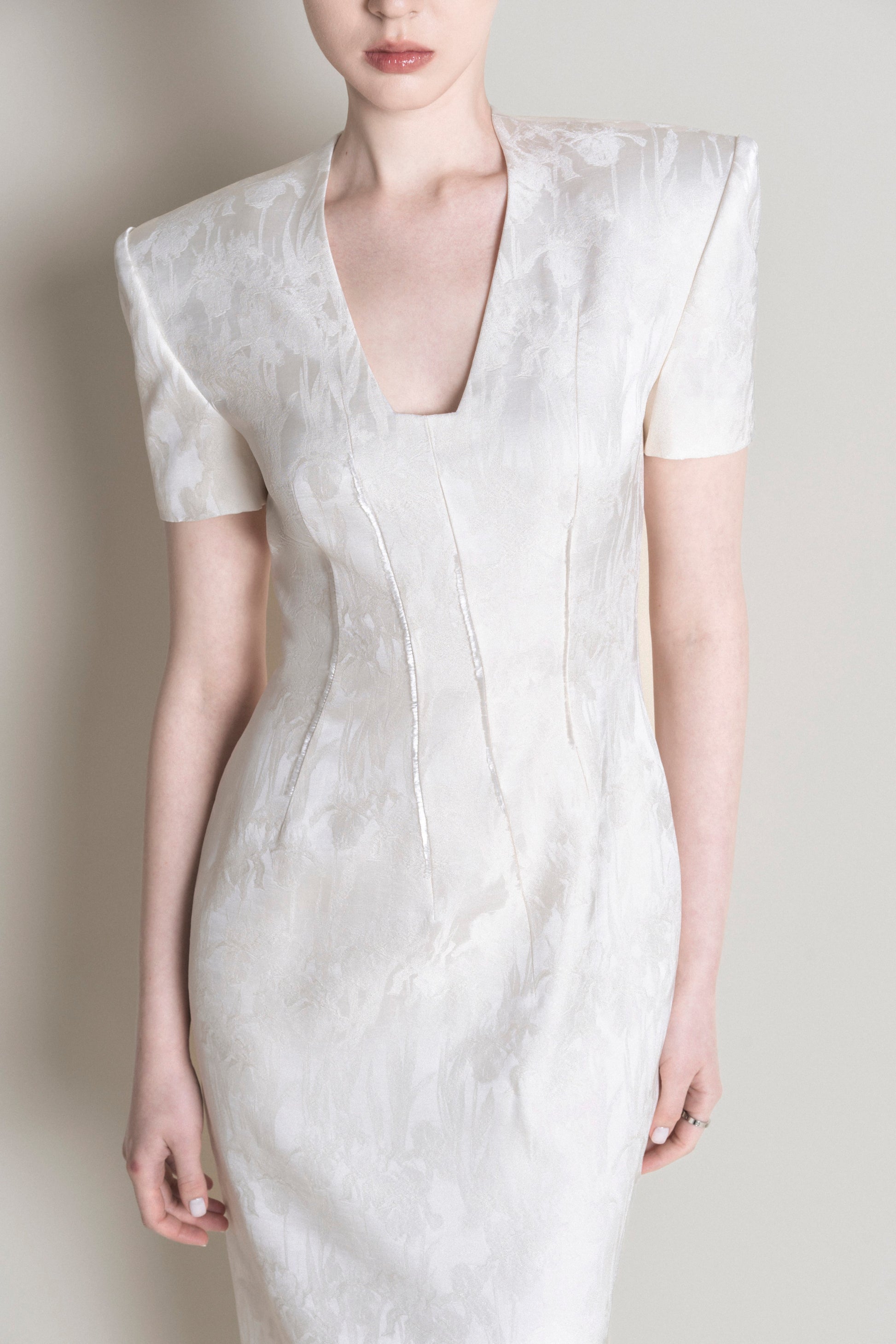 The pencil skirt features off-the-shoulder sleeves with 2.5 cm shoulder pads and a length that extends past the calf. The V-neckline is cut across, with four asymmetrical dart seams on the front. A white fringe detail is sewn along the edges of the satin floral fabric, adding a distinctive touch to the garment. The back has two dart seams, a center back zipper, and an overlapping slit.
