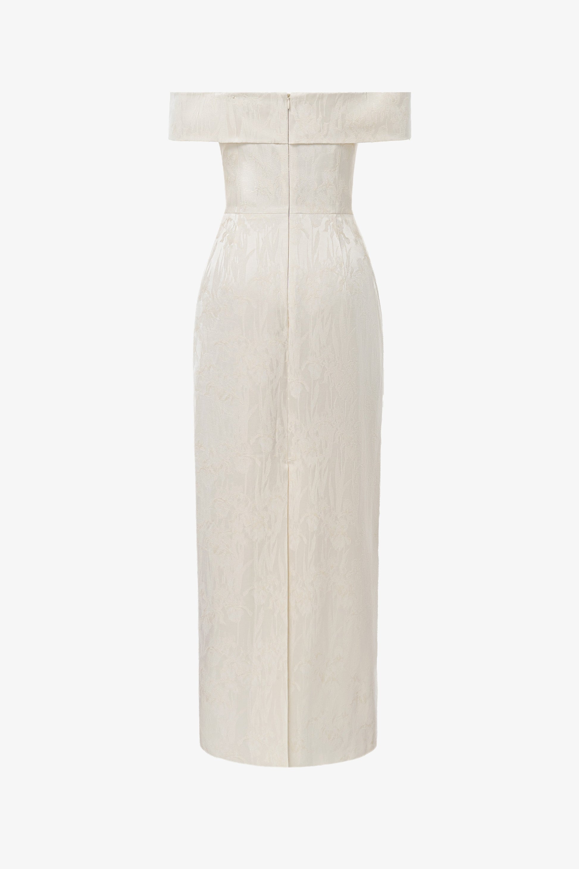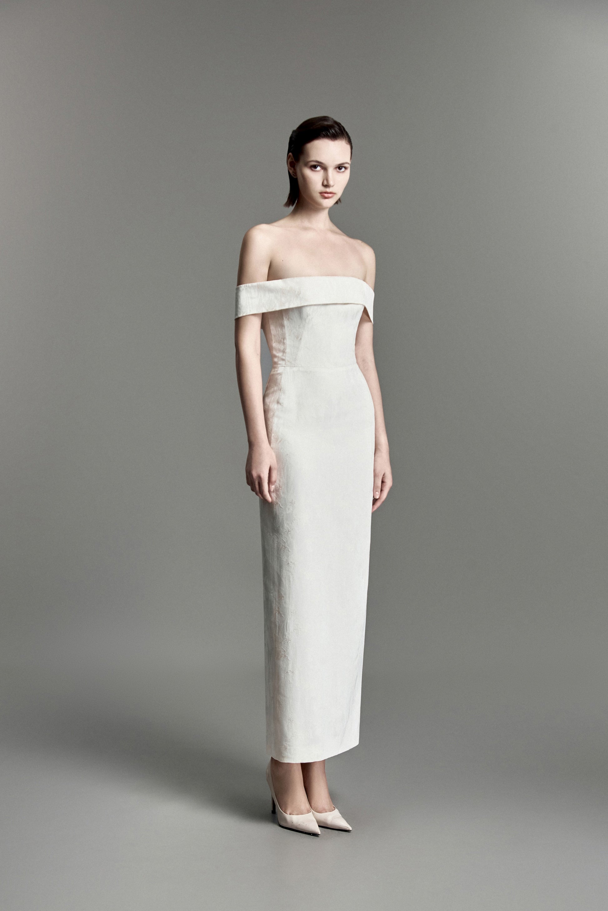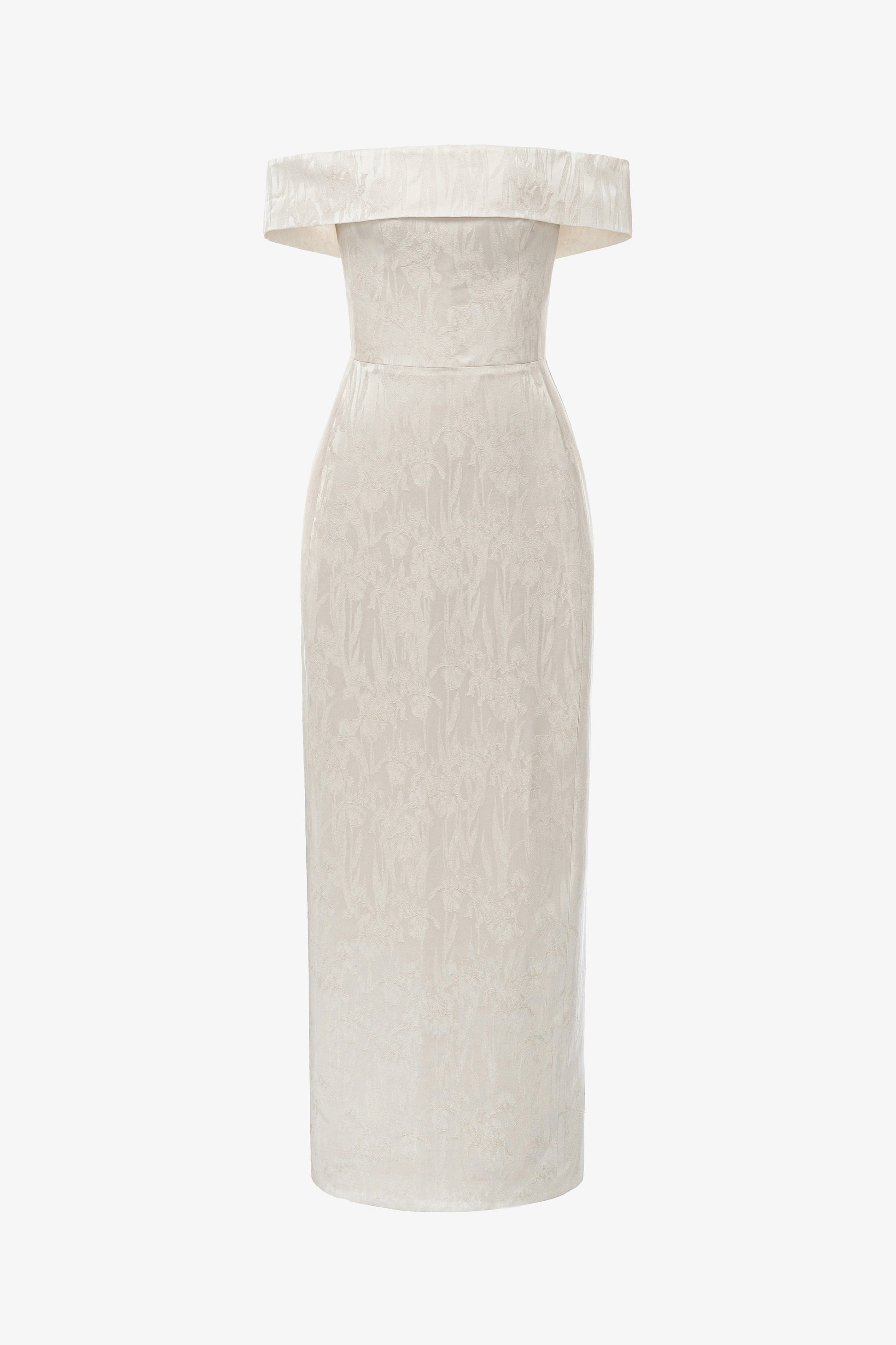 Modern pencil dress featuring a straight-across strapless neckline. The bodice is internally structured for support, while the exterior is panel-constructed for a sculpted look. Vertical seam lines run along both sides from bodice to hem, with additional back seams enhancing the elongated silhouette.