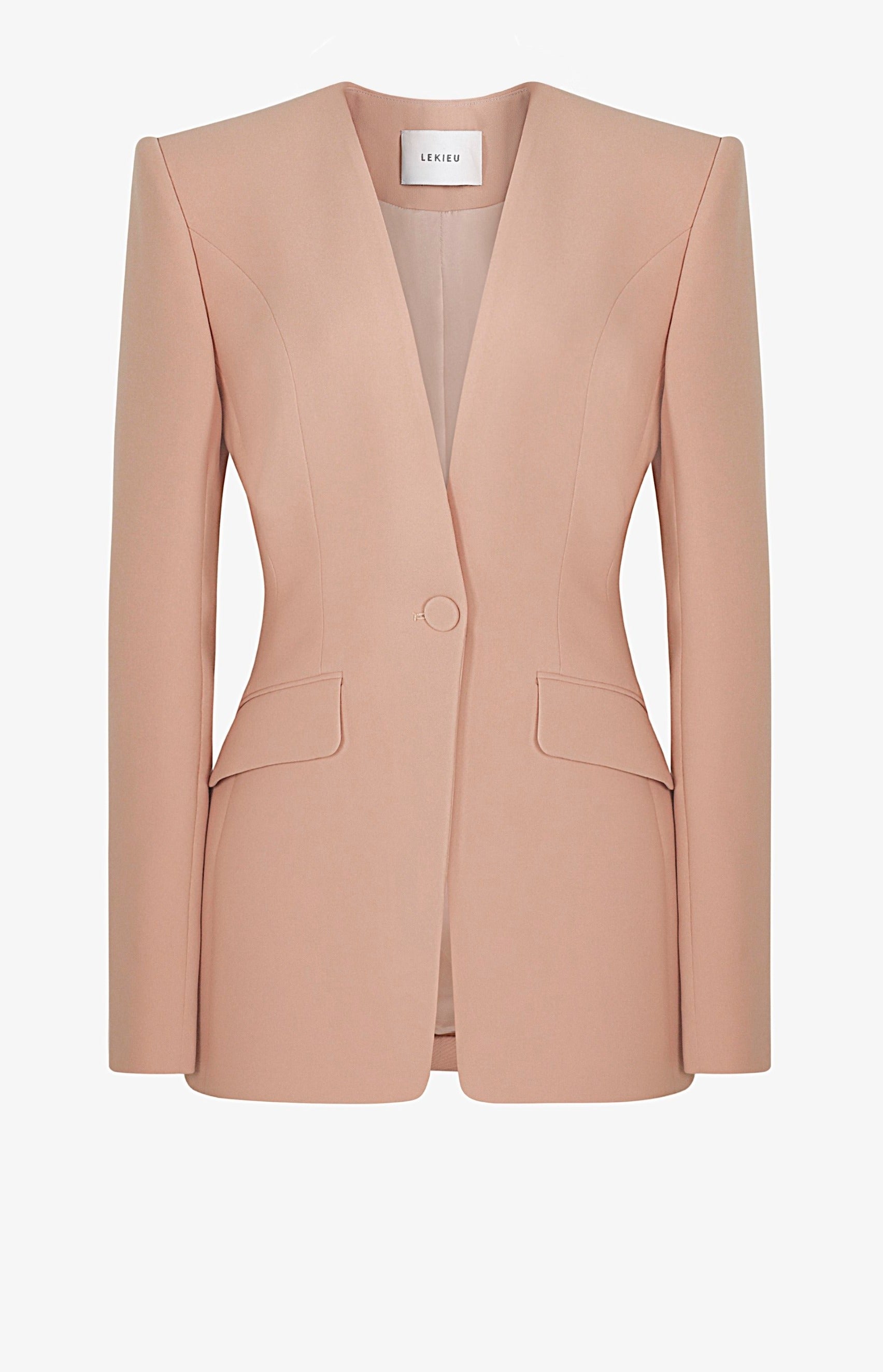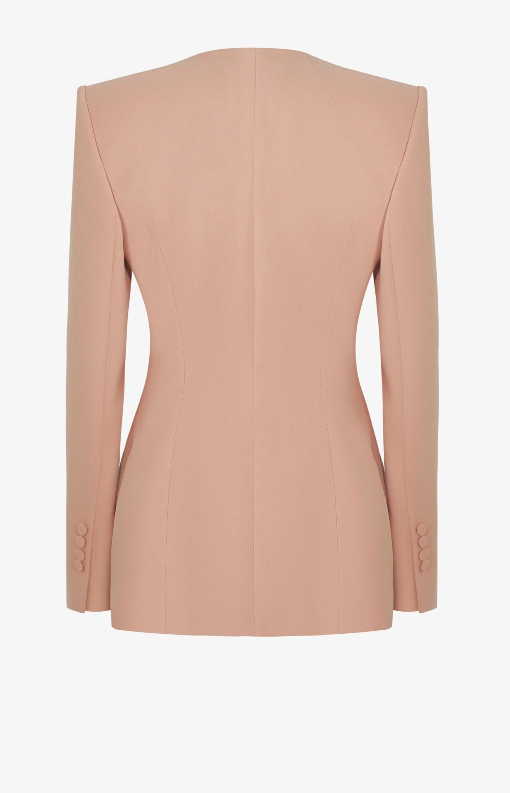 Vest with a fitted and flared shape, no collar, 1 button, 2-piece sleeves with buttoned cuffs. The front of the vest has 2 flap pockets.