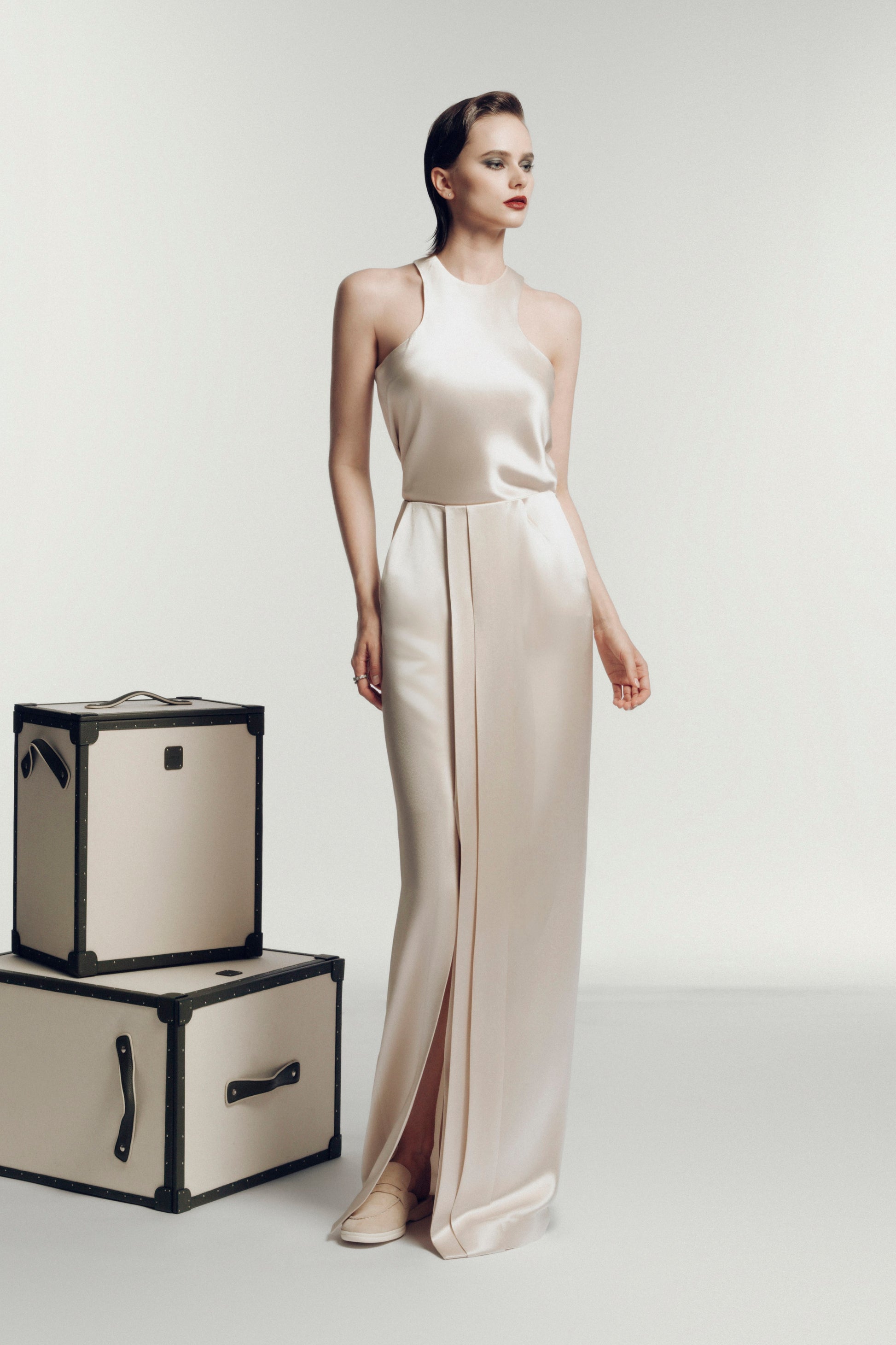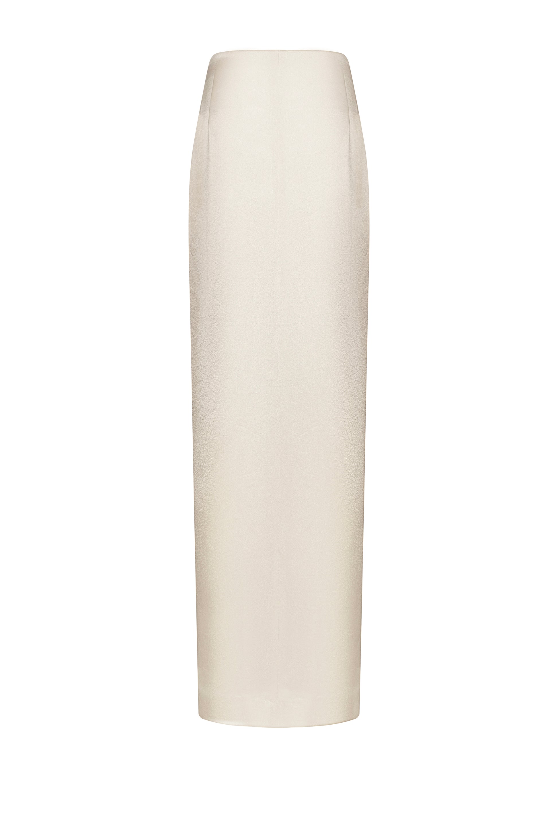 Low-rise long skirt with a seamless waistband. The front features an asymmetric overlay with two pleats of varying width at the edge, plus a soft diagonal pleat left open for added drape. Two diagonal pleats at the side seams enhance shaping. The back includes two classic darts. A front slit starting above the knee overlaps with the pleated panel for fluid movement and layered depth.
