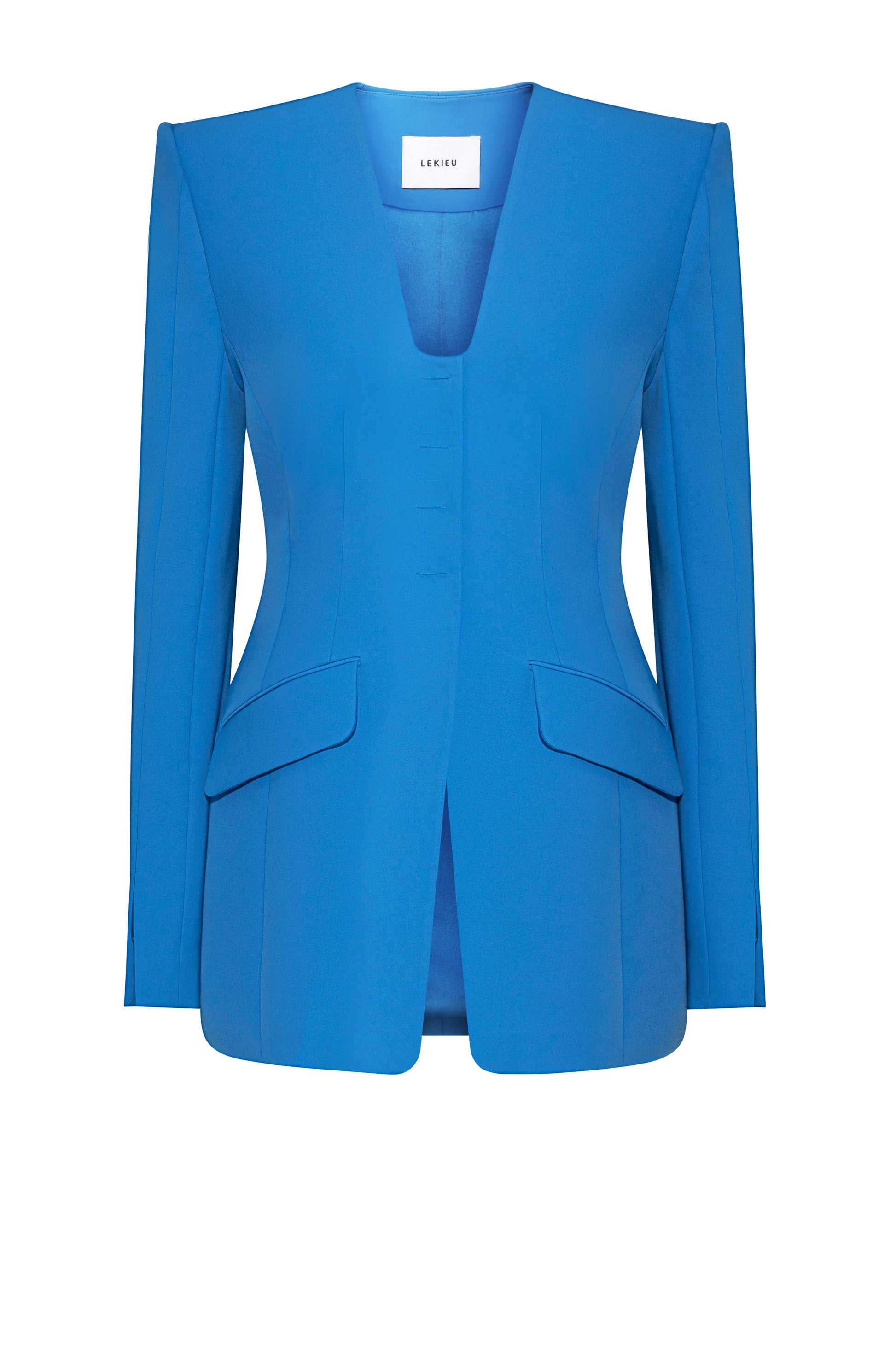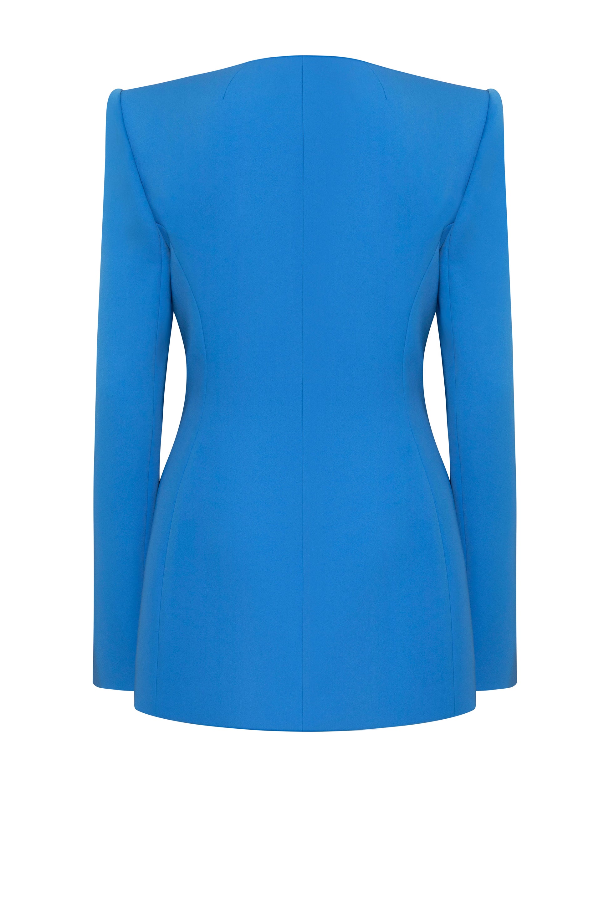 Tailored vest with a structured silhouette and a high U-shaped neckline above the bust. Features four snap buttons hidden between overlapping front panels, accented by a tonal horizontal embroidery line for subtle detailing. Front bodice includes two shaping darts and side panels with angled pockets. Hem is diagonally cut on both sides for a dynamic finish. The back features two darts and a center-back seam for structure. Sleeves are two-piece; the front sleeve includes an additional vertical seam as a stylized design element, finished with hand embroidery in place of buttons.