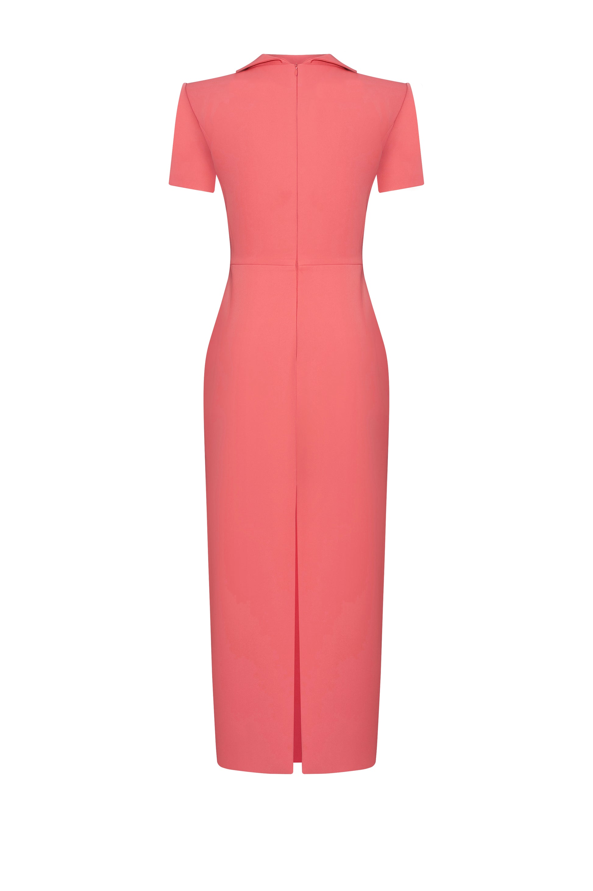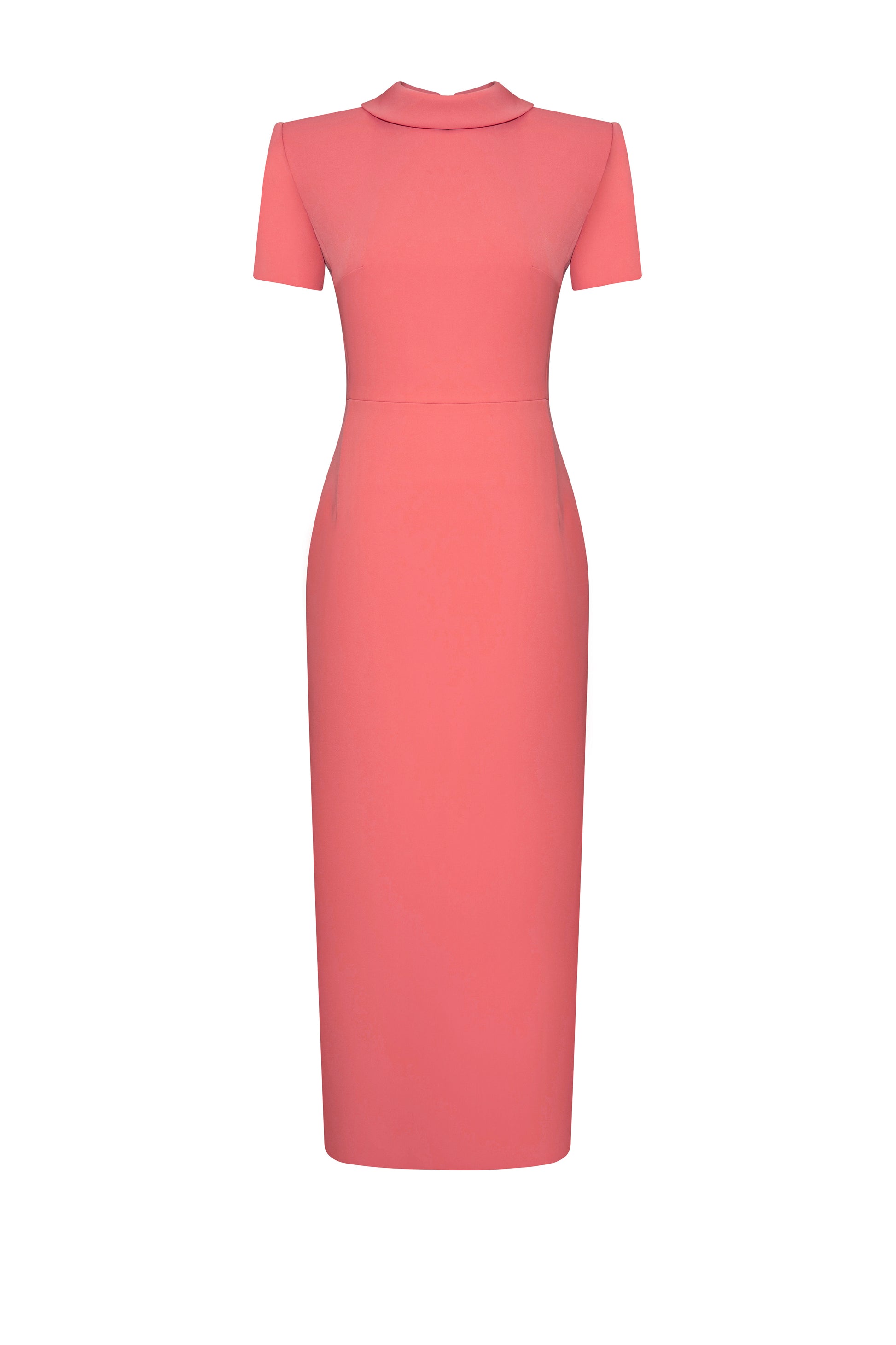 The pencil dress has off-the-shoulder sleeves with 2.5 cm shoulder pads and a collar with a folded-down design. The length reaches just below the calf. The collar is designed to stand up in the front, and the back has a slight adjustment that smooths into a soft, curved shape. The top of the dress is made with side seams connecting the front and back, while the lower part features two pleats in the front and back. The dress has a center back zipper with an overlapping slit.