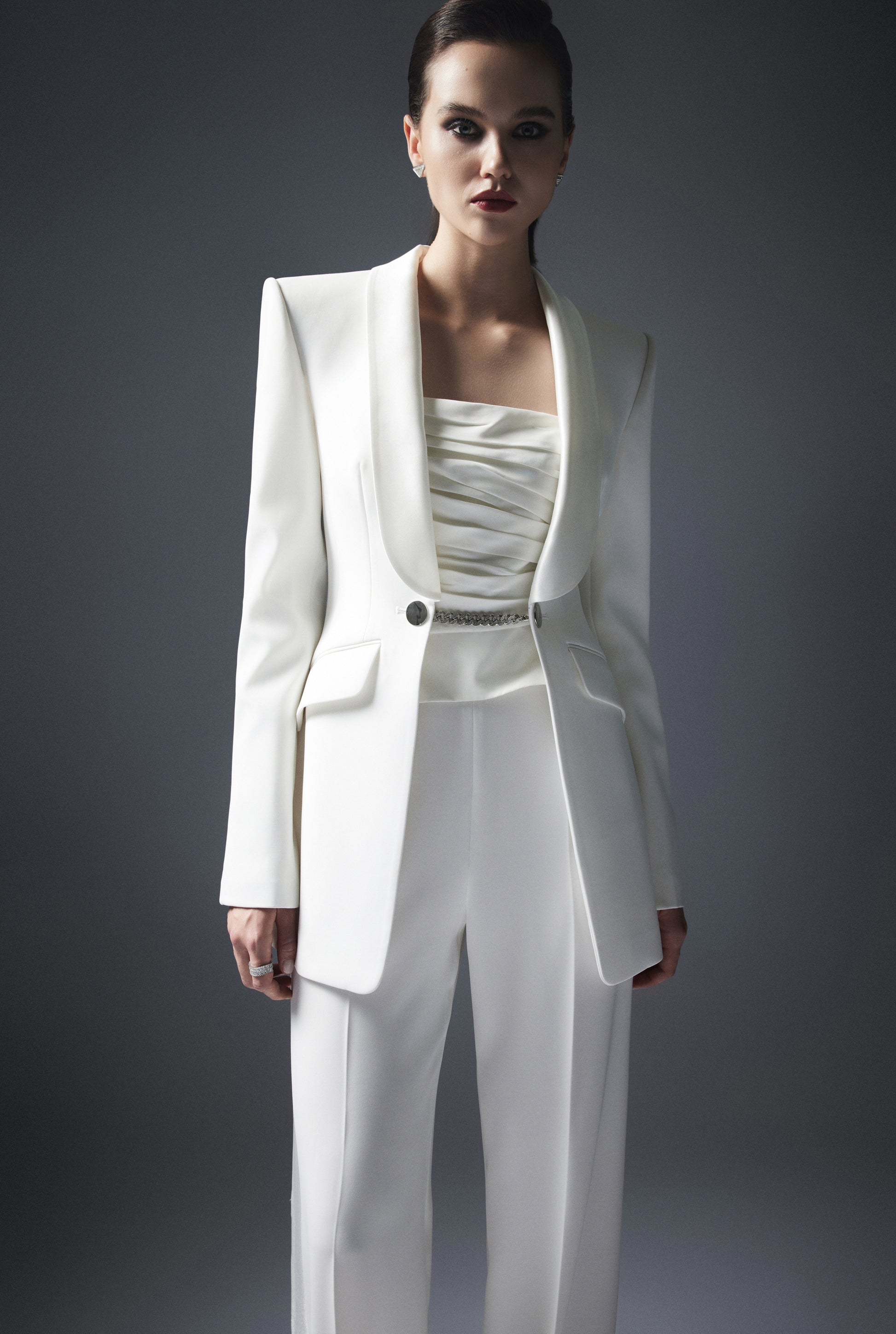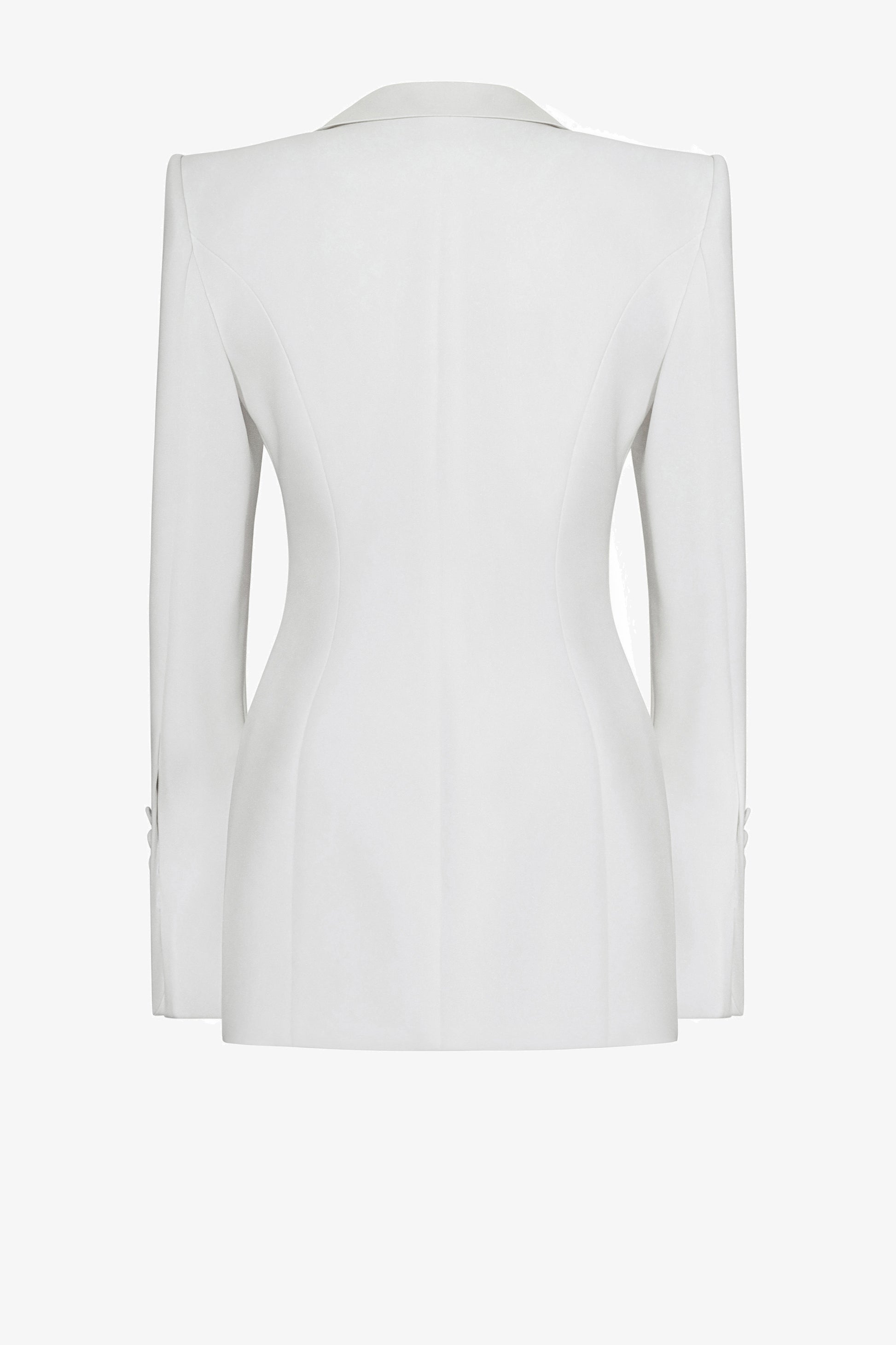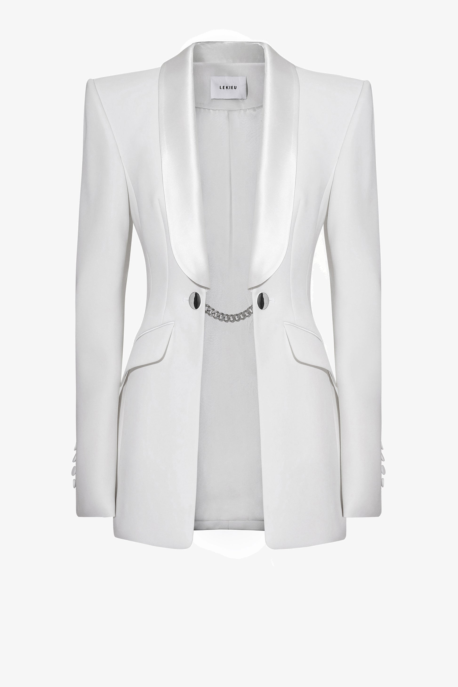 Fitted blazer: Features a satin notch collar and a chain closure. The front includes two darts and two angled flap pockets. The sleeves are designed with two parts and have four buttons covered in the same fabric as the blazer. The back has a center seam.