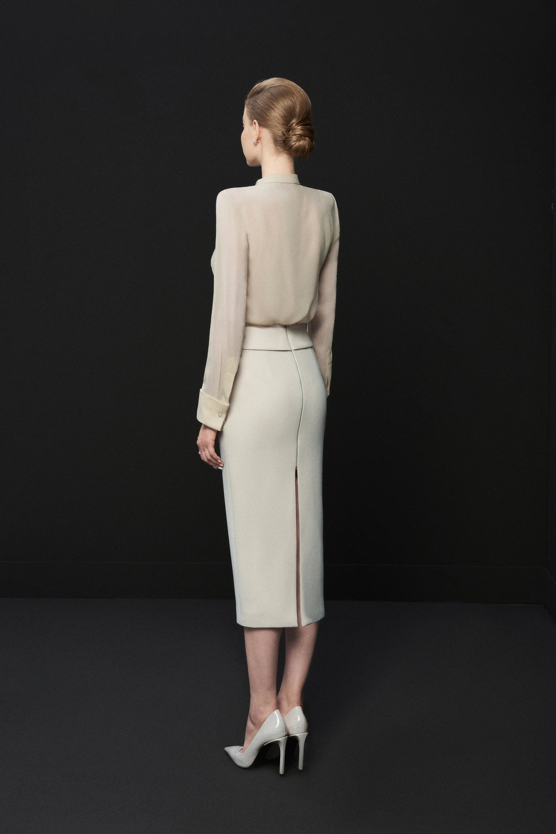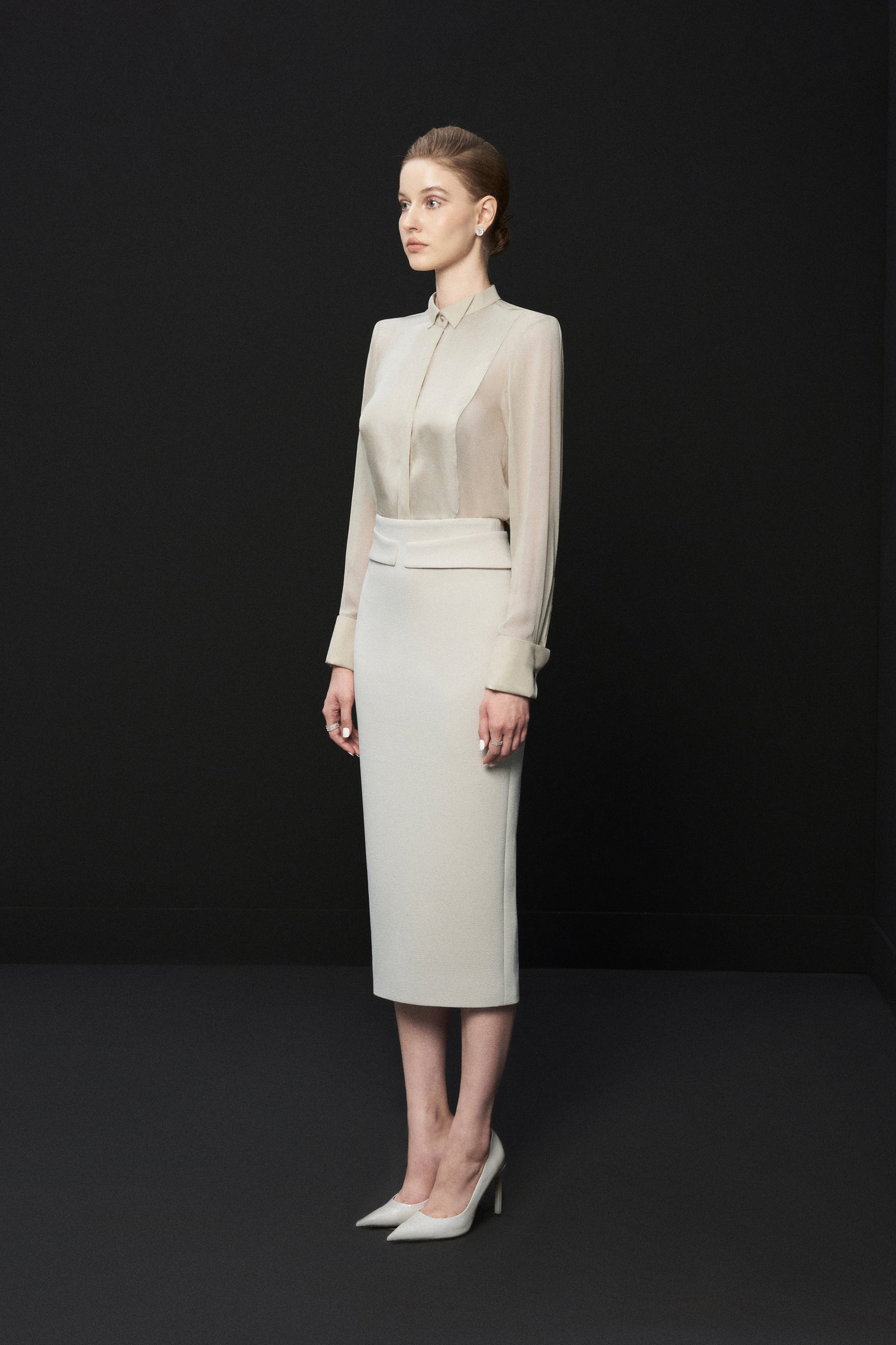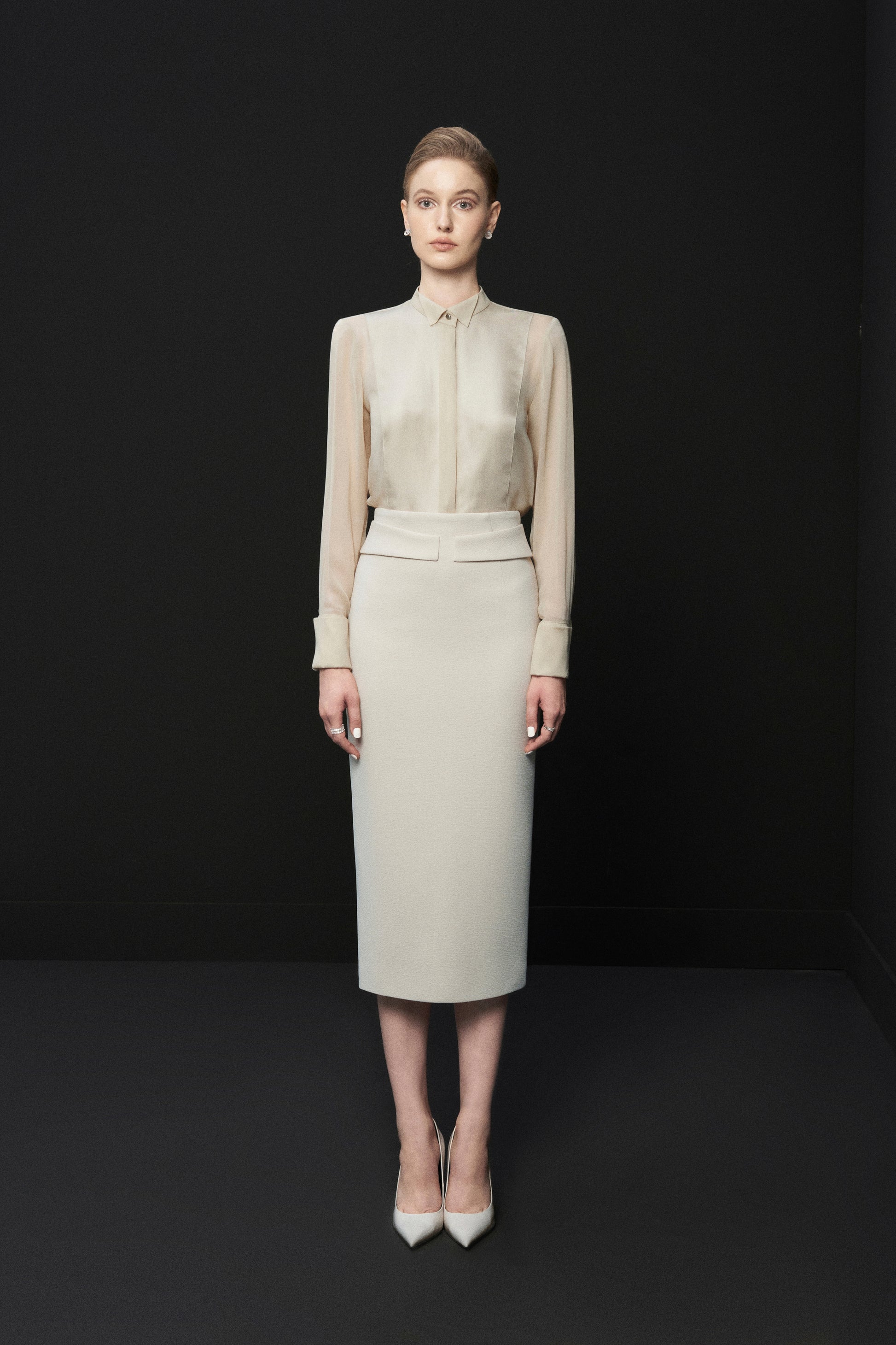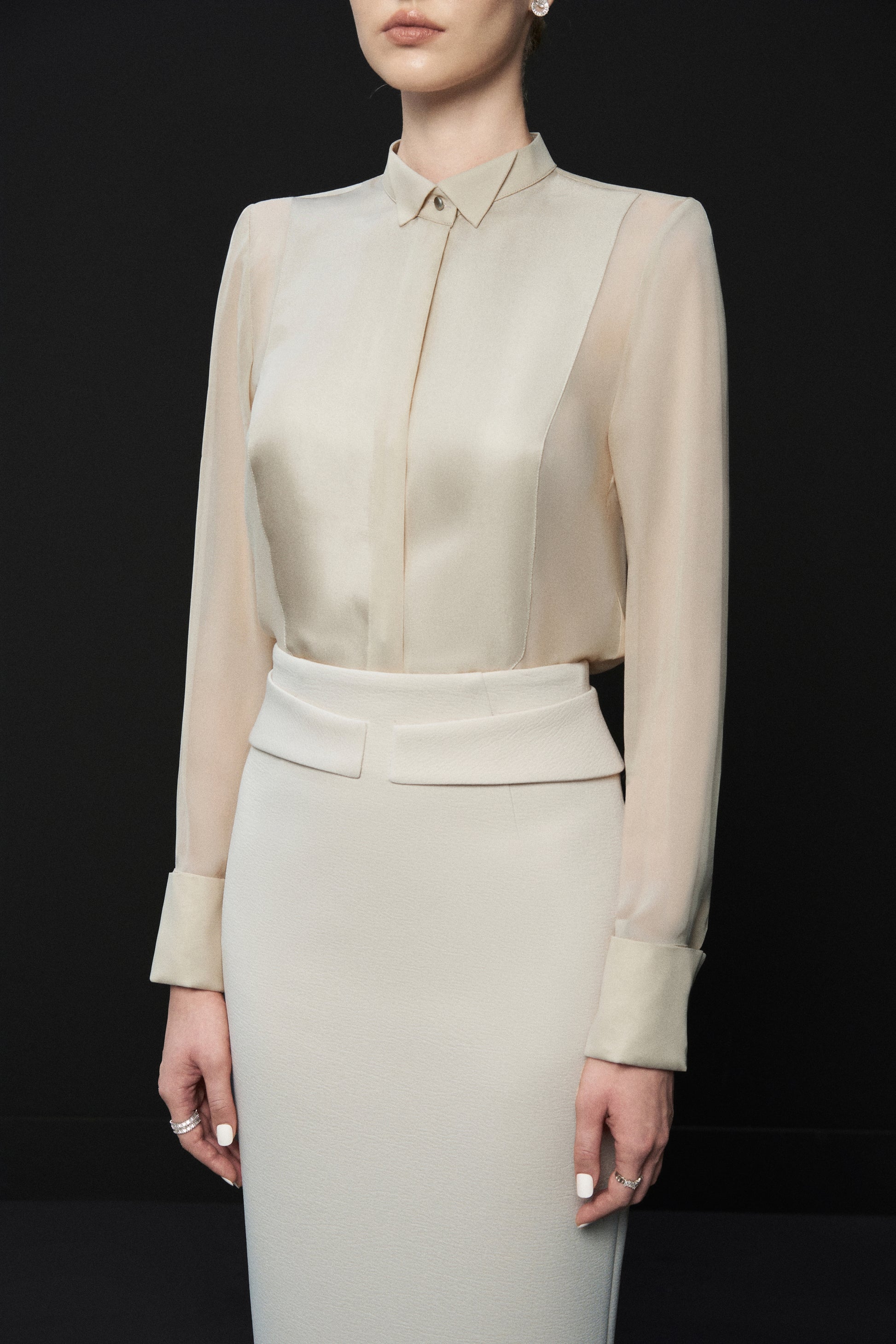 Possesses a wingtip collar design which is a classic style used by the elite very early on with expensive Tuxedos, the shirt exudes modern elegance and is still no less feminine with a soft twill silk material.
