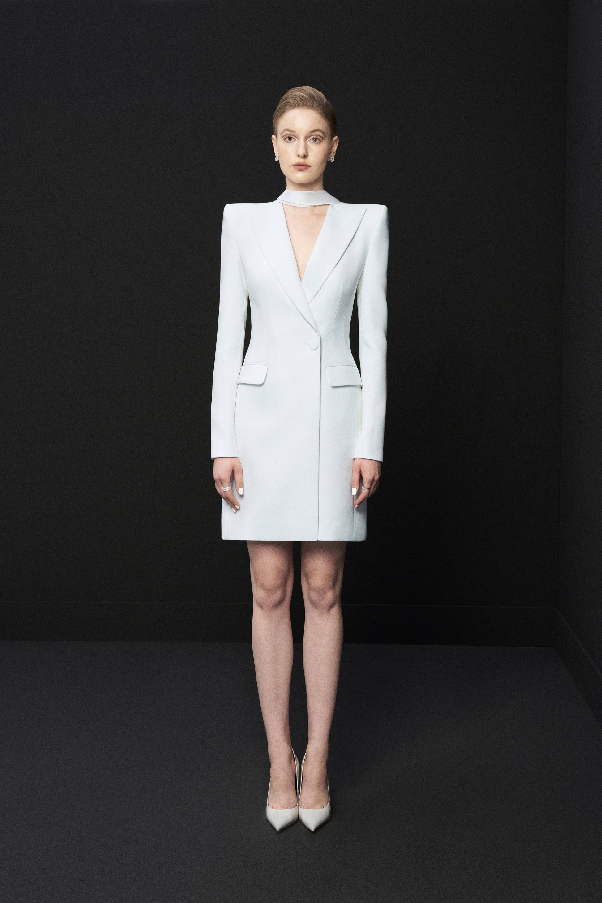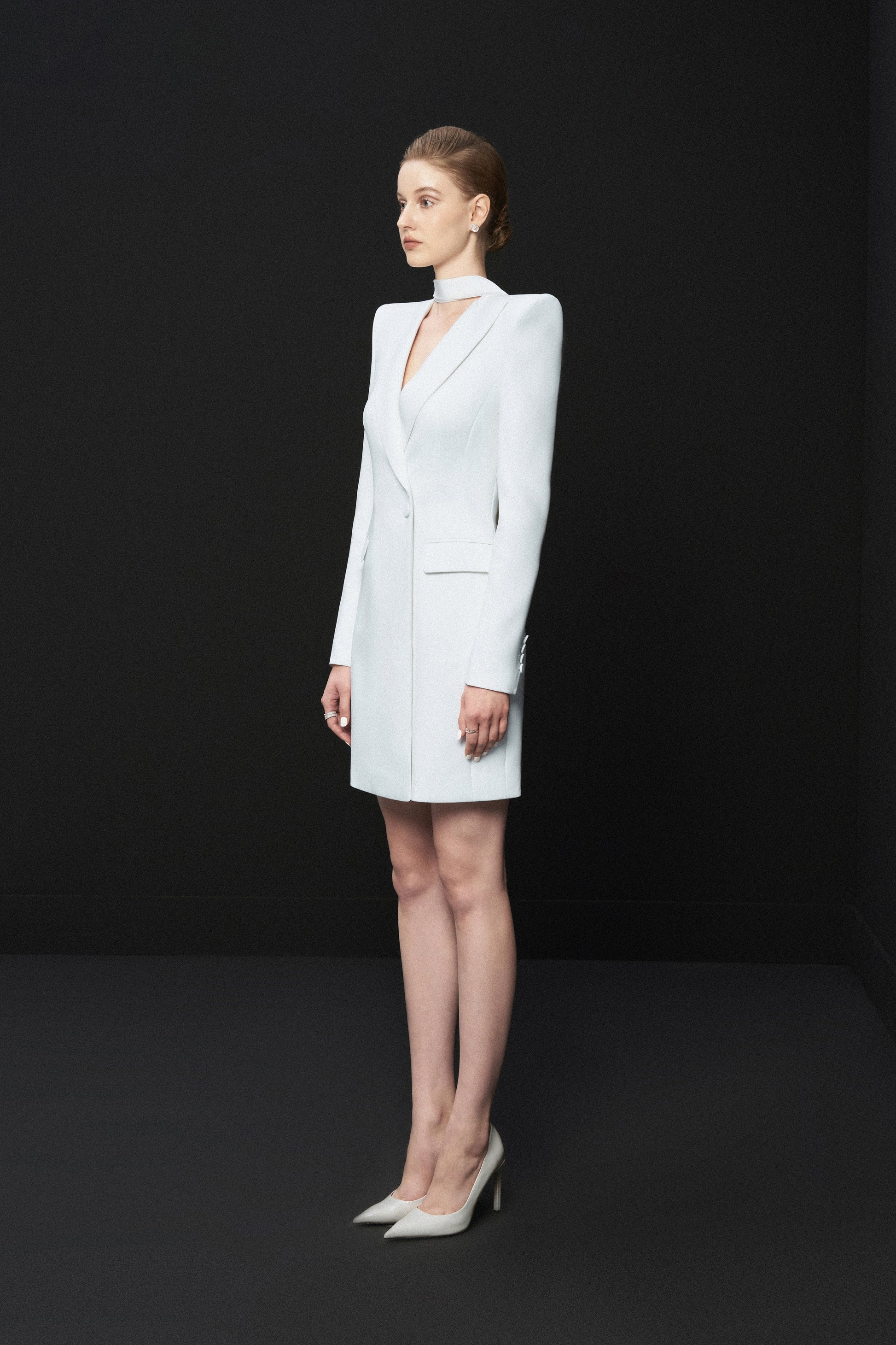 With a novelty blazer style design, the dress is like a harmonious combination between modern elegance and graceful feminity. On the classic white tone, the wide shoulder design makes the wearer even more luxurious and nobility.