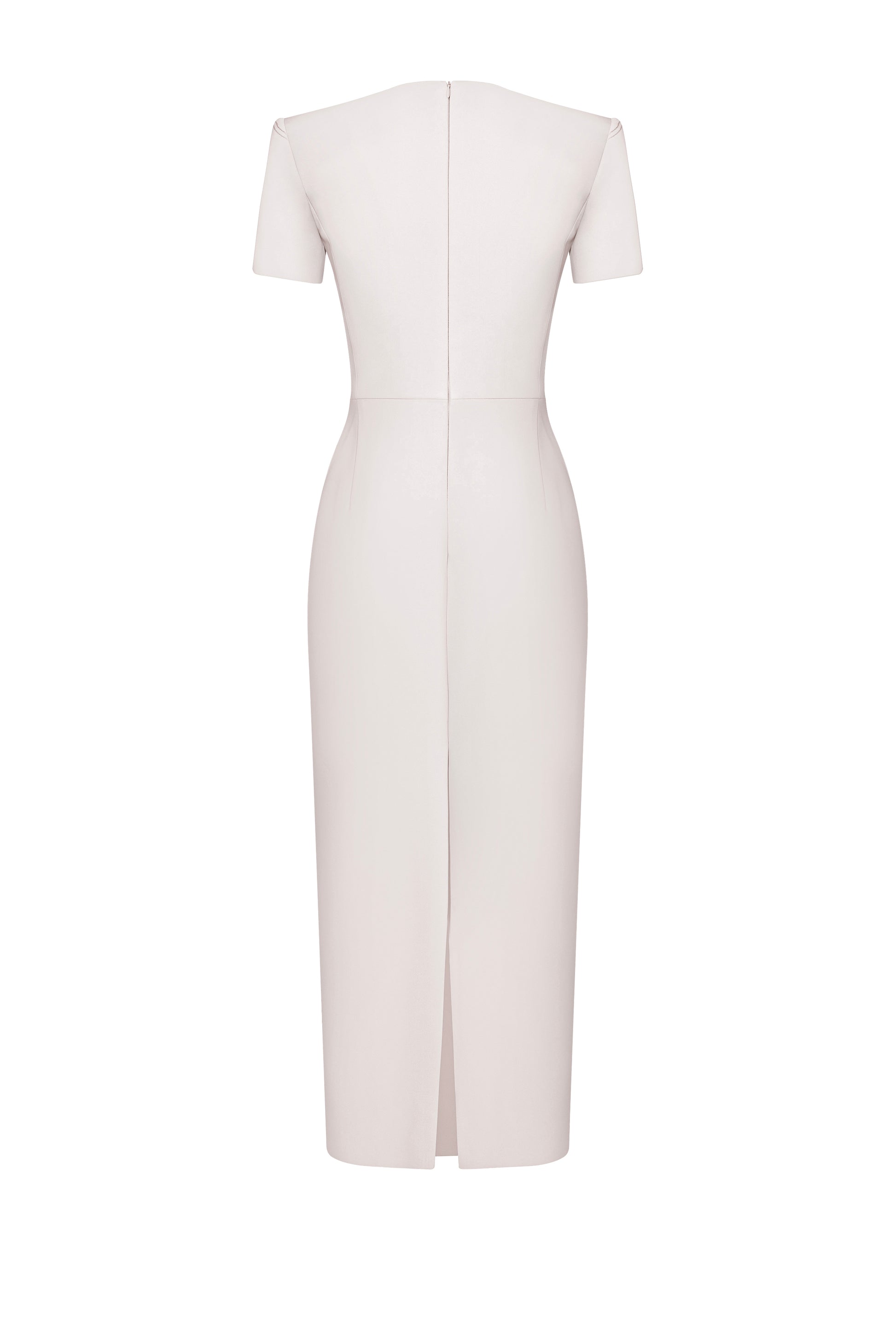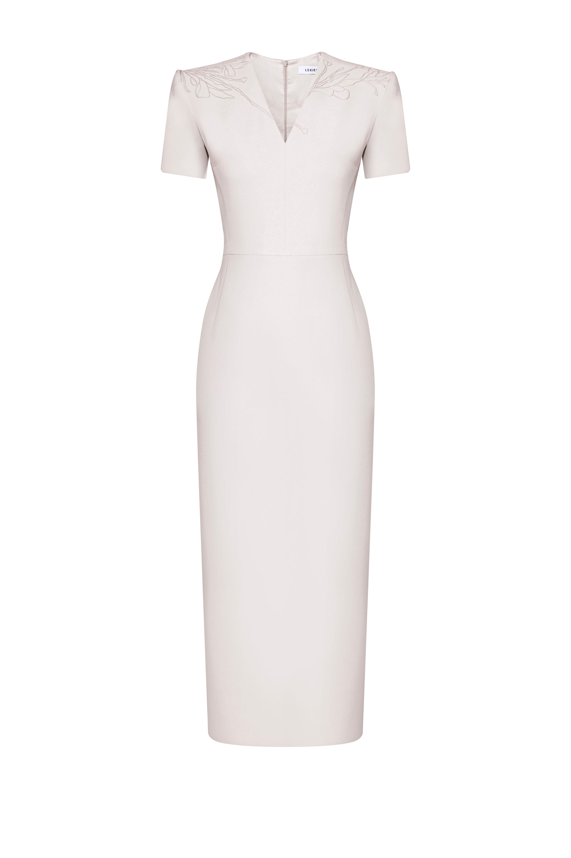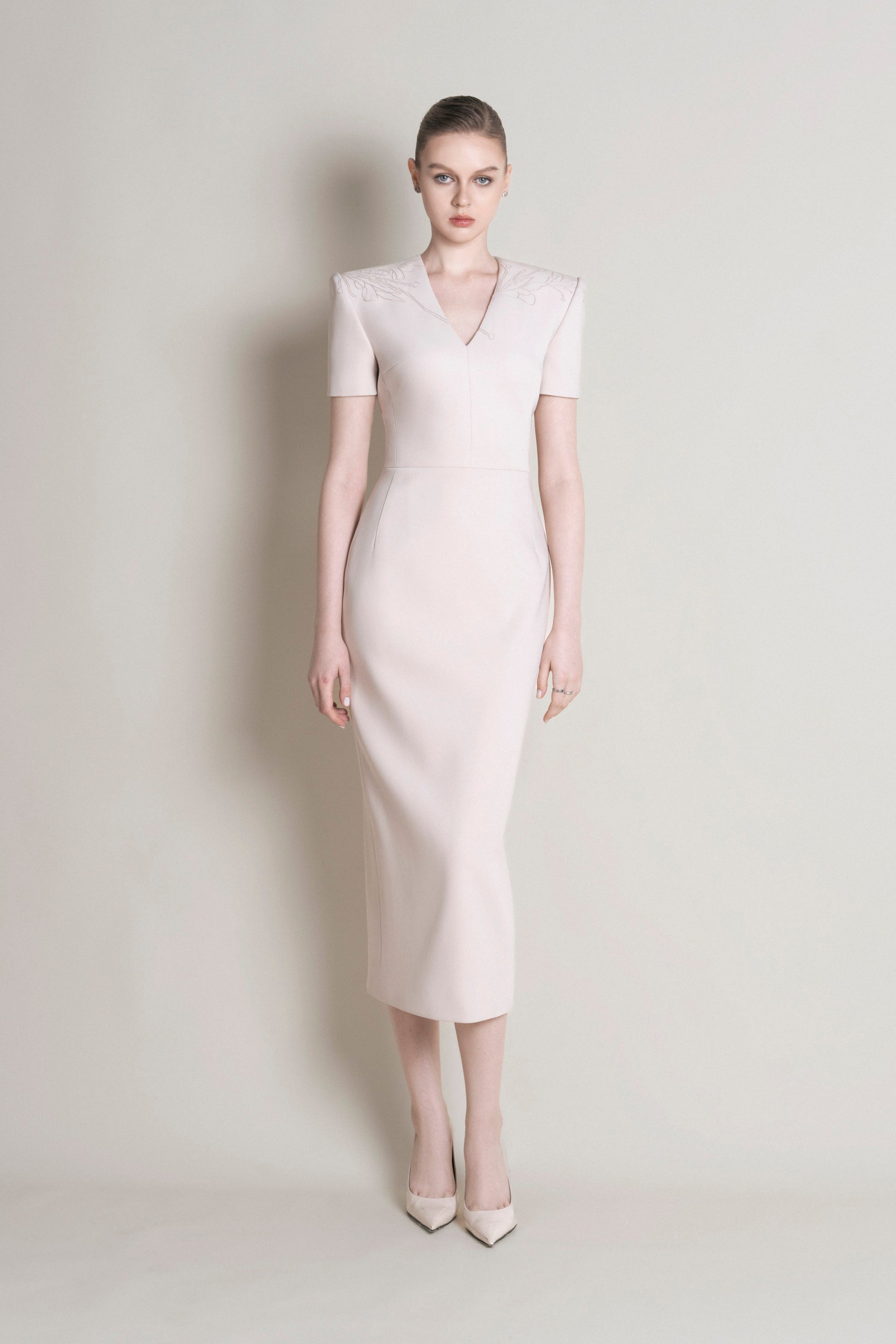 The pencil dress features off-the-shoulder sleeves, with 2.5cm shoulder pads, and extends to just below the calf. The V-neckline has a center seam. The body is constructed with side seams that seamlessly connect the front and back of the dress. The lower half of the skirt has two front pleats and two back pleats, with side seams at the lower body. The dress has a zipper at the back, with an overlapping slit. The dress is decorated with asymmetrical floral embroidery on the shoulder, adding an artistic touch.