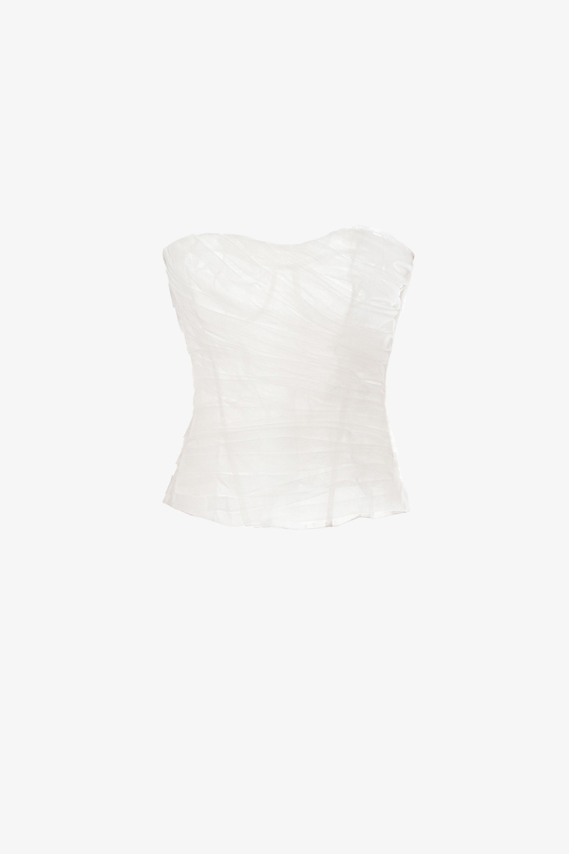 Corset bandeau top constructed with internal boning. Made from two layers of fine stretch mesh to ensure a close, body-contouring fit. The mesh is hand-pleated horizontally across the bodice, creating a sheer finish. Features a center-back closure.
