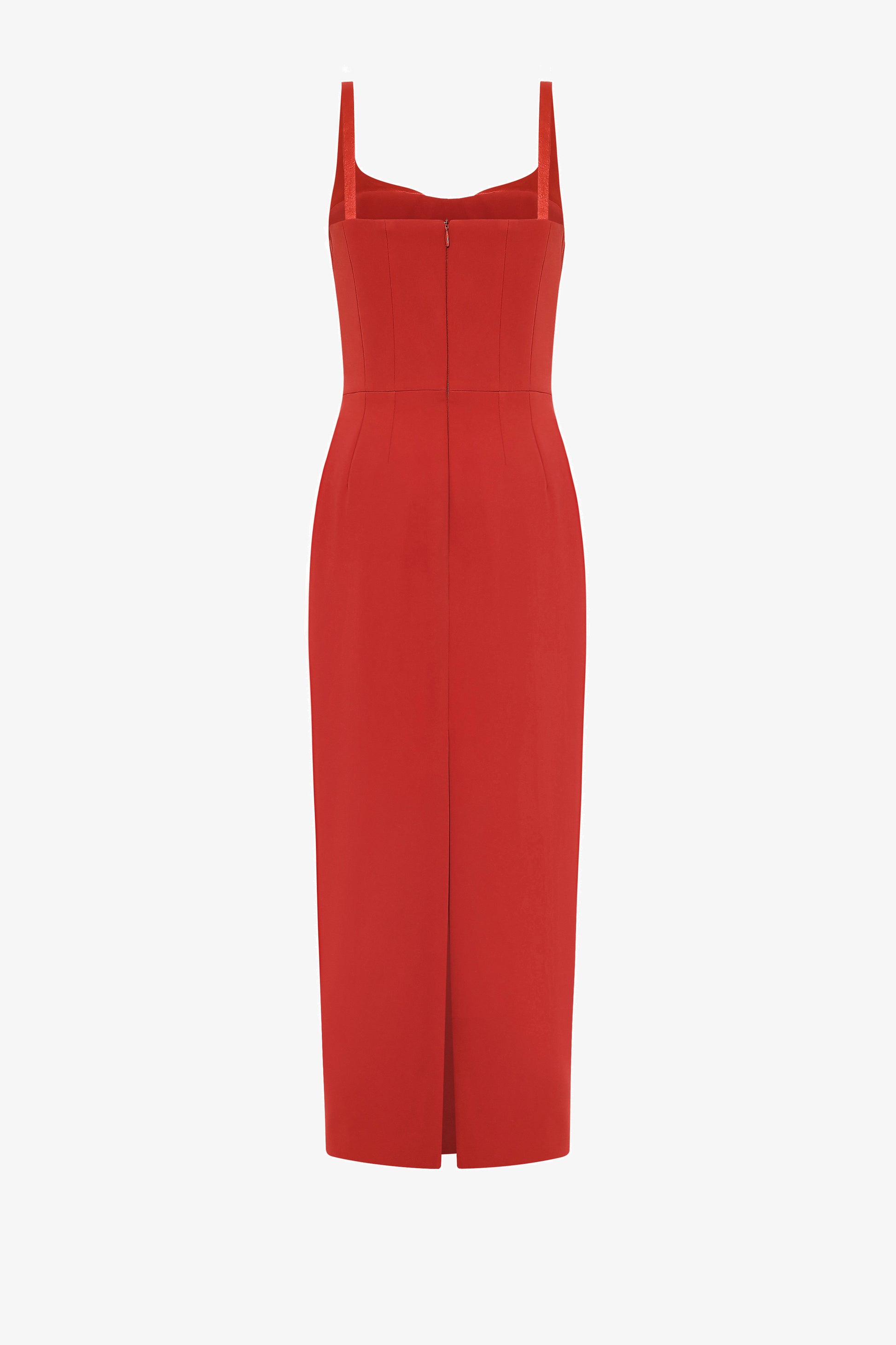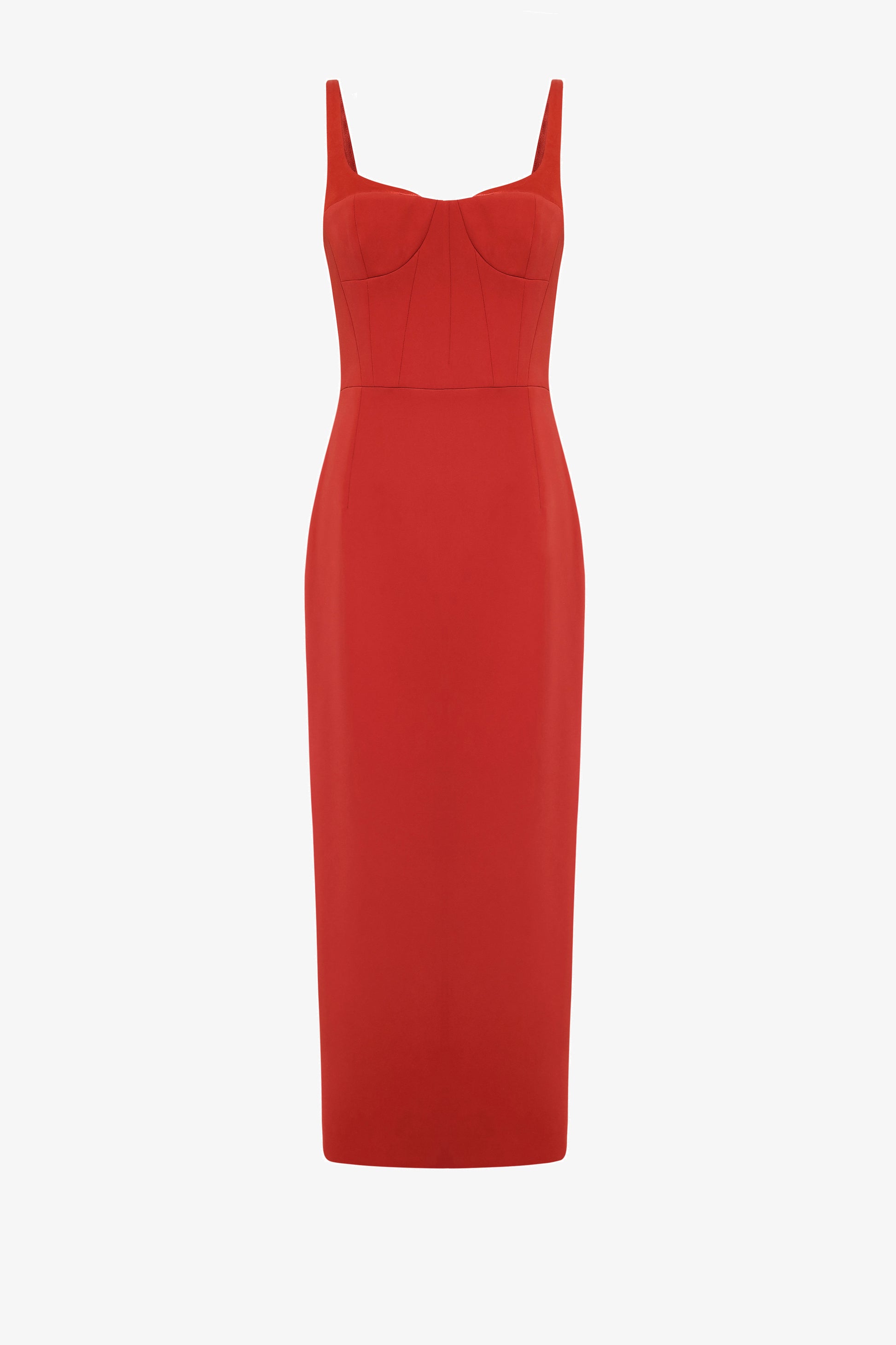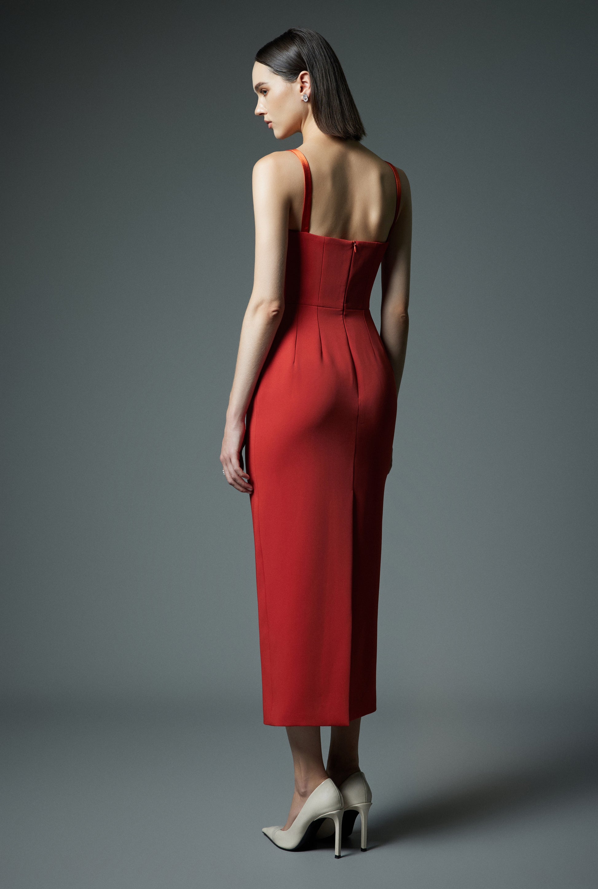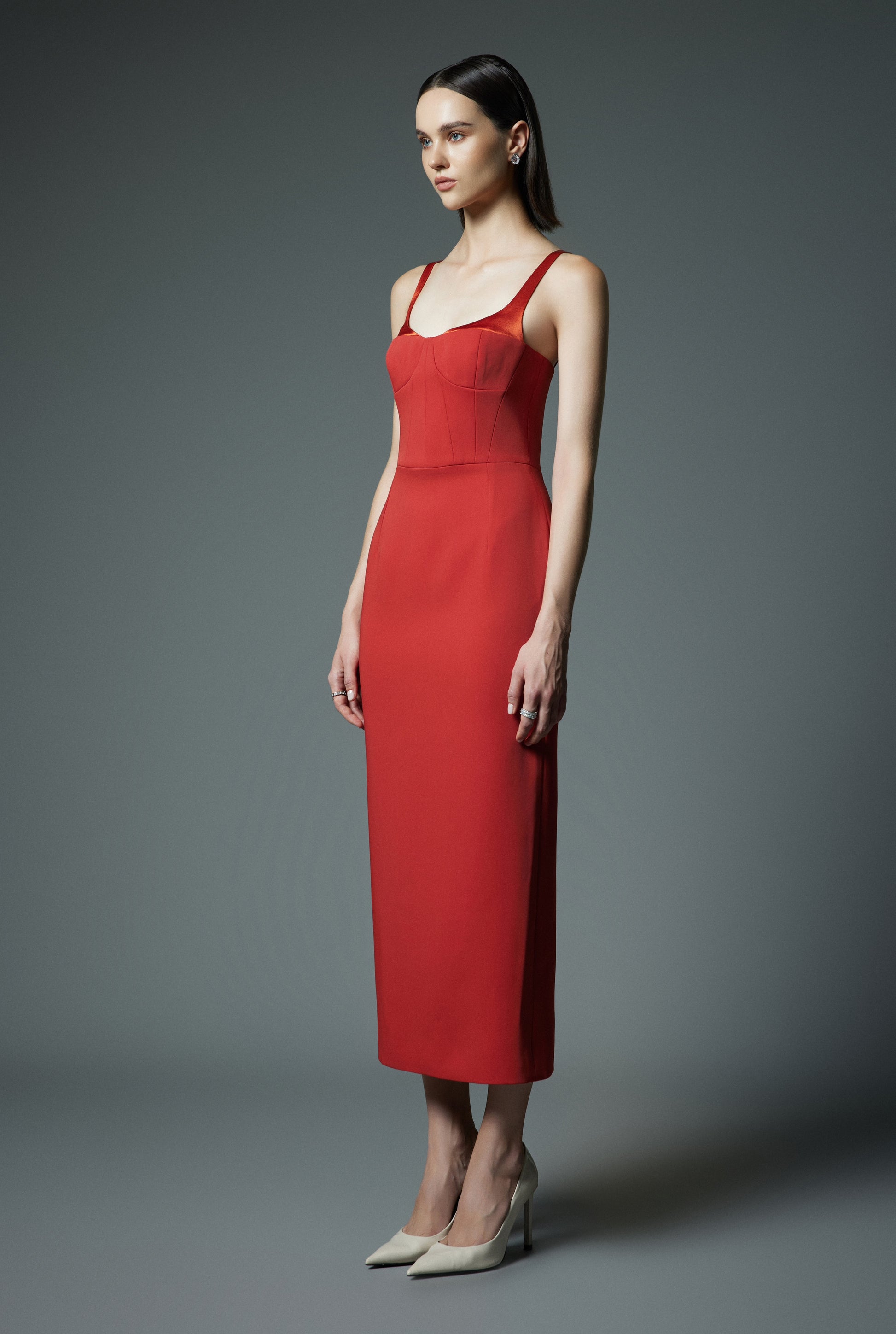 Evening gown with a pencil skirt extending below the calves, featuring two darts at the front and back. The waistline is defined by a seam. The upper body is designed in a corset style with a sweetheart neckline, structured with boning, and the straps are made of satin fabric. The dress has a center back zipper and an overlapping slit.