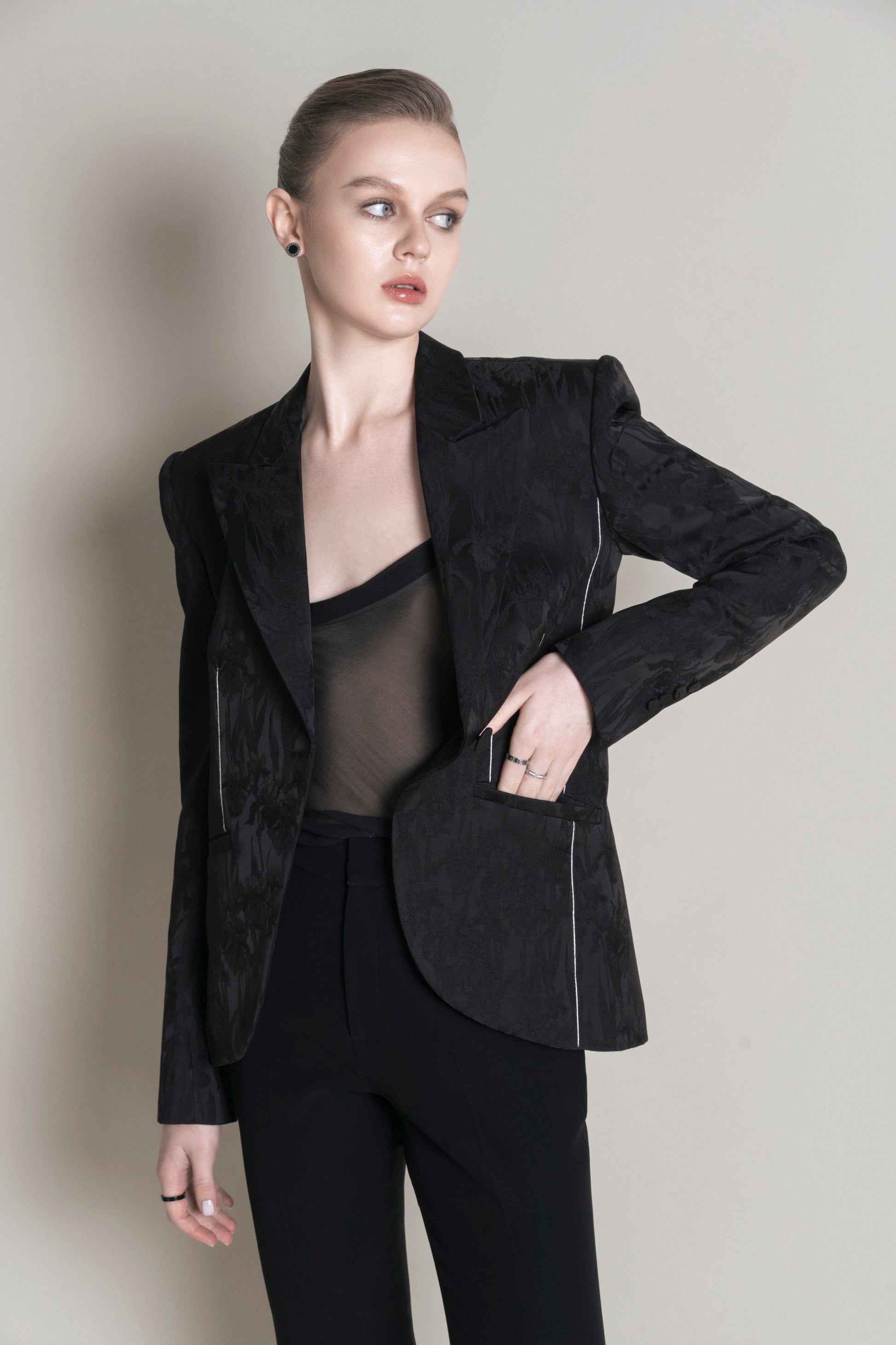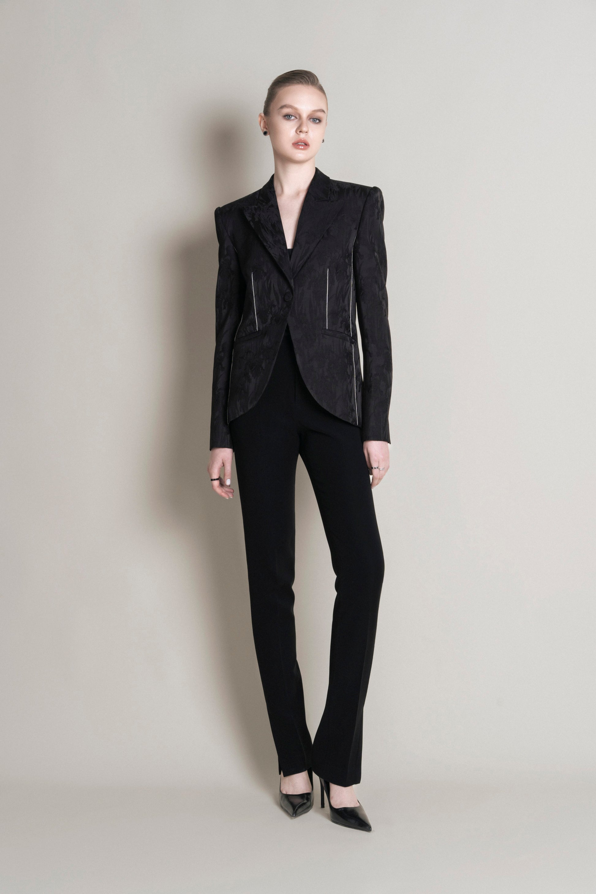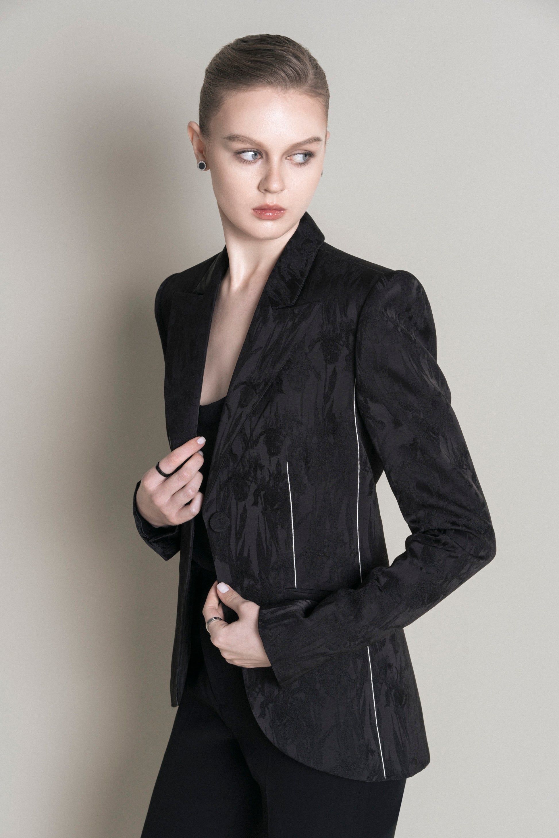 The short-waisted, relaxed vest features a single button and a notched collar, with the sides rounded outward to give a more youthful, relaxed feel. Made from satin, the vest showcases an embossed Irish floral pattern, adding texture on the glossy fabric that creates a fresh effect from different light angles. The sleeves are embellished with four covered buttons in the same fabric. The vest includes two patch pockets, and the dart seams are embroidered with white thread, providing an accent to the design.