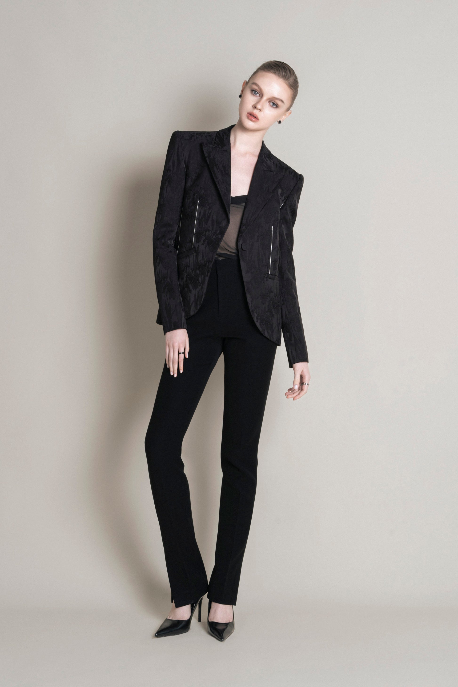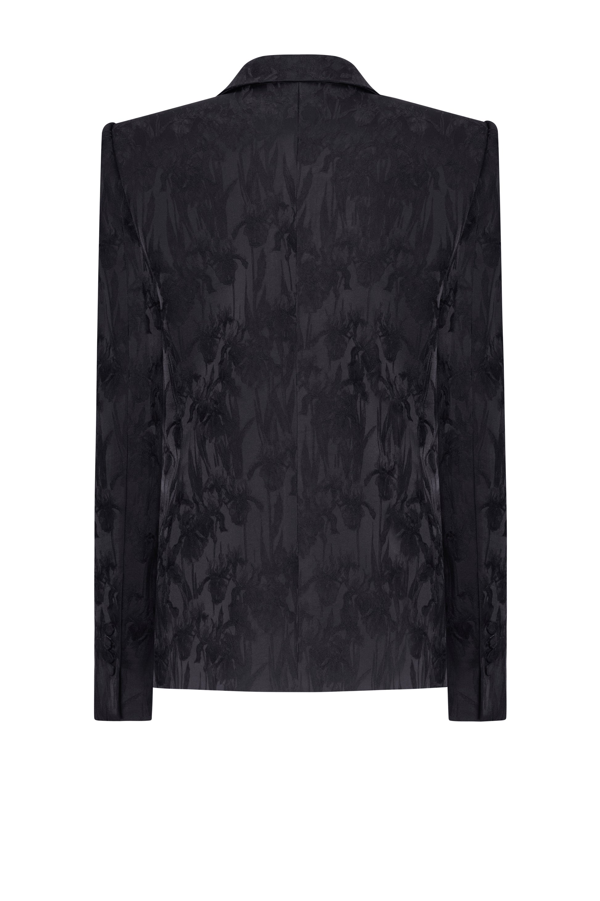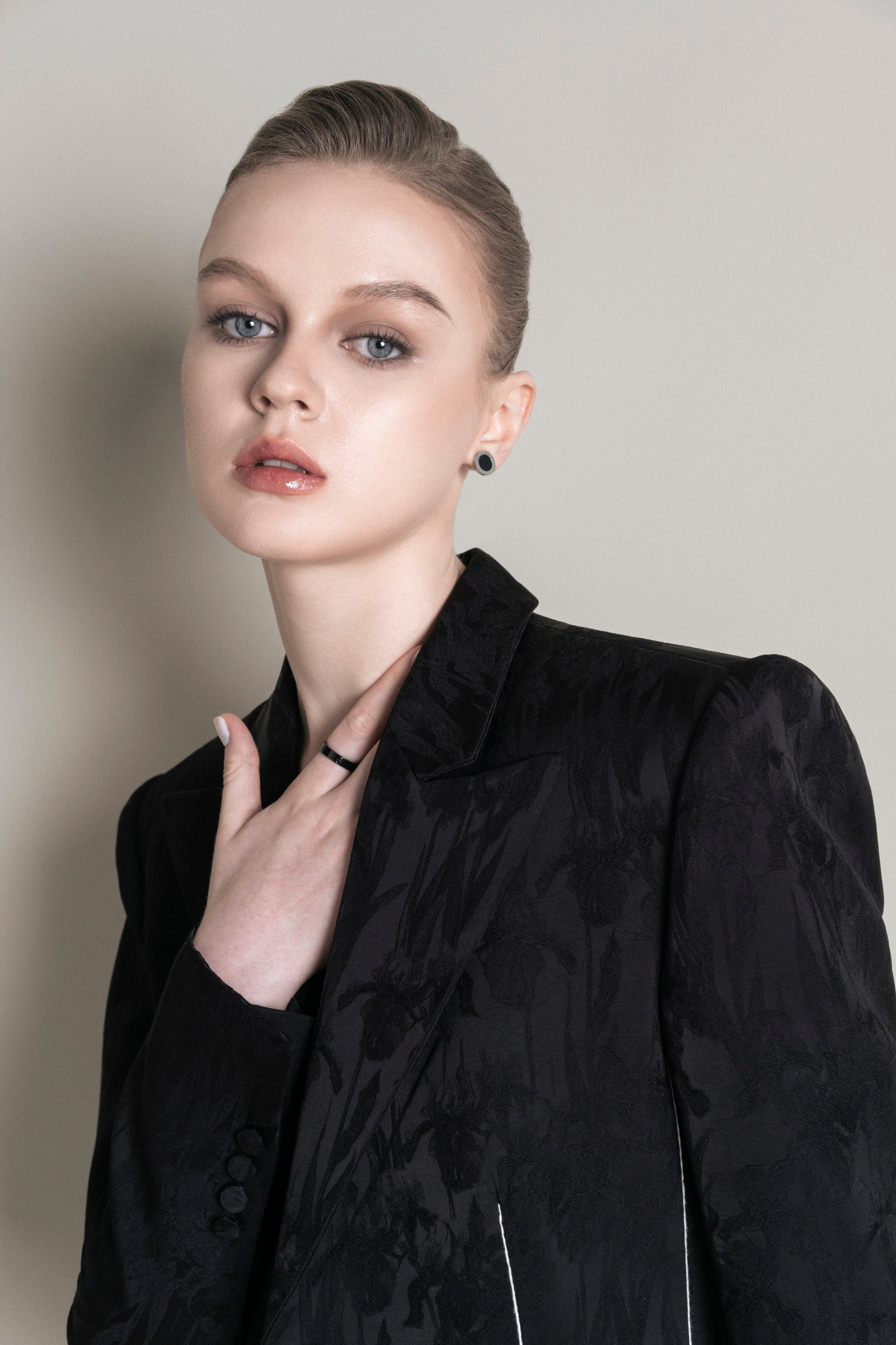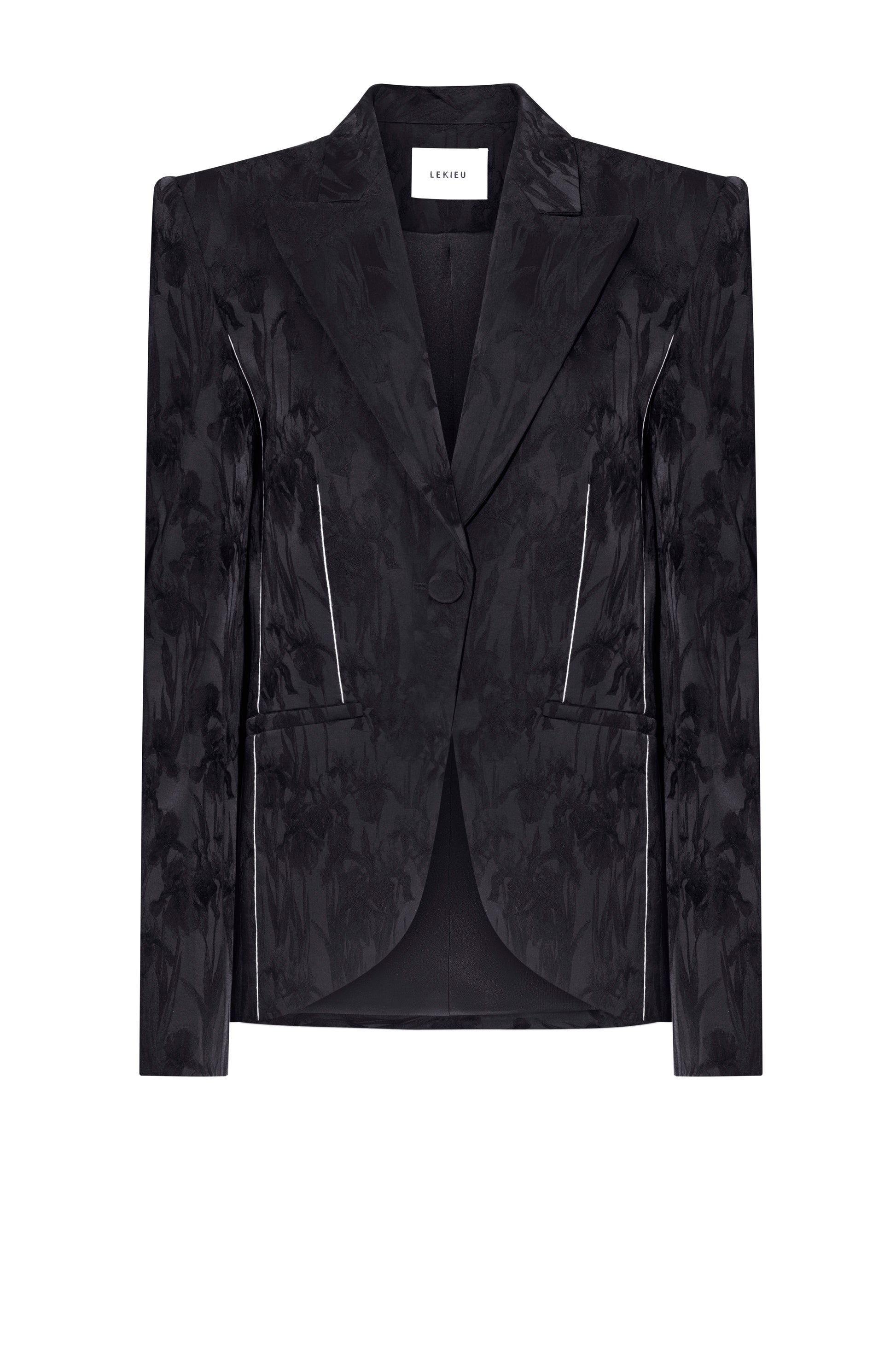 The short-waisted, relaxed vest features a single button and a notched collar, with the sides rounded outward to give a more youthful, relaxed feel. Made from satin, the vest showcases an embossed Irish floral pattern, adding texture on the glossy fabric that creates a fresh effect from different light angles. The sleeves are embellished with four covered buttons in the same fabric. The vest includes two patch pockets, and the dart seams are embroidered with white thread, providing an accent to the design.