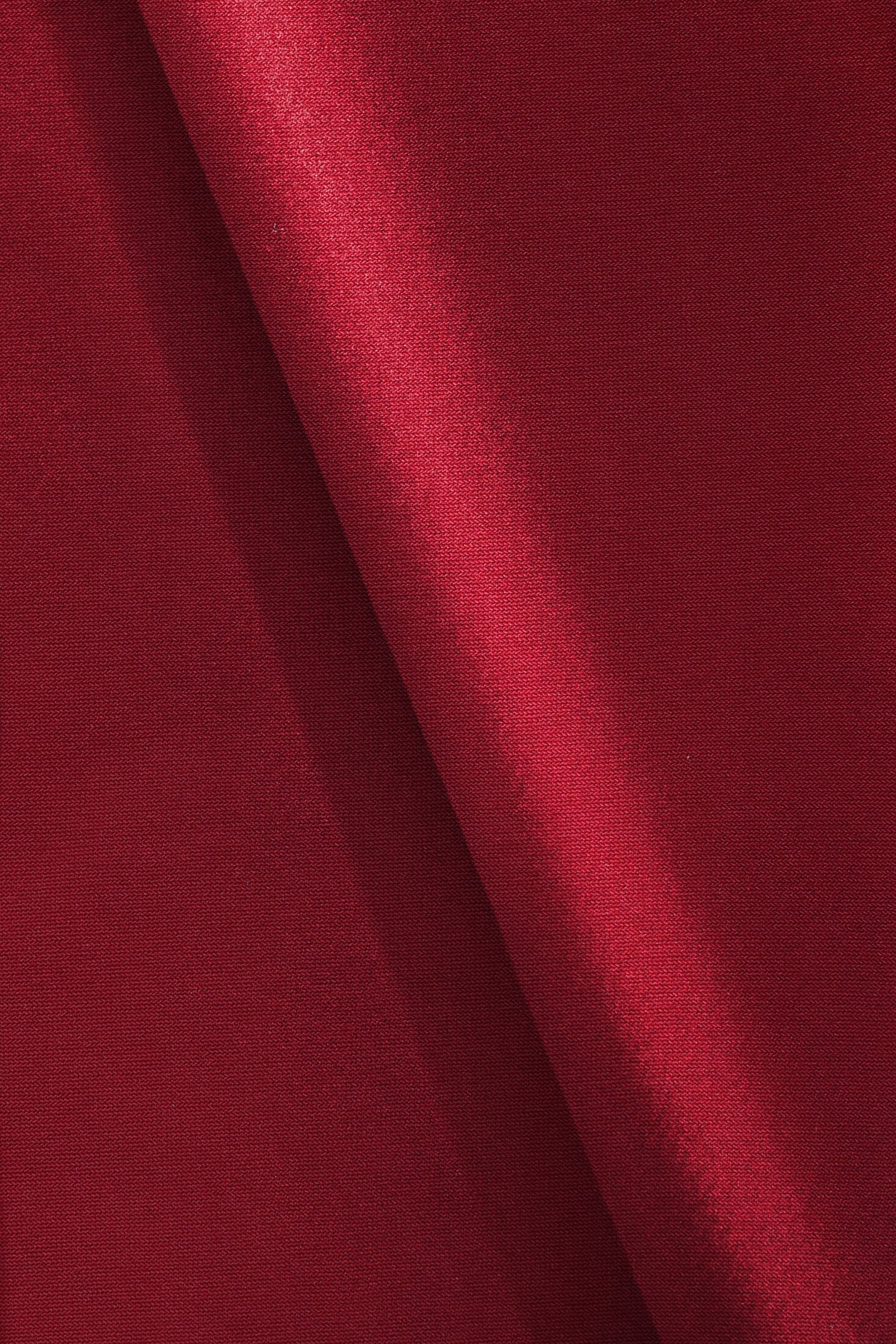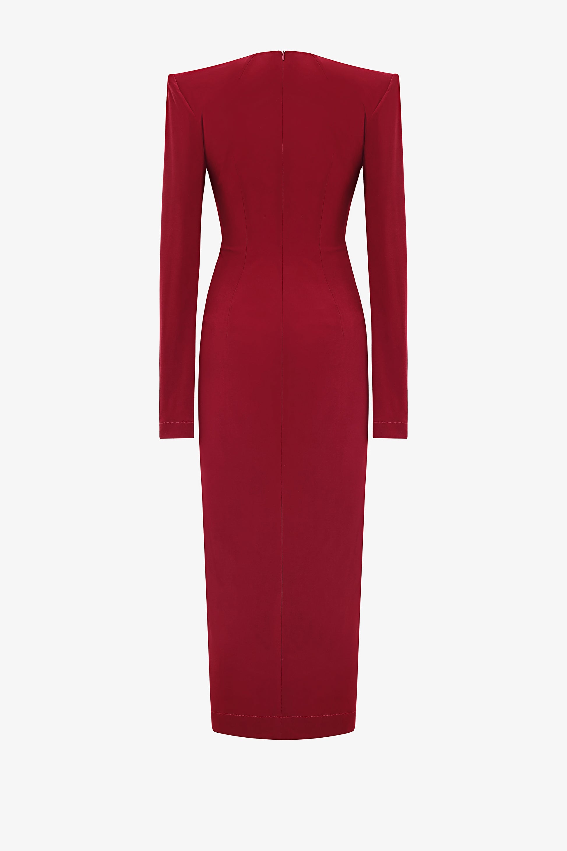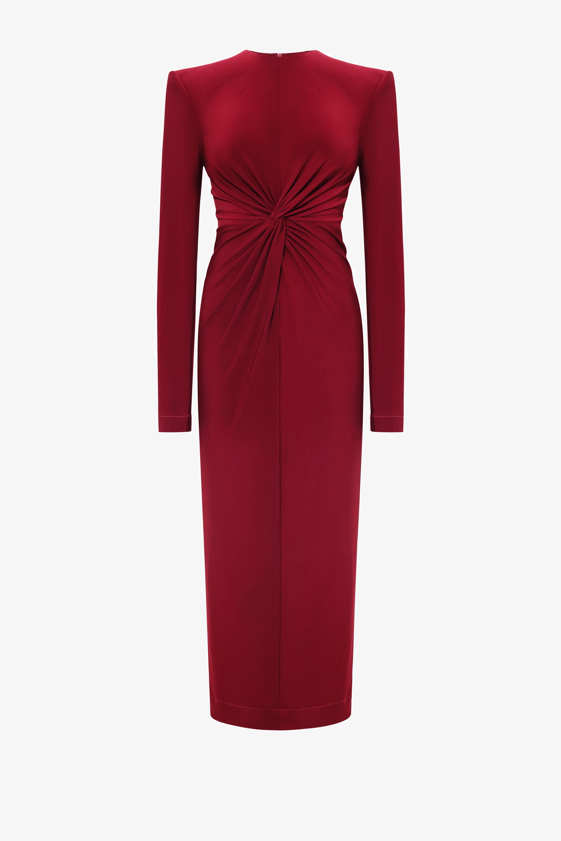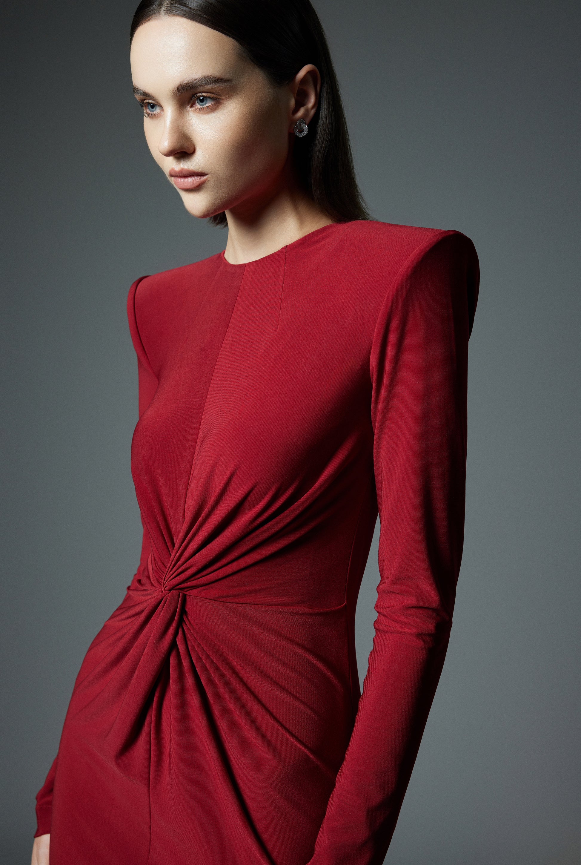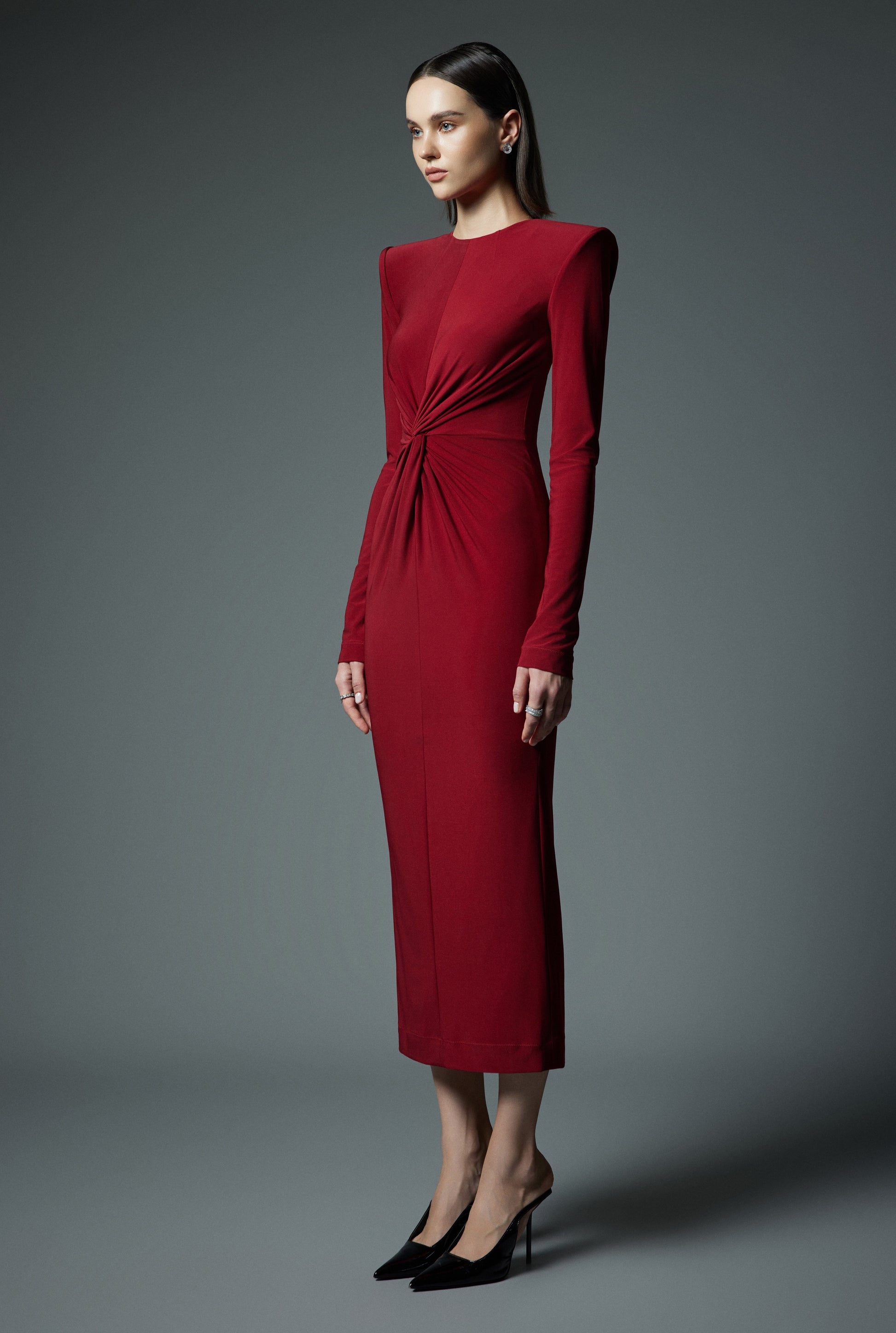 Body-hugging dress extending below the calves. It has broad shoulders, a twisted front detail creating pleats, and two darts on the upper and lower back. The dress features a round neckline, long sleeves, and a center back zipper