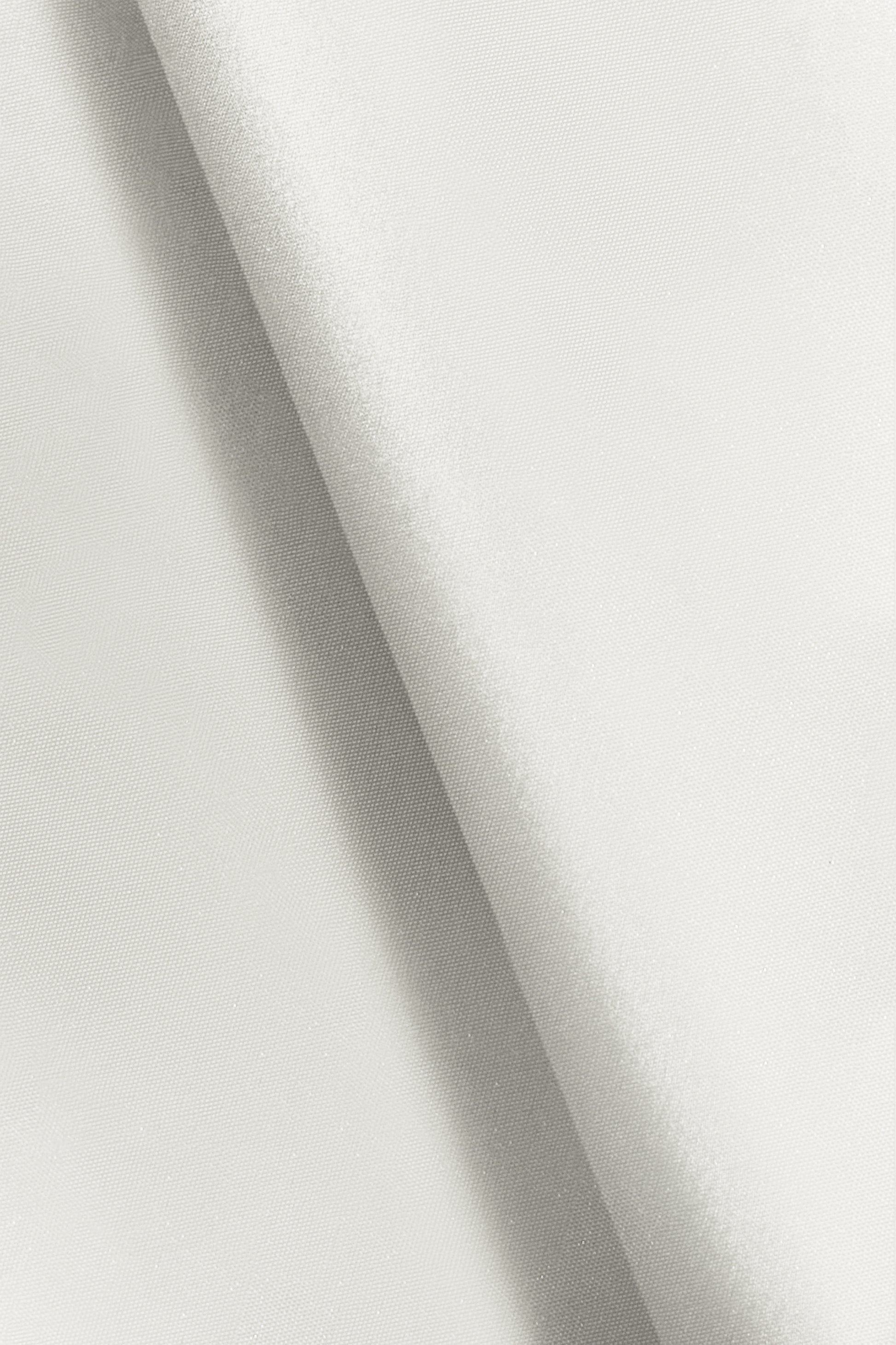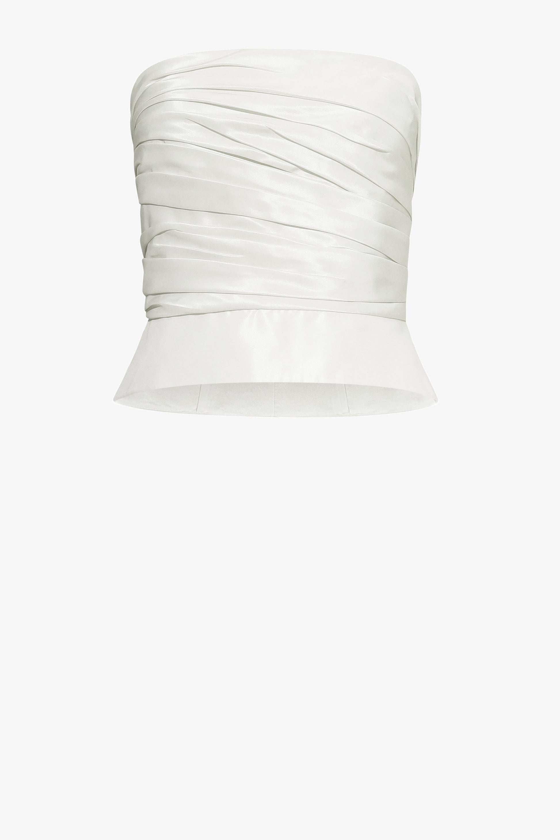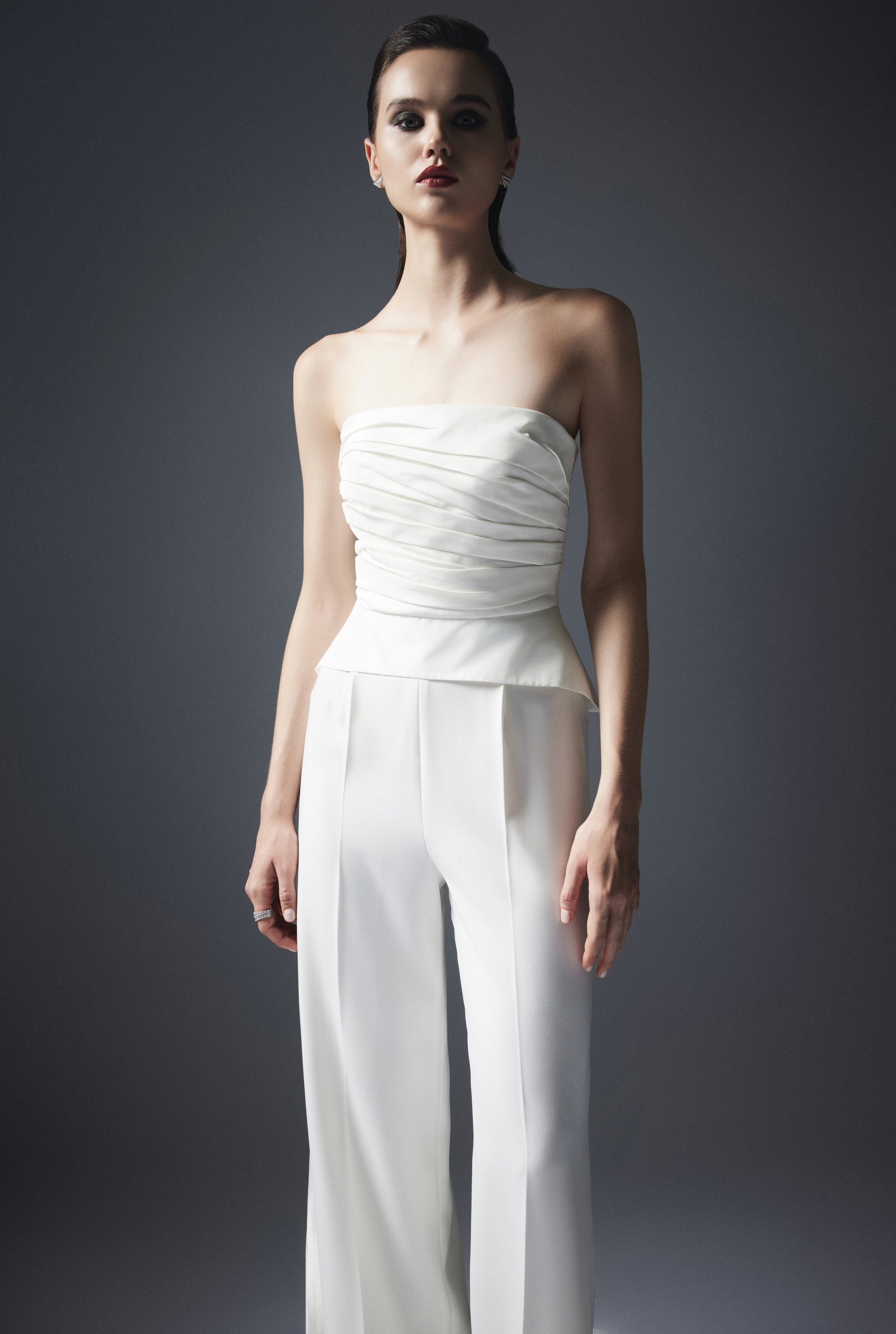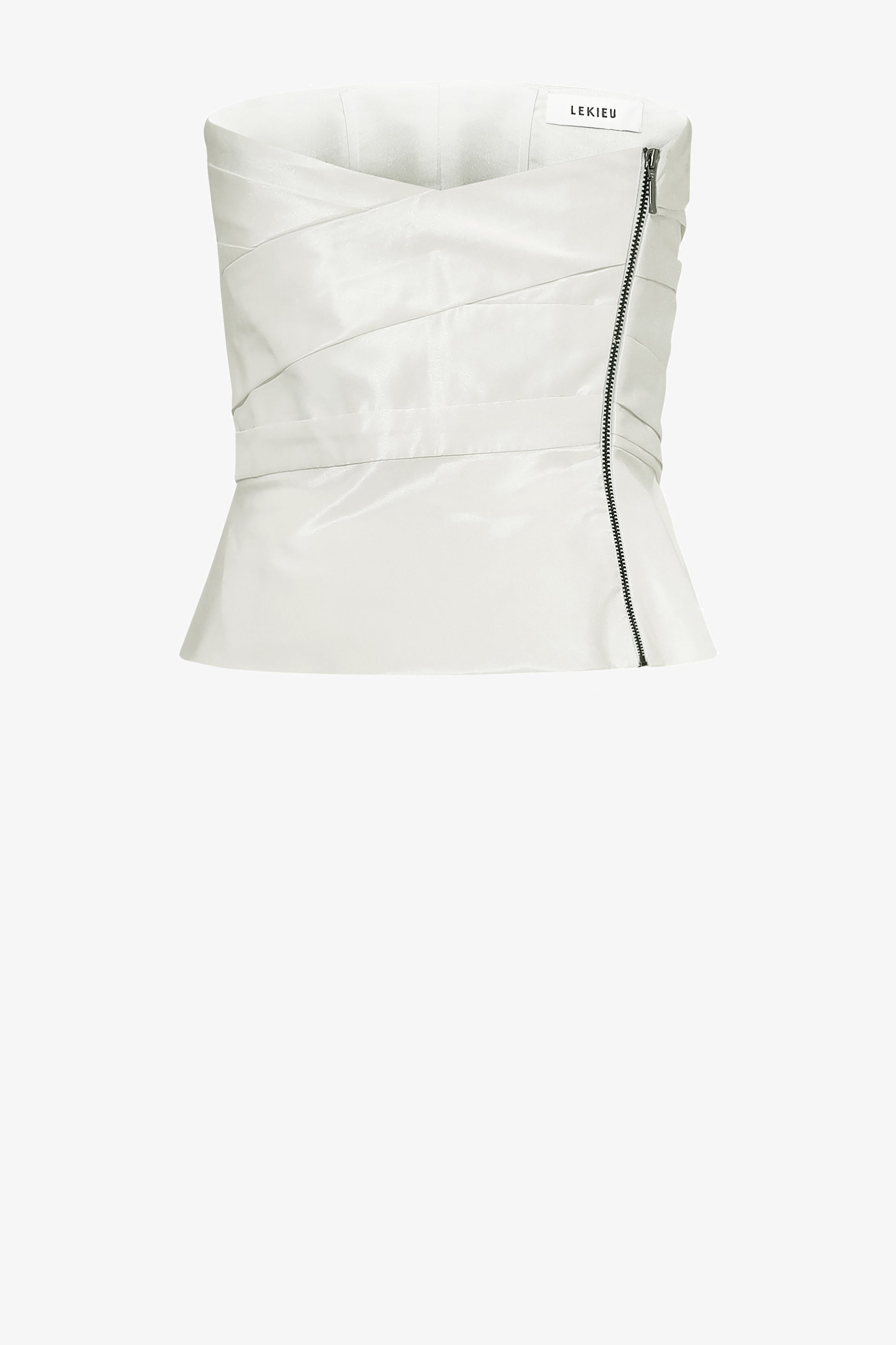 Strapless top: The front is decorated with pleats, and the hem is designed in a peplum style. The back features an asymmetrical metal zipper on the right side.