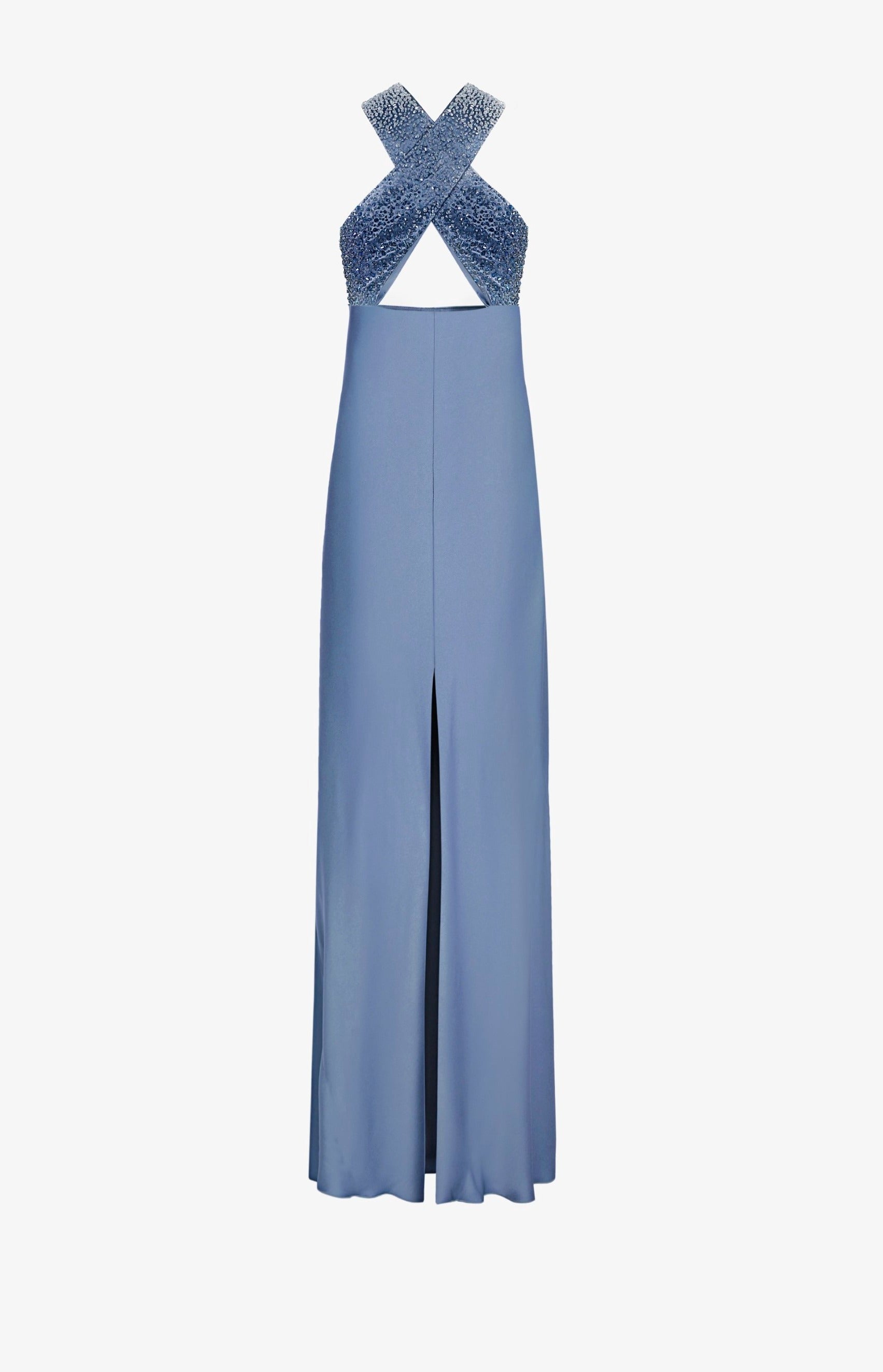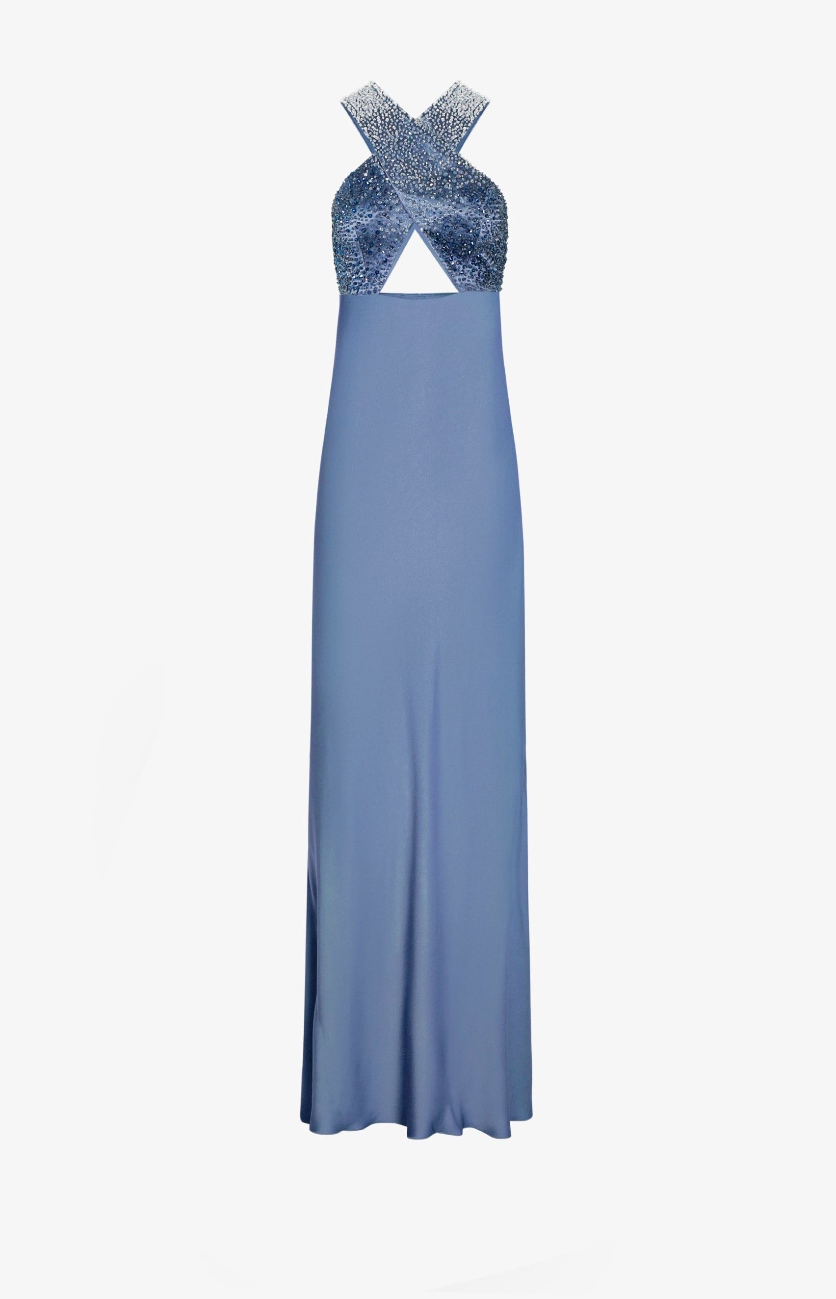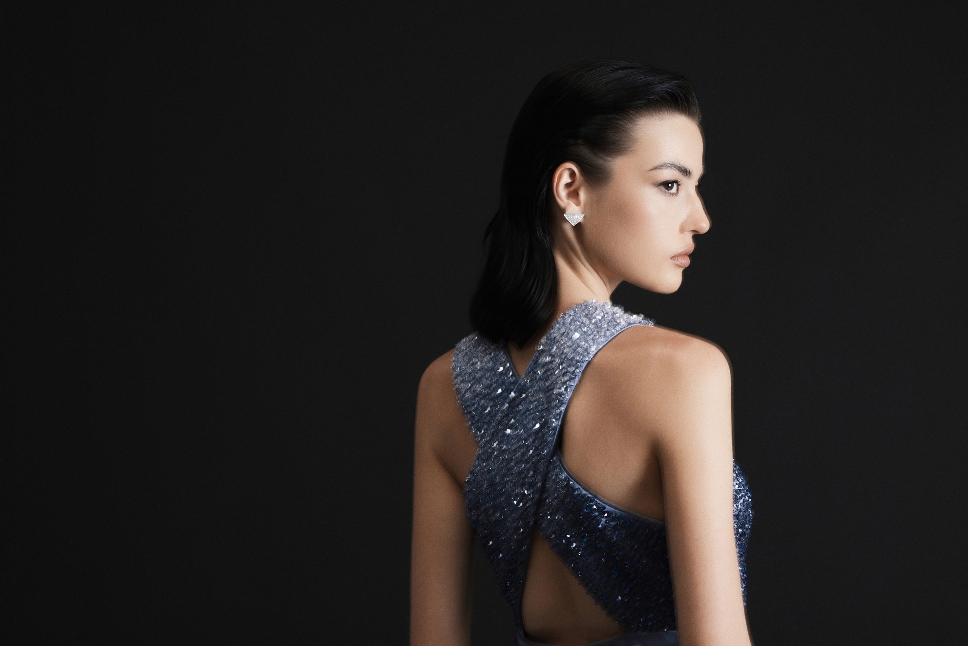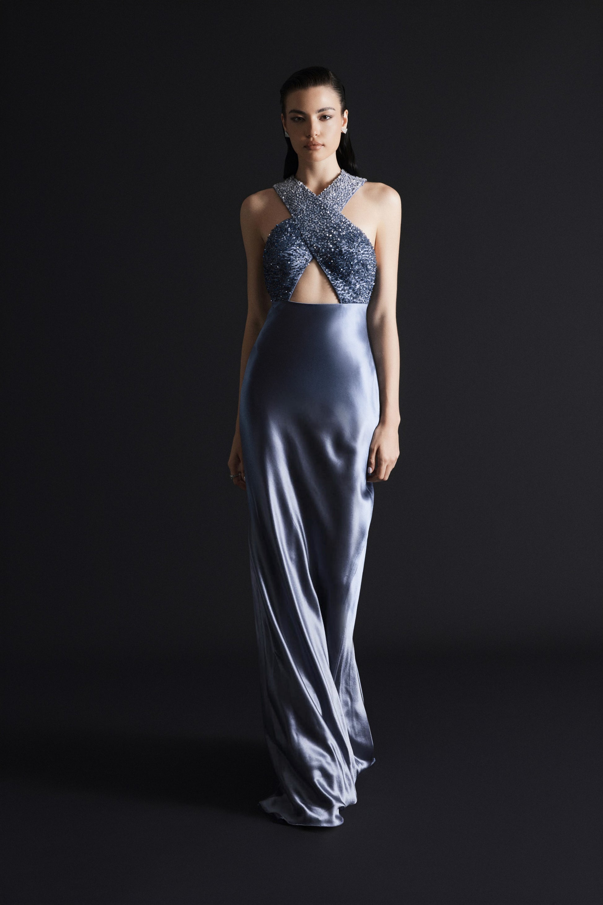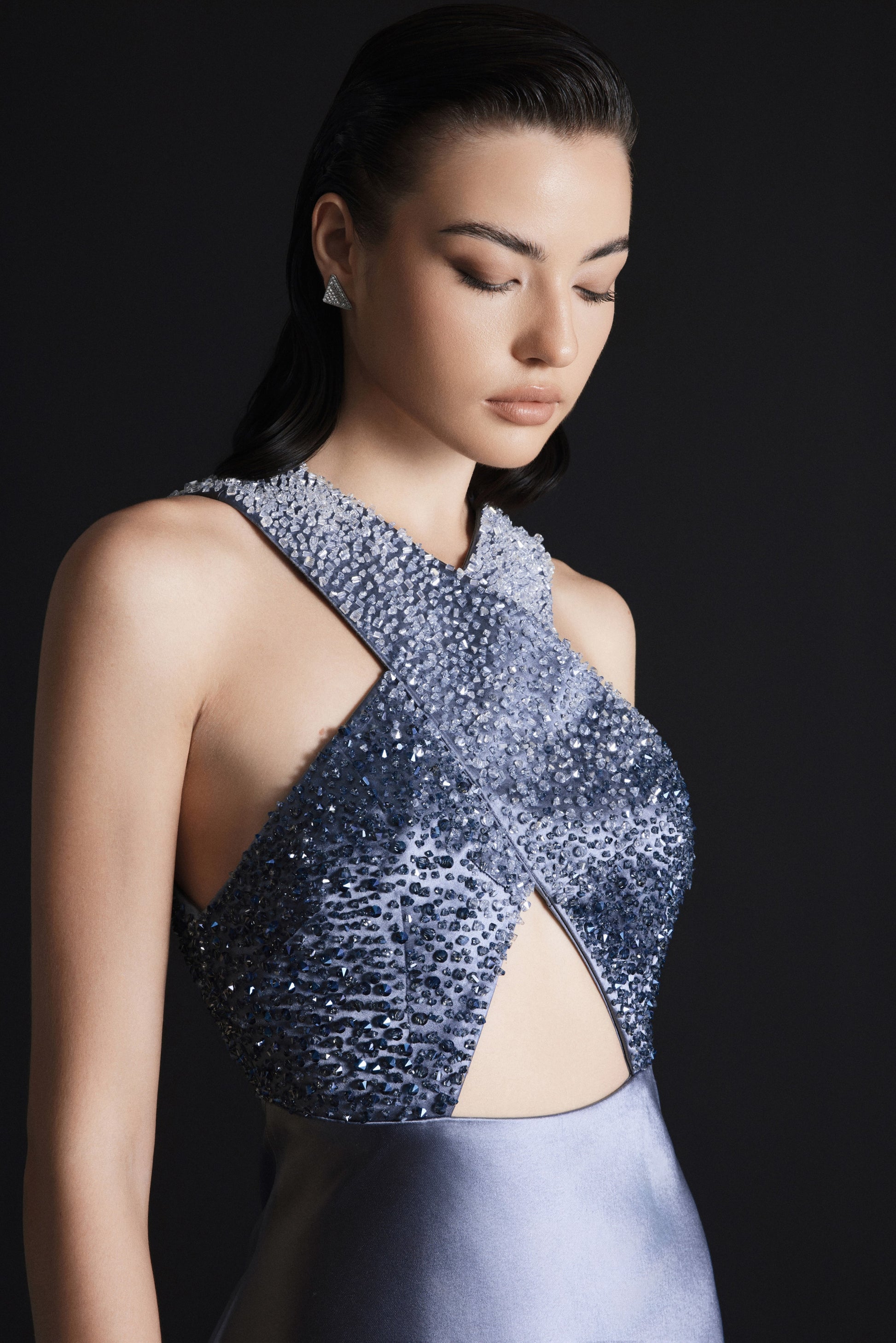 The upper bodice is adorned with high-end crystal and stone-setting technique to create a color transitions on both the front and back.