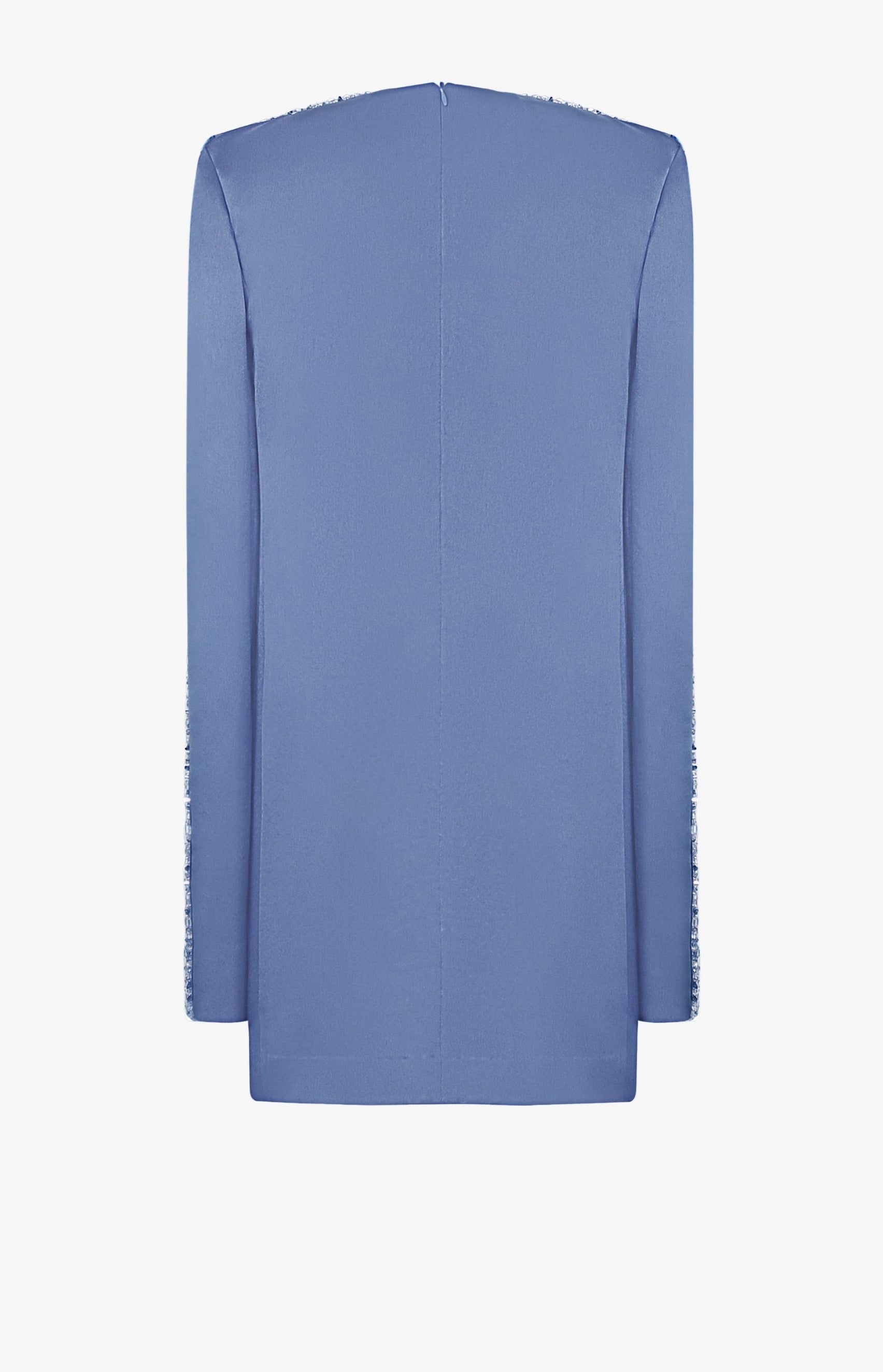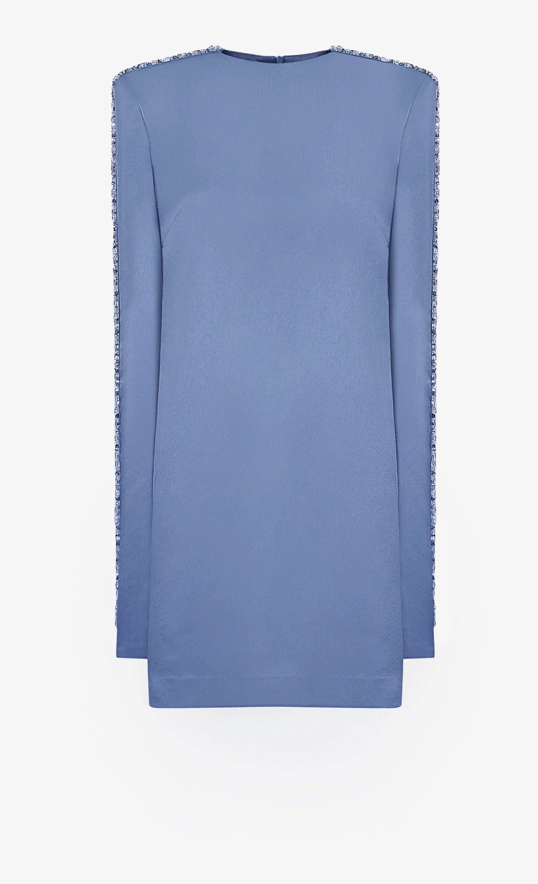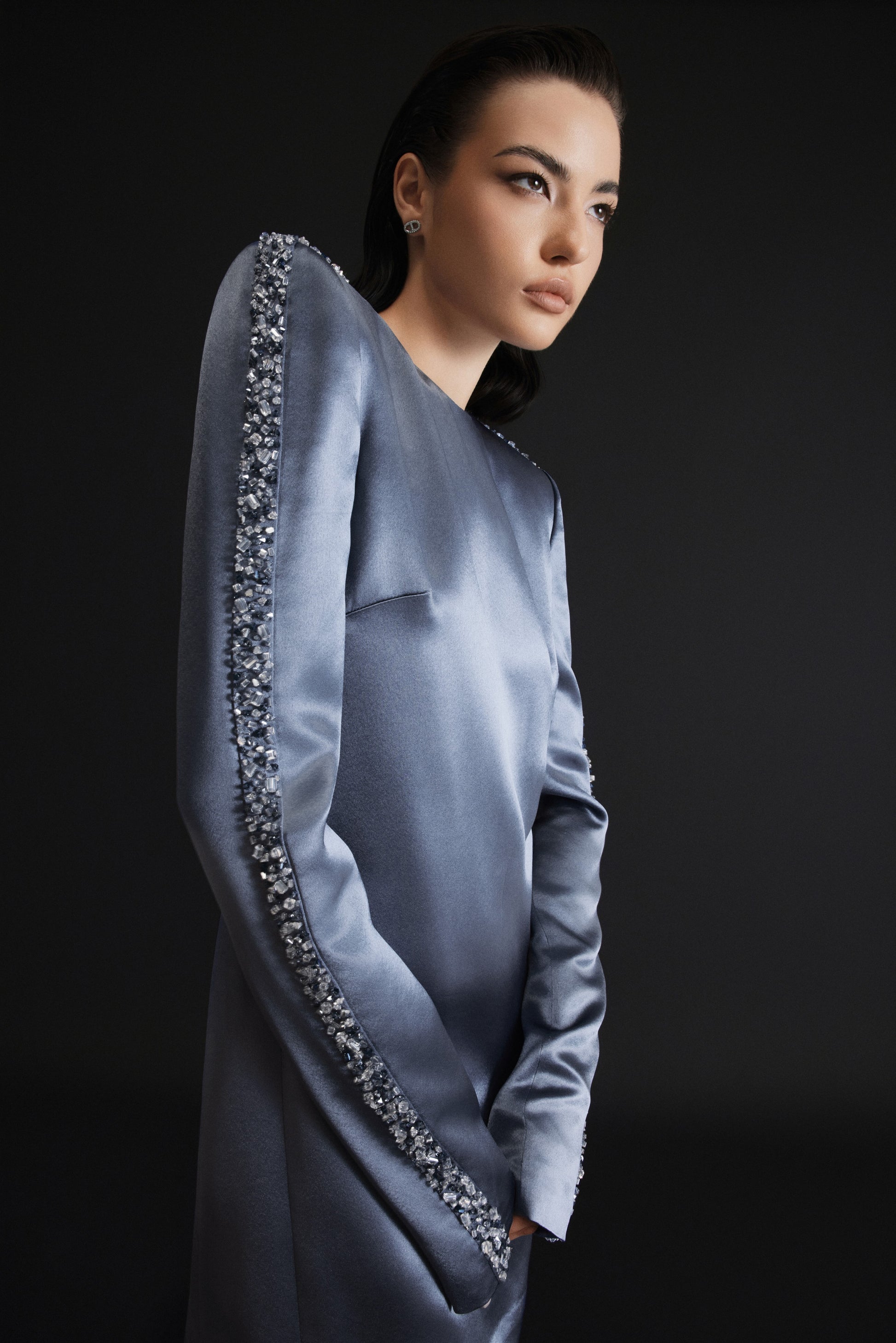 - The dress is adorned with high-end crystal and stone-setting technique on the strip that run from neckline to the cuff of the dress