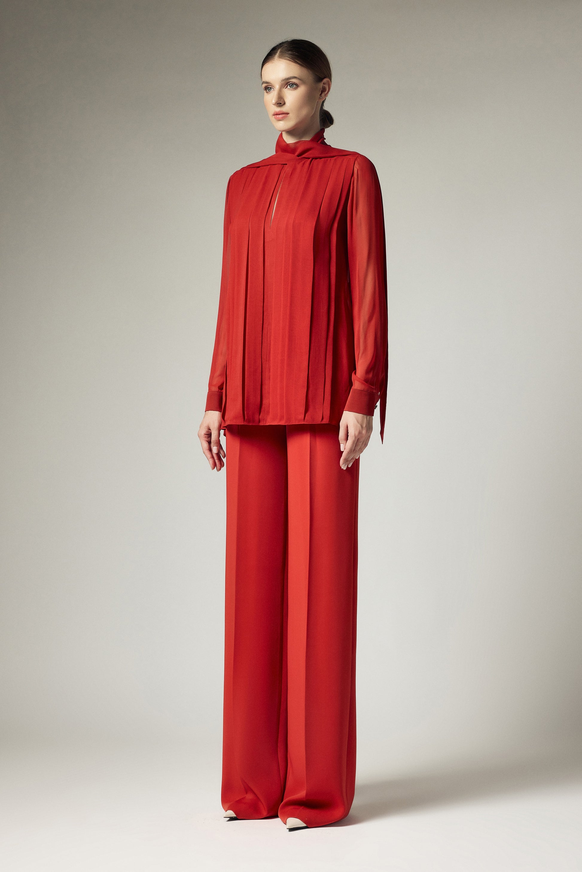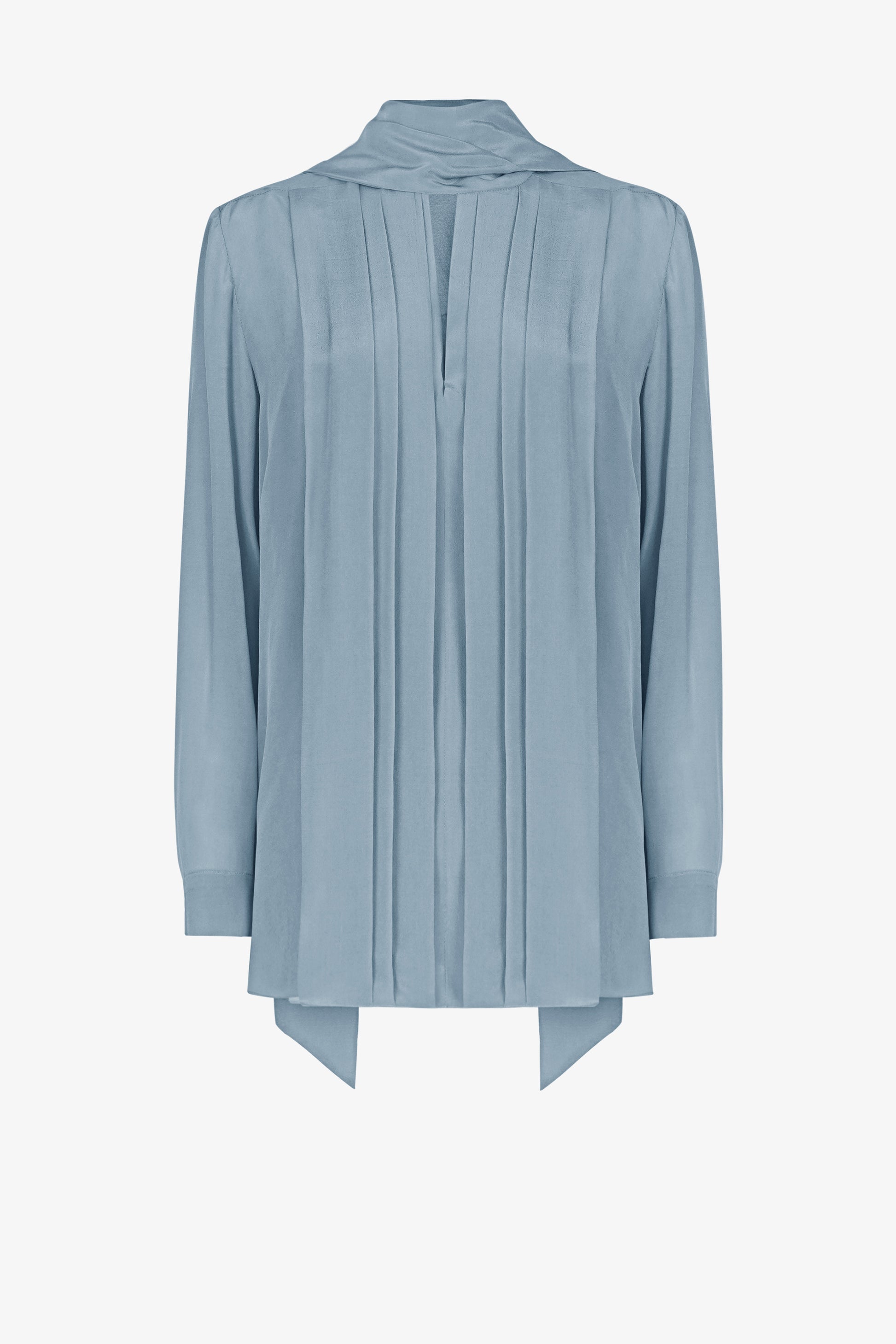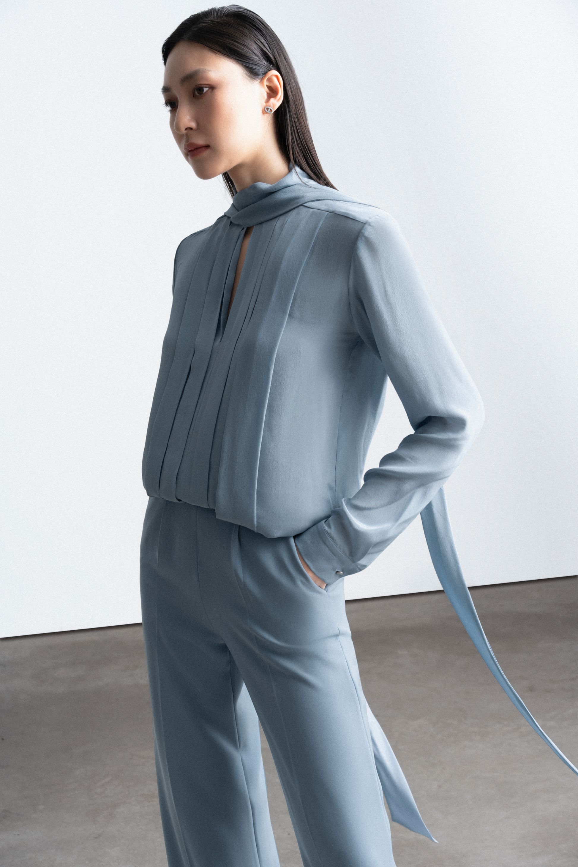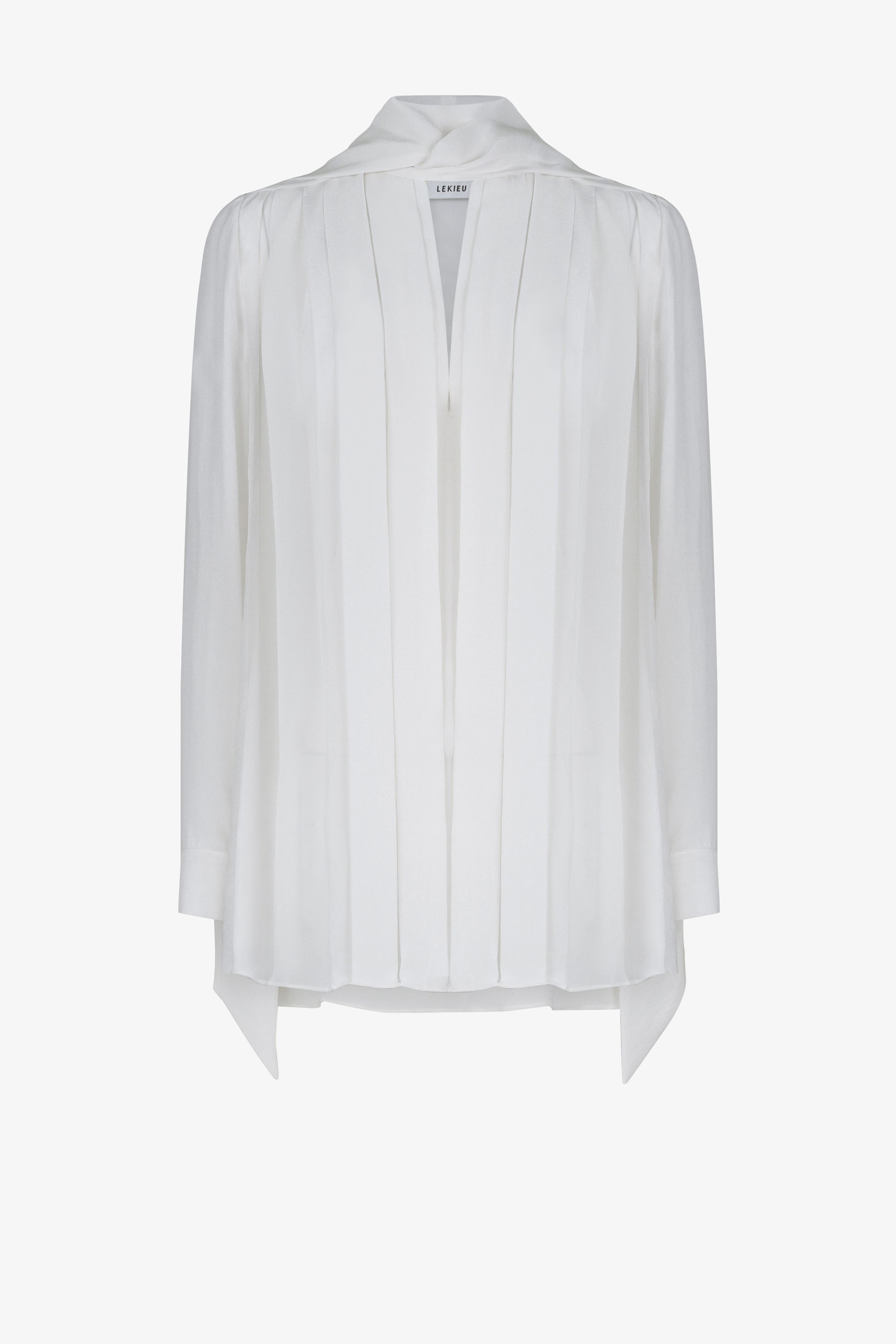This blouse features a square scarf strip, measuring 5cm in width, running horizontally across the shoulders. The entire front body is adorned with folded pleats, forming various straight lines from the shoulders down to the hem. These pleats come in varying sizes. The sleeves are of a kimono style, with a 5cm-wide cuff secured with a single button.