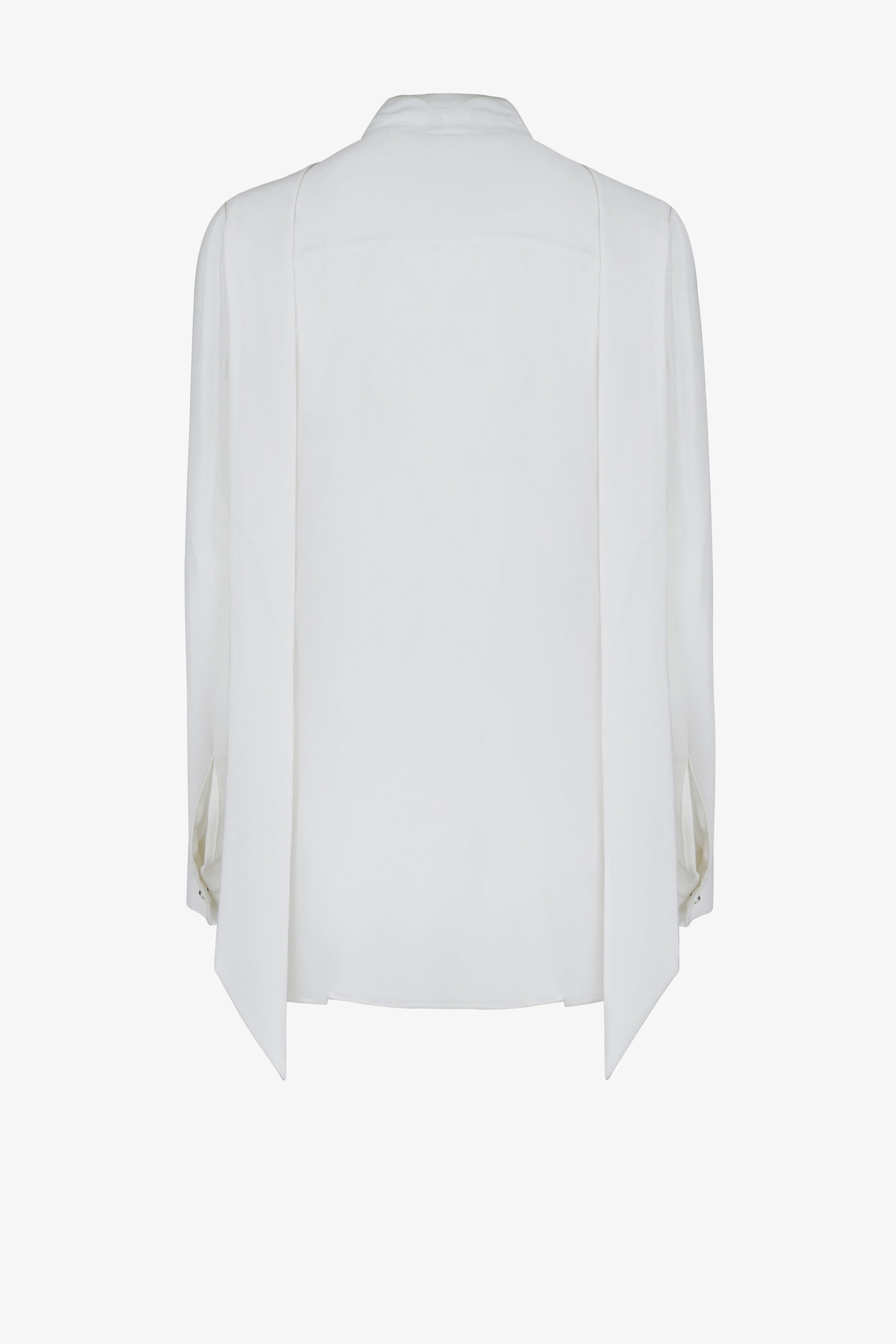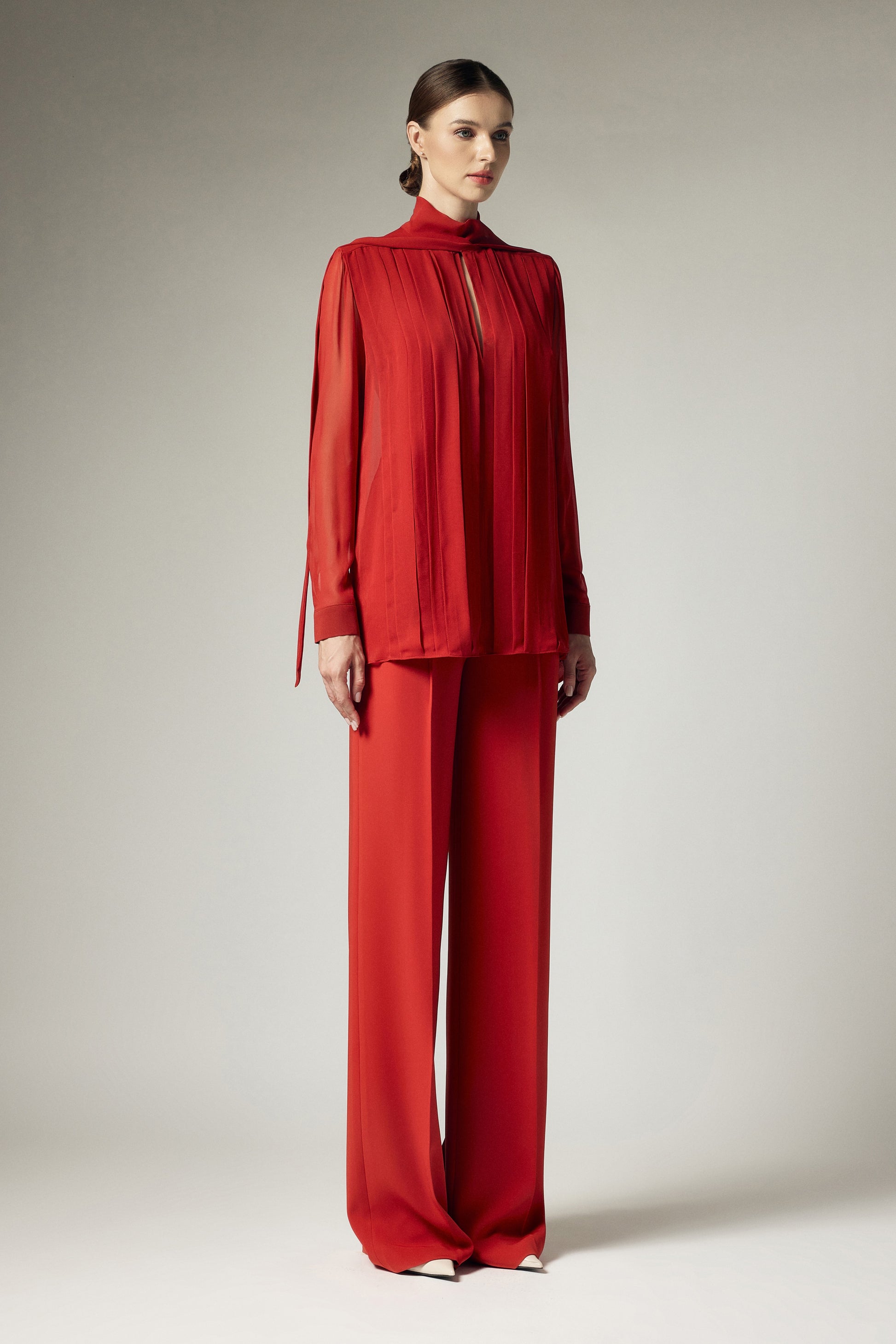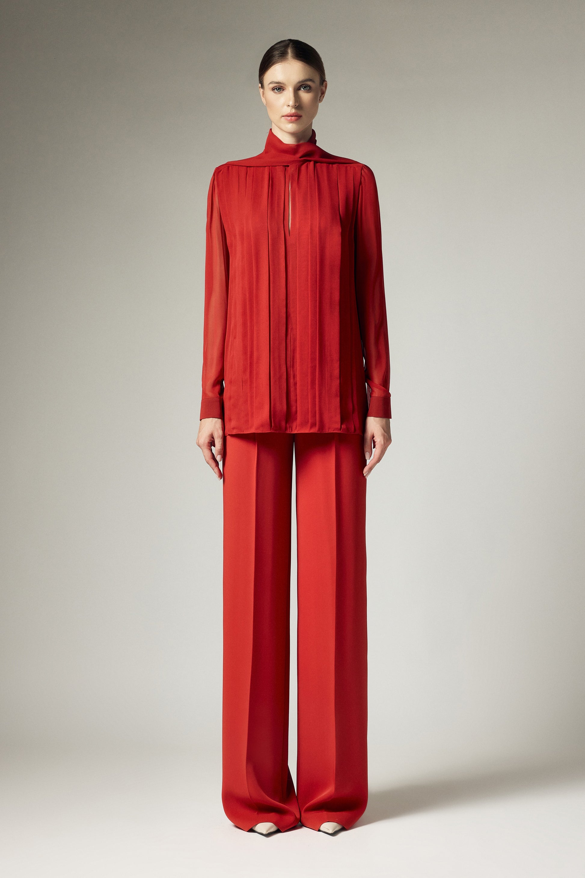 This blouse features a square scarf strip, measuring 5cm in width, running horizontally across the shoulders. The entire front body is adorned with folded pleats, forming various straight lines from the shoulders down to the hem. These pleats come in varying sizes. The sleeves are of a kimono style, with a 5cm-wide cuff secured with a single button.