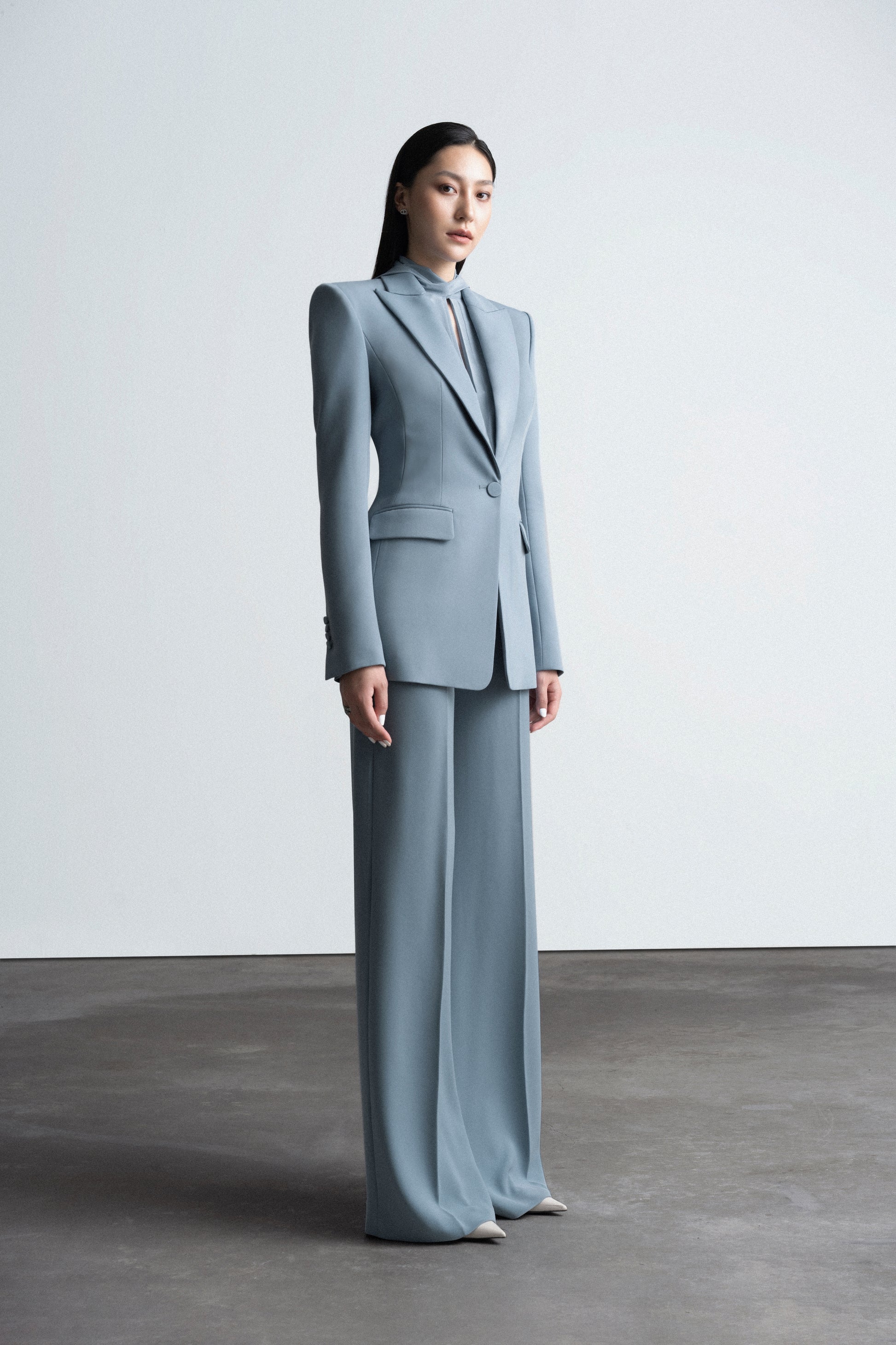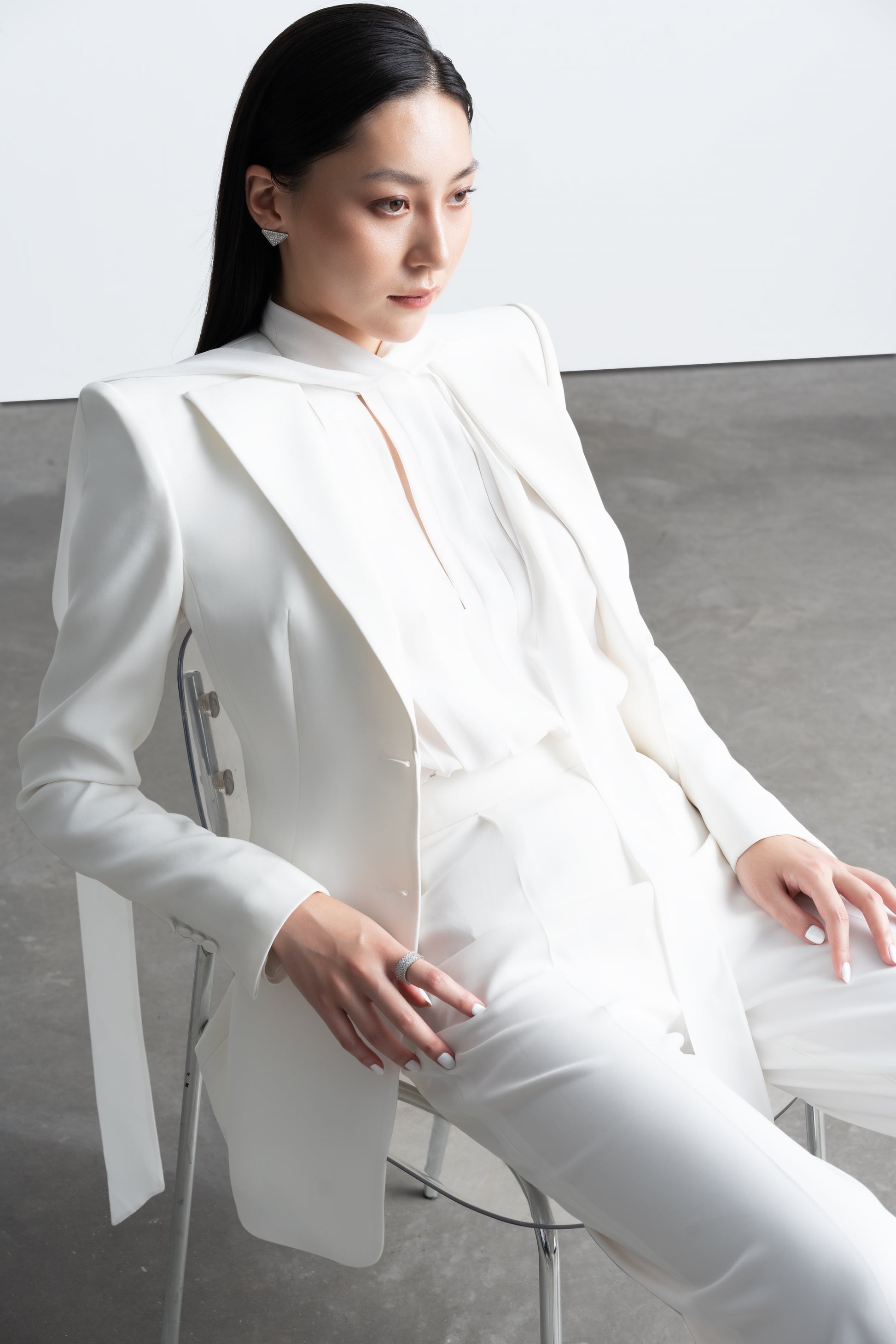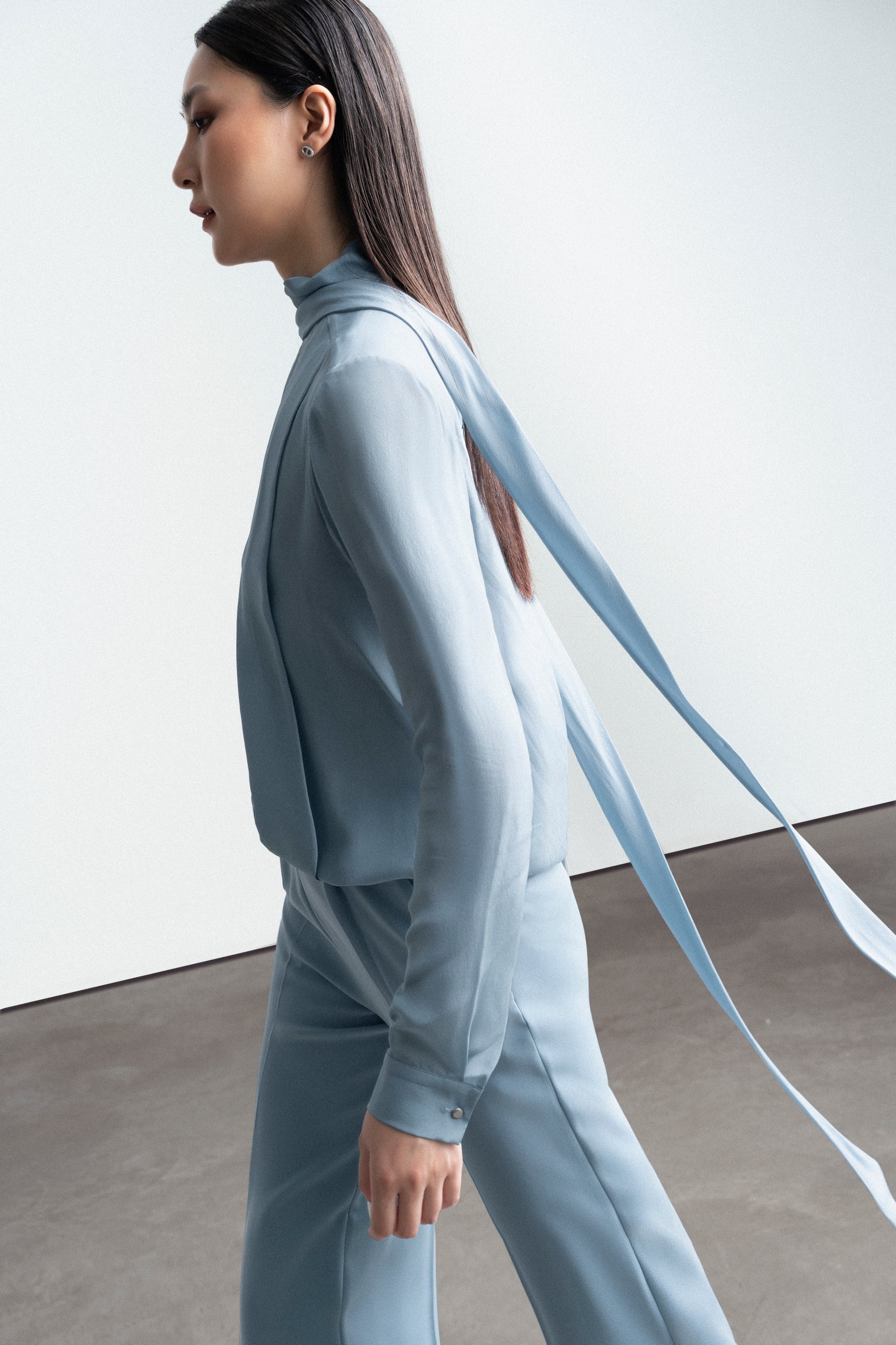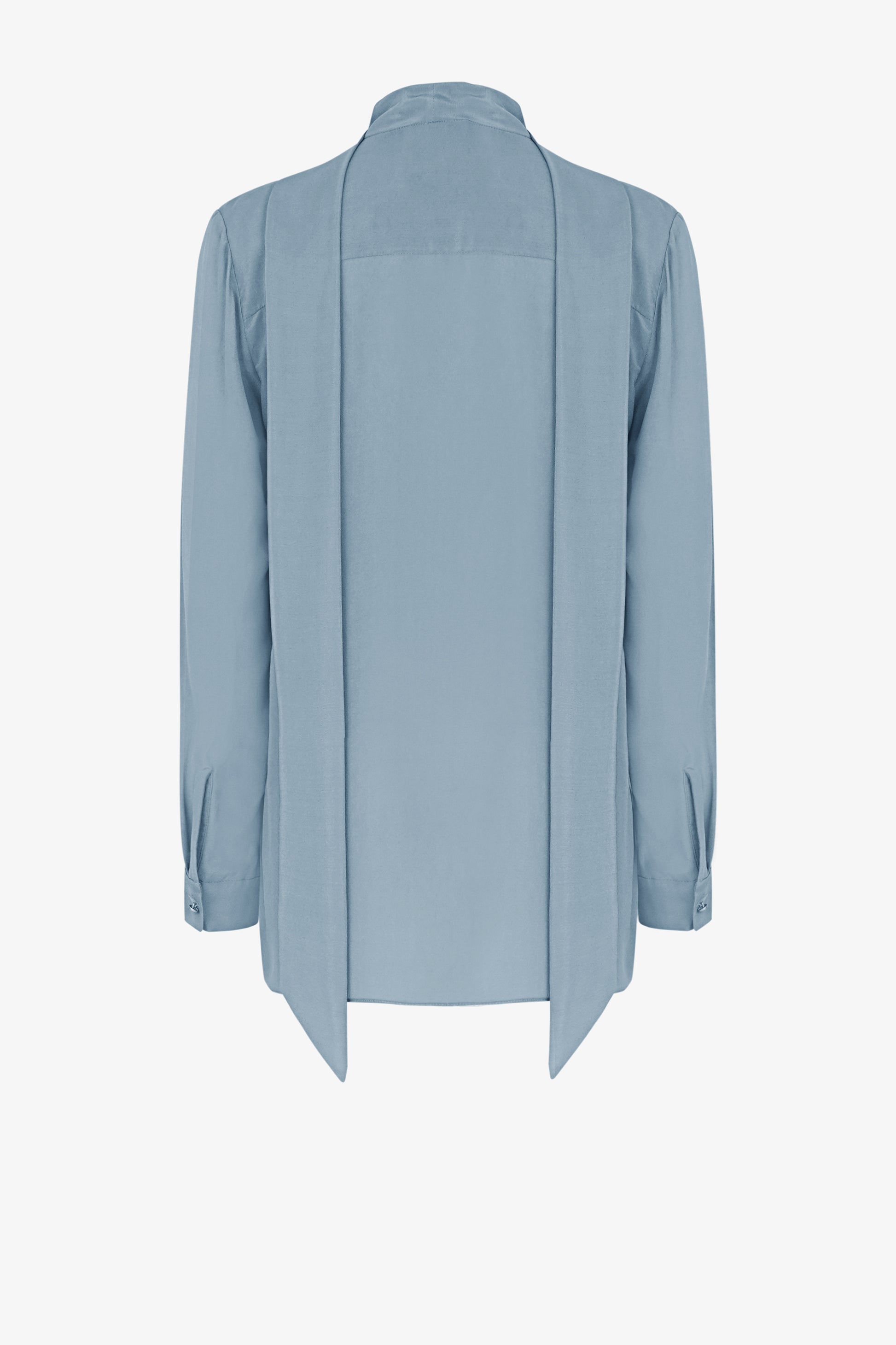 This blouse features a square scarf strip, measuring 5cm in width, running horizontally across the shoulders. The entire front body is adorned with folded pleats, forming various straight lines from the shoulders down to the hem. These pleats come in varying sizes. The sleeves are of a kimono style, with a 5cm-wide cuff secured with a single button.