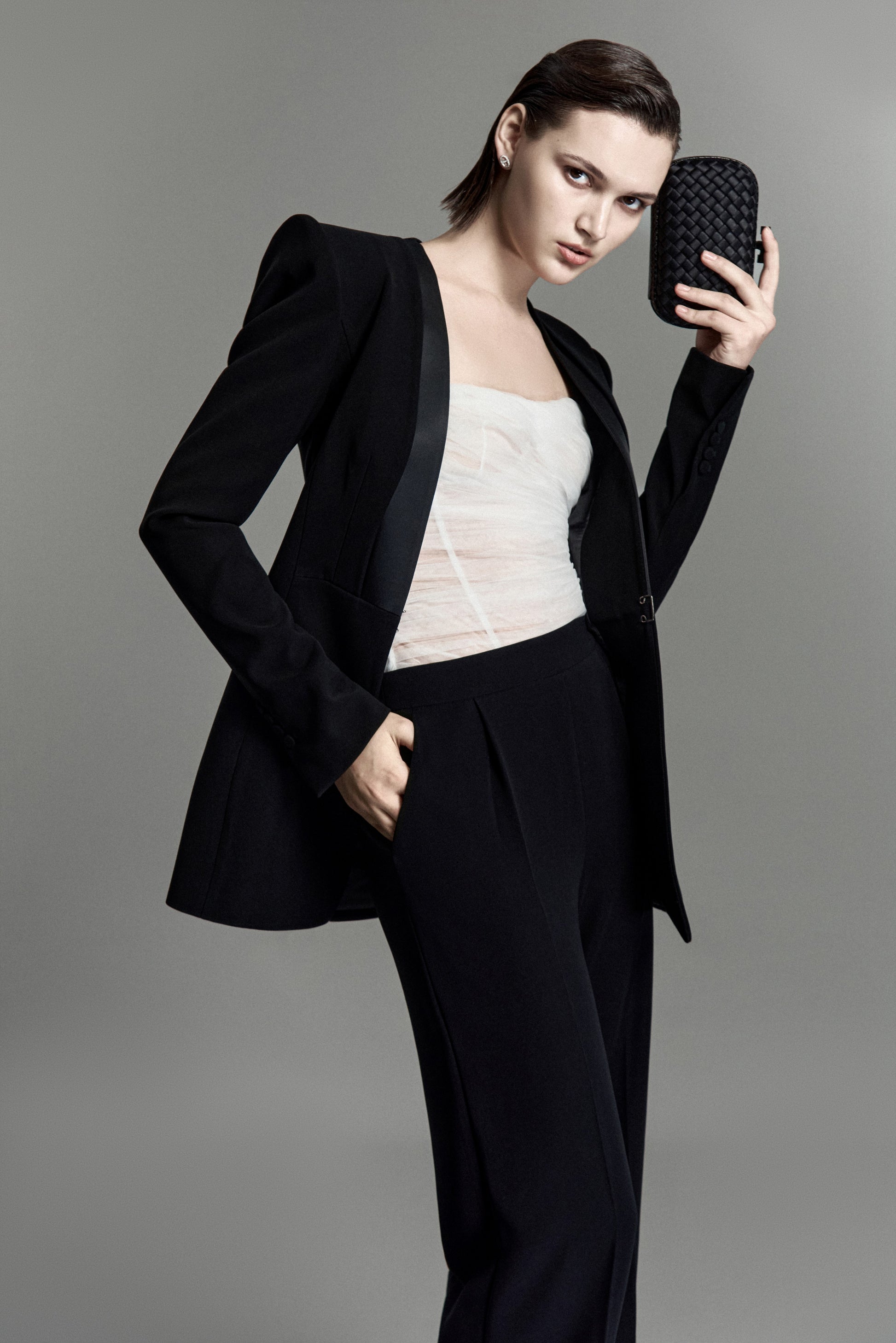 Fitted vest with internal hook fastening that allows the front panels to meet cleanly. The neckline is reworked with a satin-covered facing, creating a deeper V shape. Straight shoulders are structured with 3.5 cm shoulder pads. The back features a center seam and two additional shaping seams for a contoured fit. The sleeves are two-piece with four fabric-covered buttons. Finished with angled front hems and two slanted flap welt pockets.